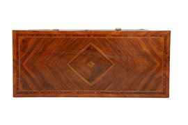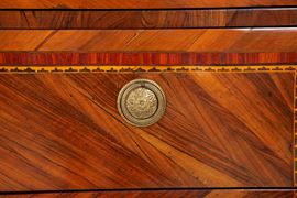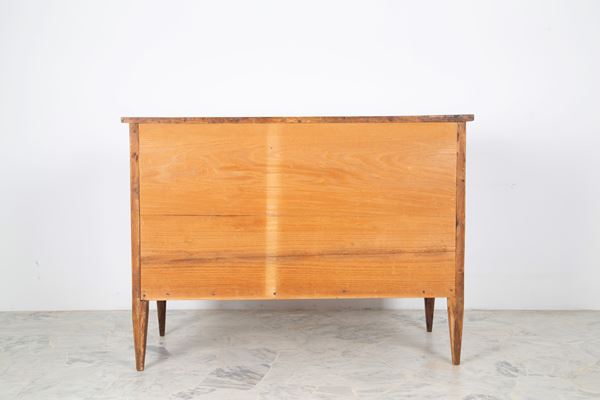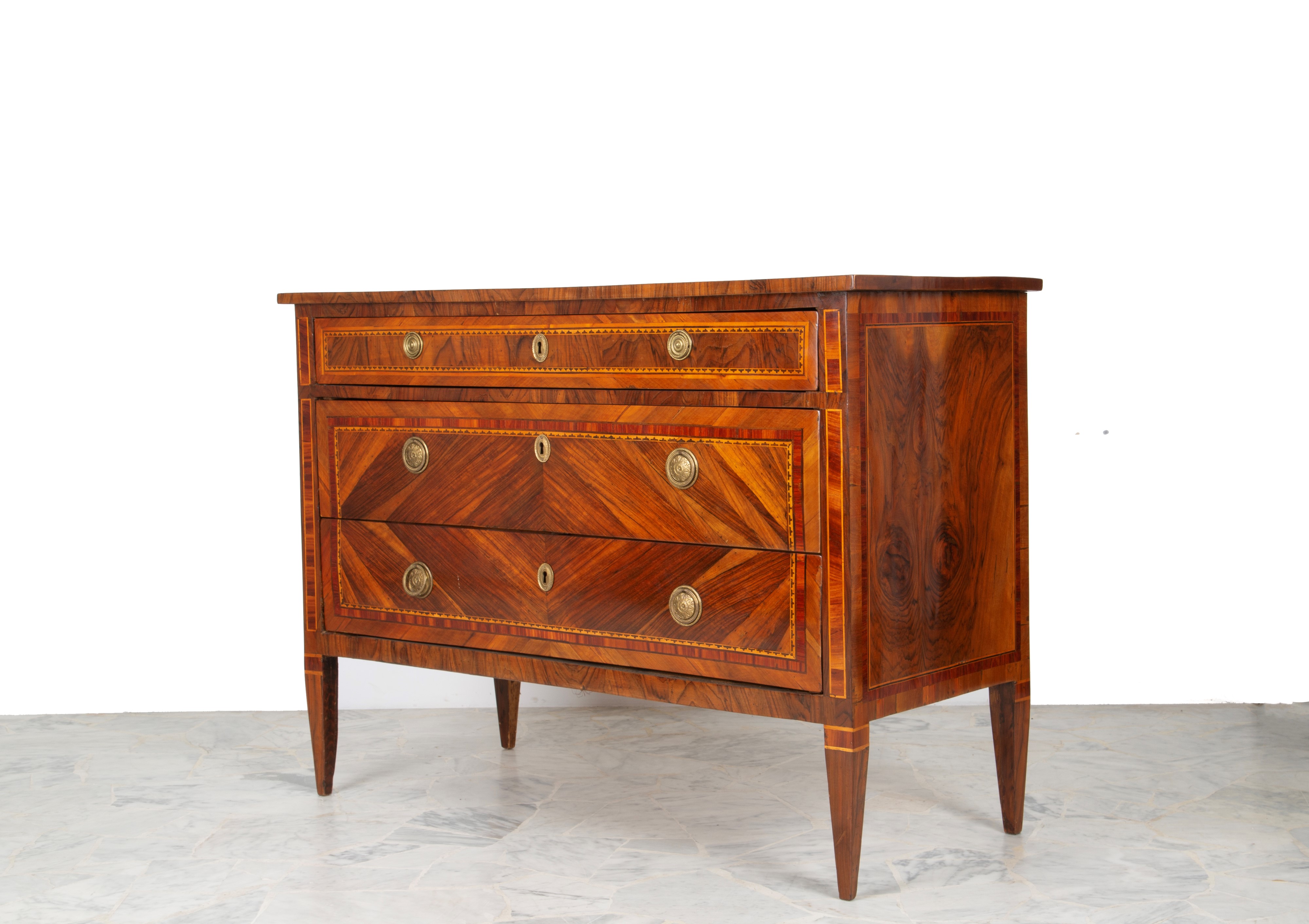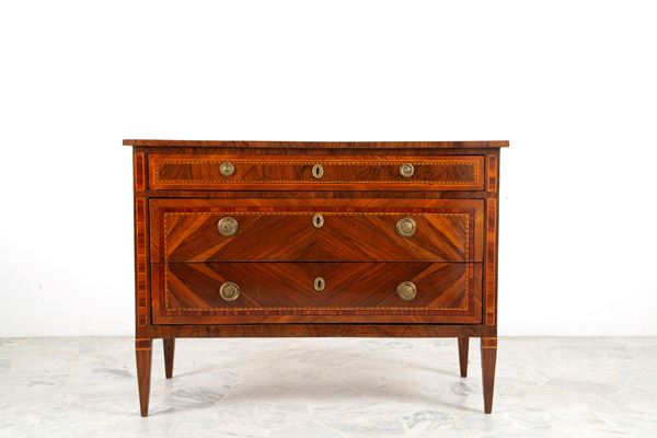 Louis XVI chest of drawers, veneered and trimmed in various woods, with three drawers and pyramidal legs. Late 18th-early 19th century. Minor defects. The back is not contemporary.