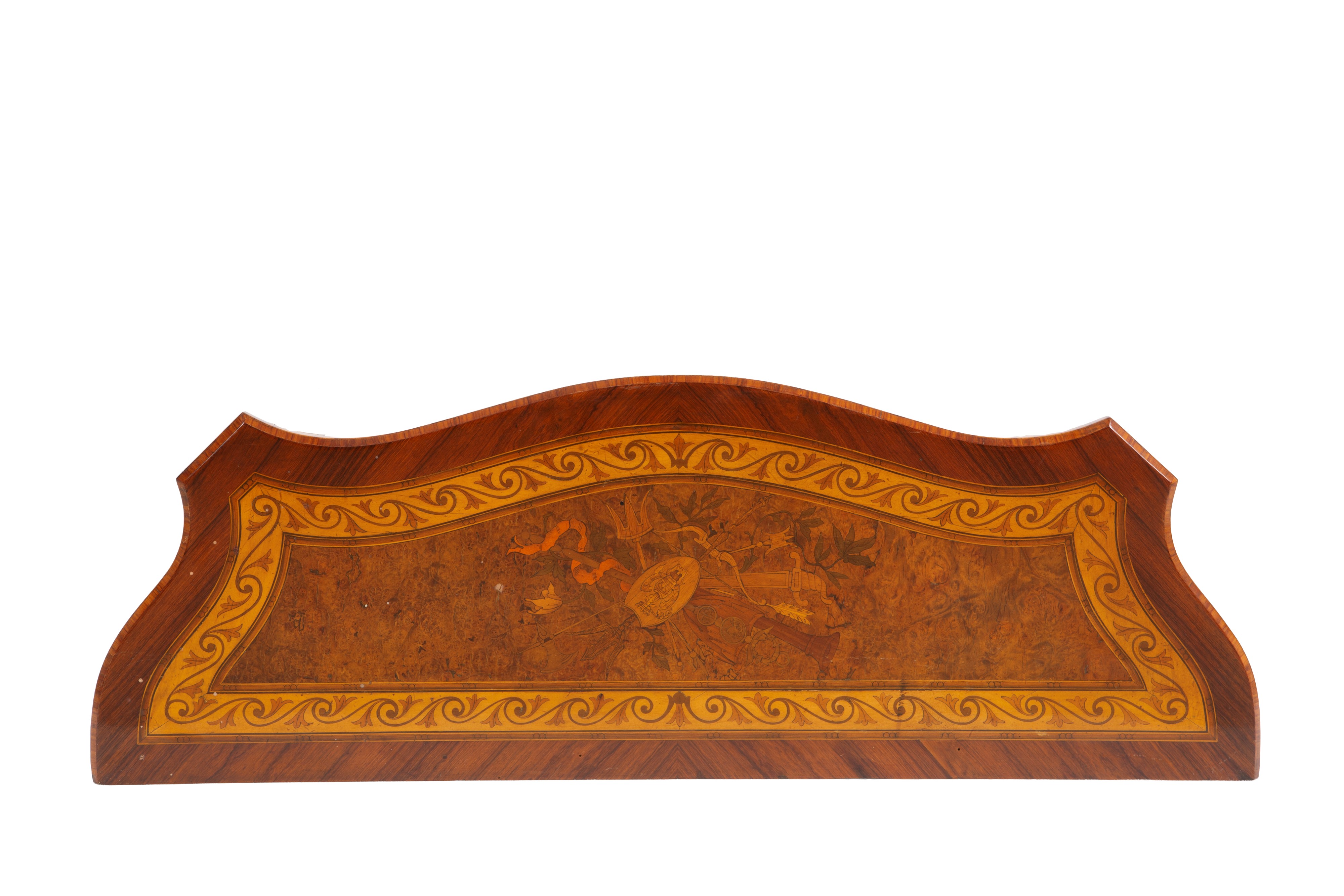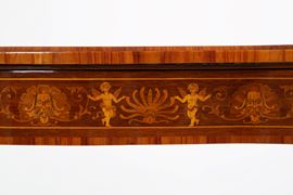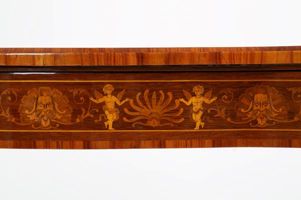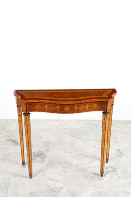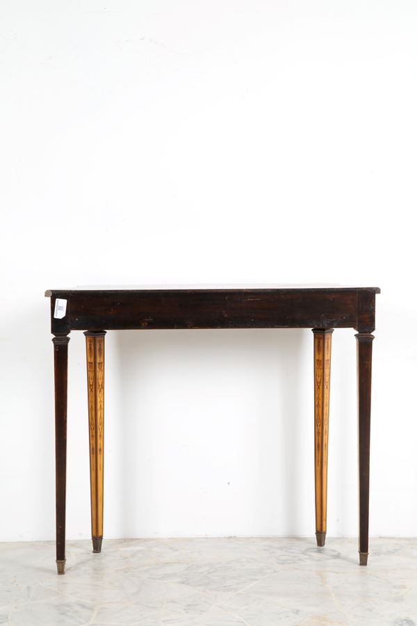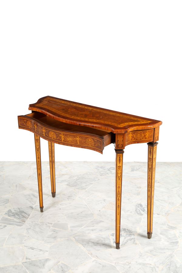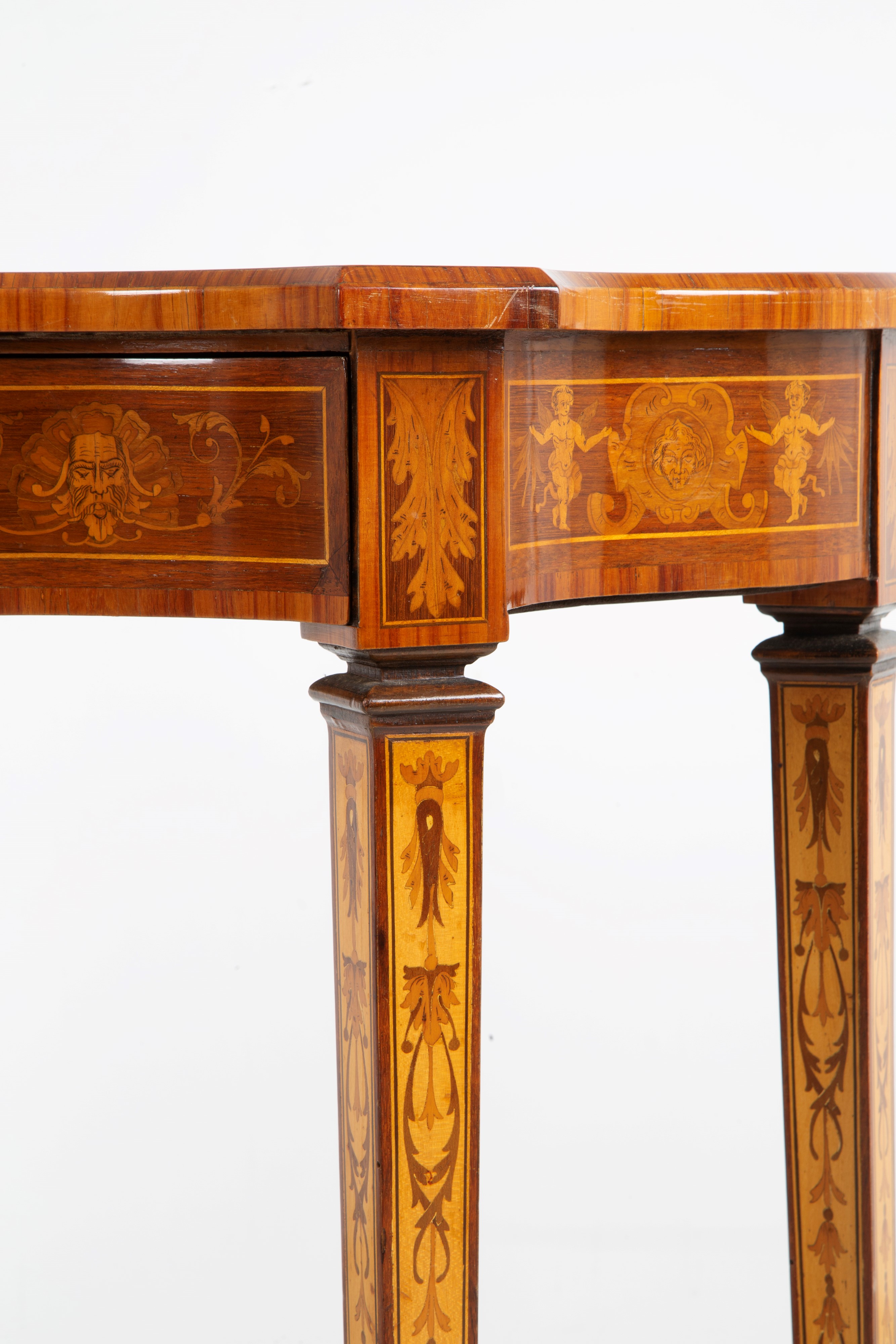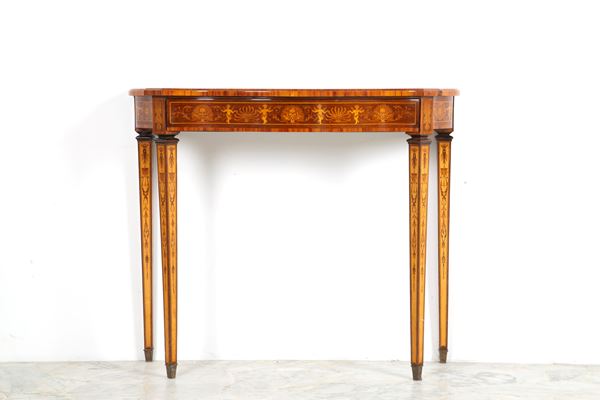 Console table veneered and inlaid in various woods with grotesque motifs on the legs and decorations on the shaped top. Pyramidal legs with brass tips and a drawer on the side. Louis XVI style. Early 20th century. Minor defects.