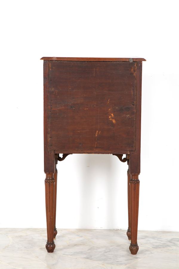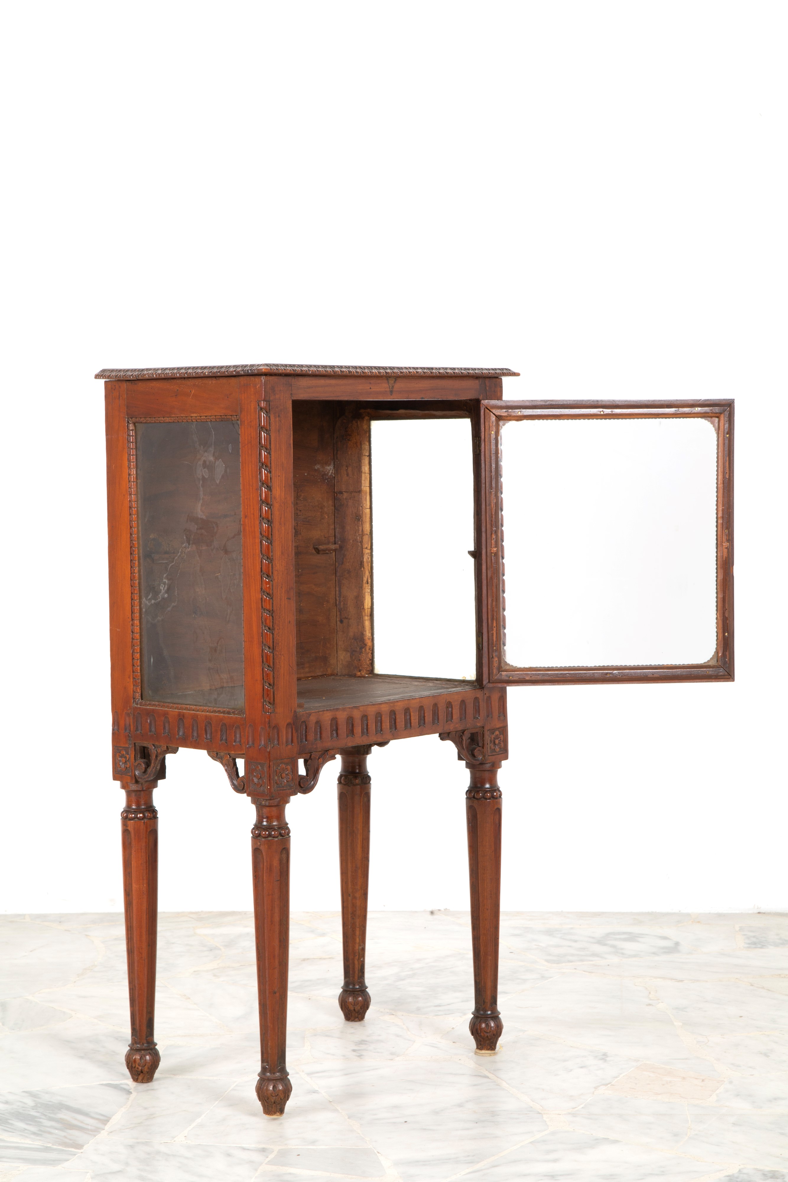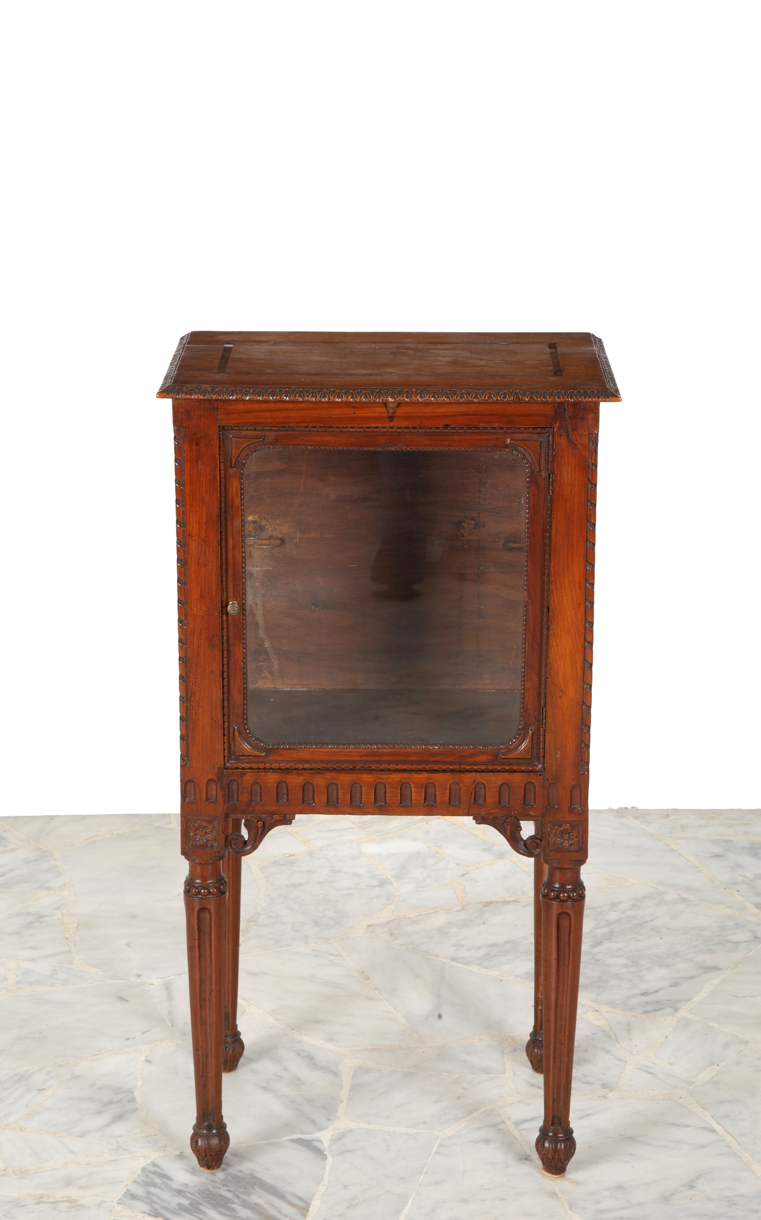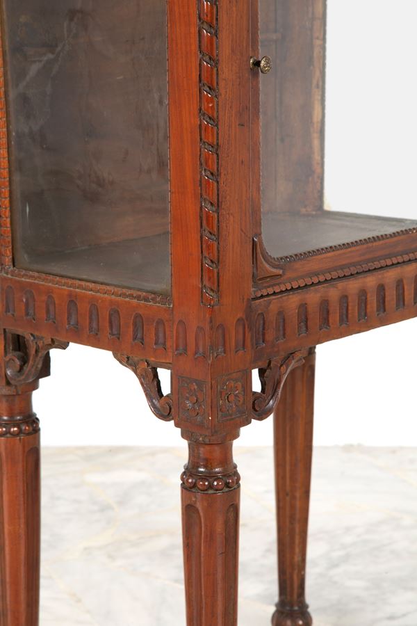 Carved and threaded walnut display cabinet with fluted legs. Veneto. Early 19th century.