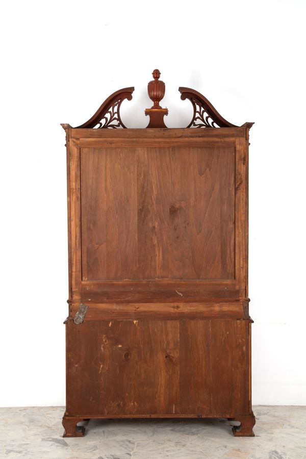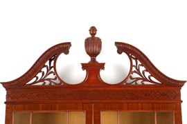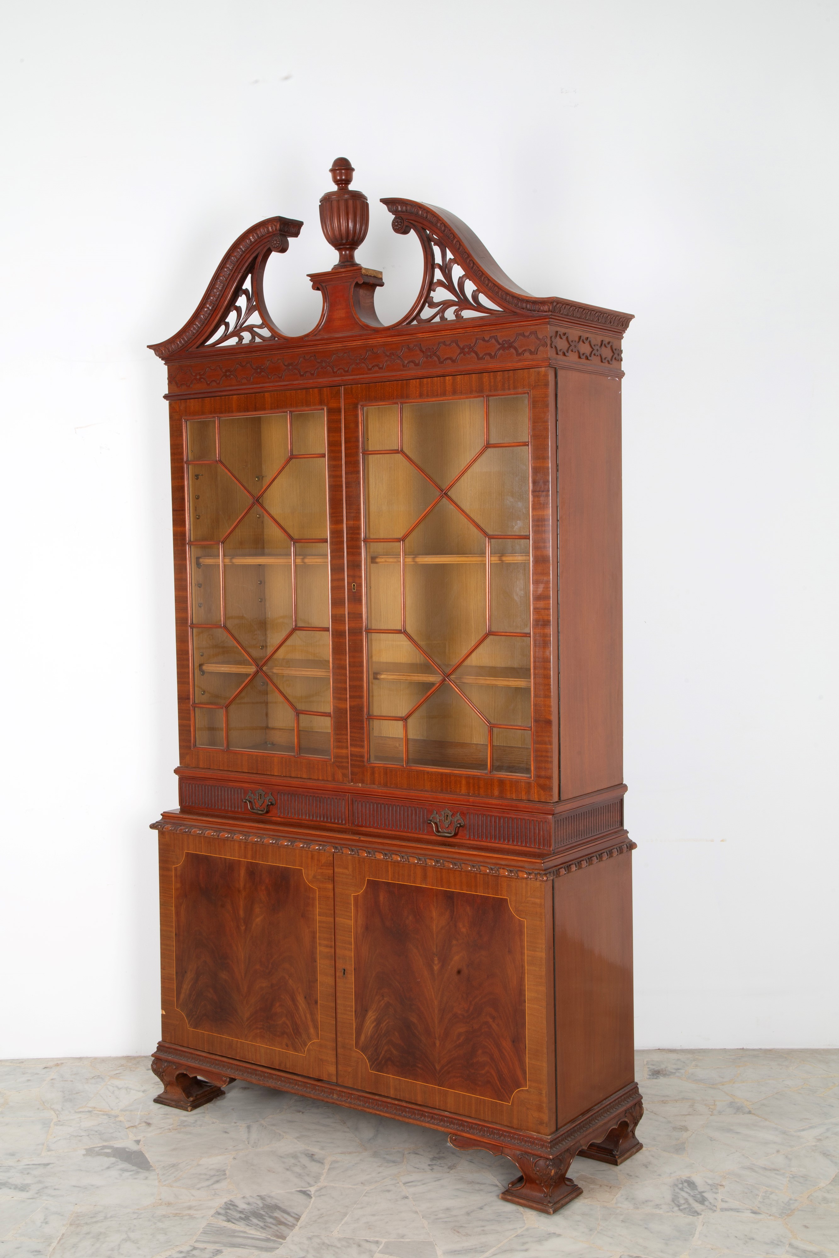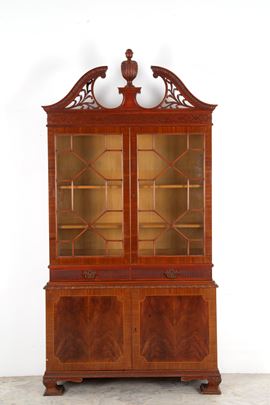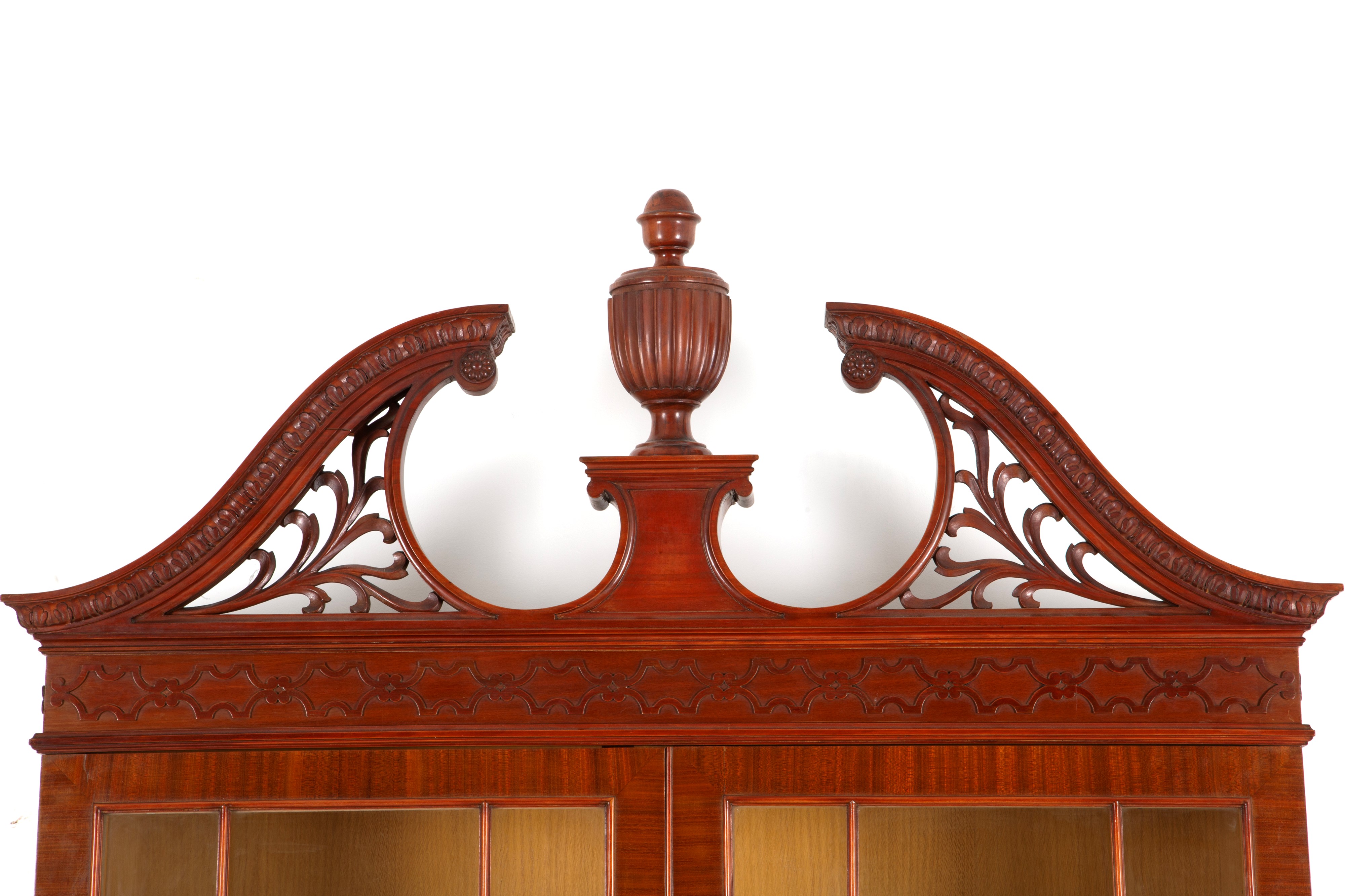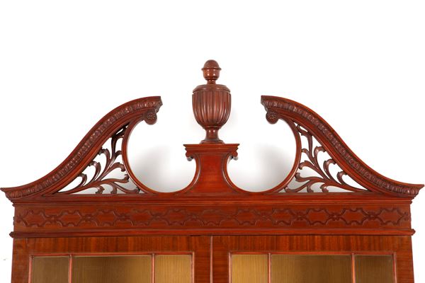 Mahogany four-door display cabinet with two drawers on the side and a pierced cornice with a vase-shaped finial. England. Late 19th century. Minor defects.