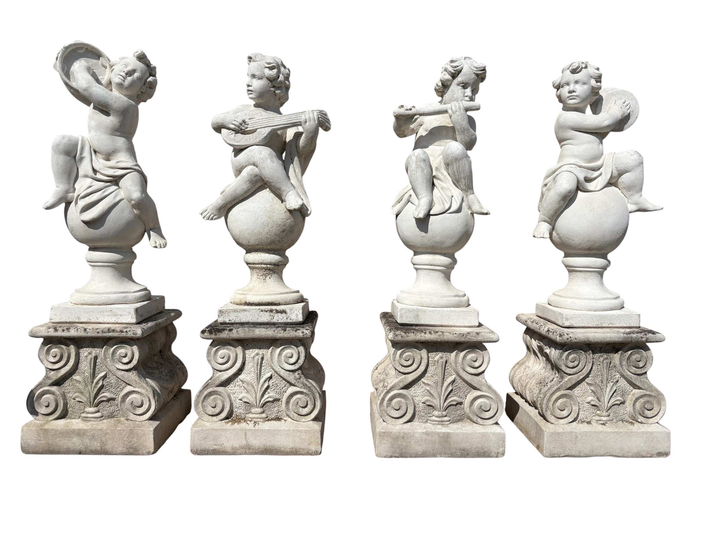 Four agglomerate stone sculptures depicting "SEASONS" on bases.