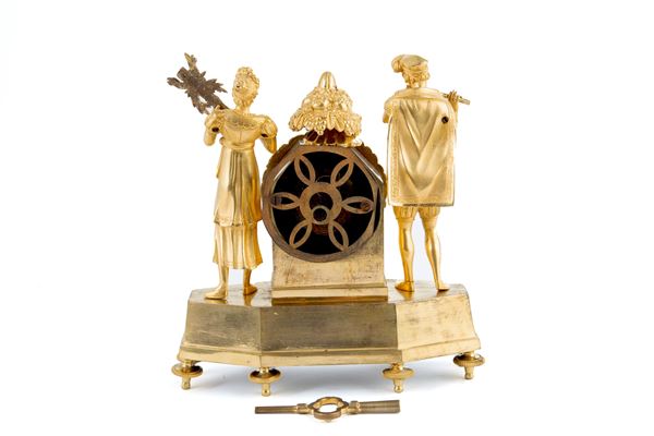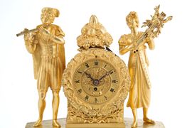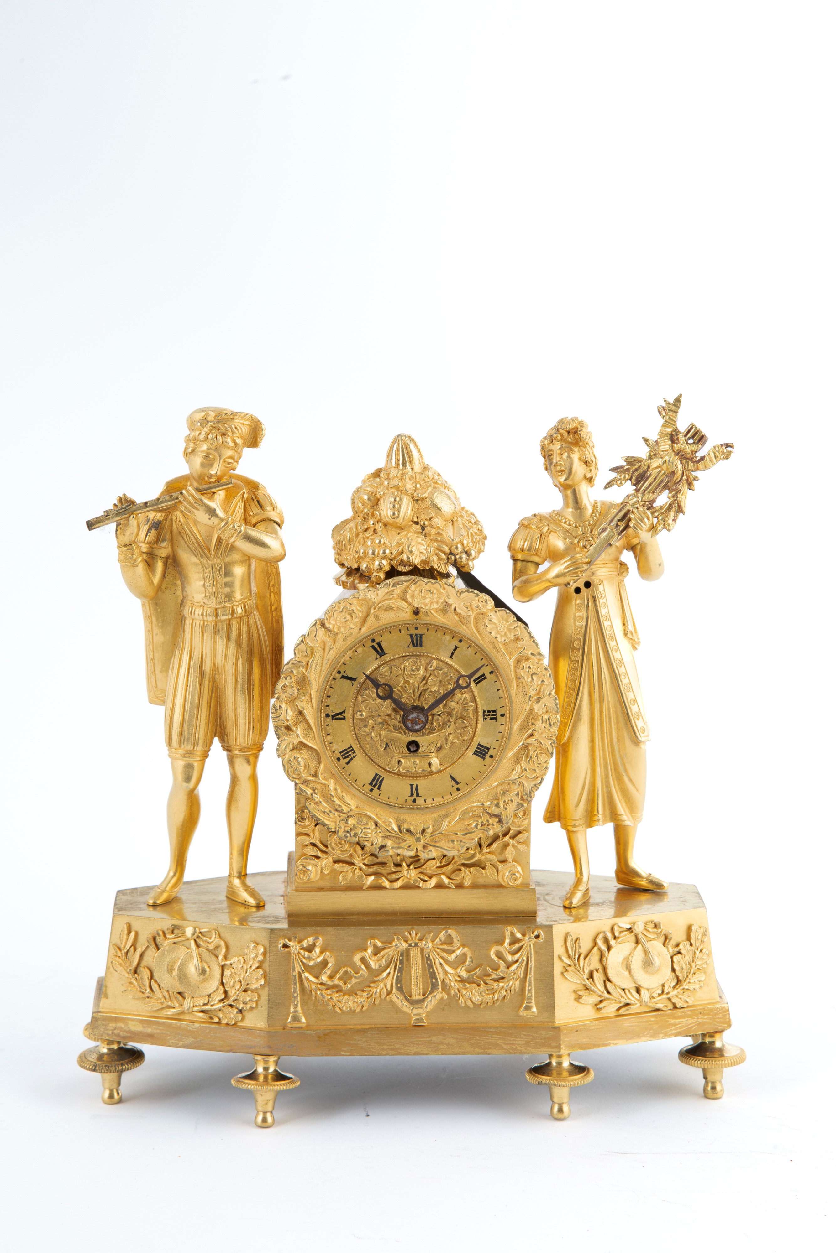 Finely chiseled and gilded bronze clock with a musician and a female figure on the sides. Dial with Roman numerals. Empire period. Missing pendulum.