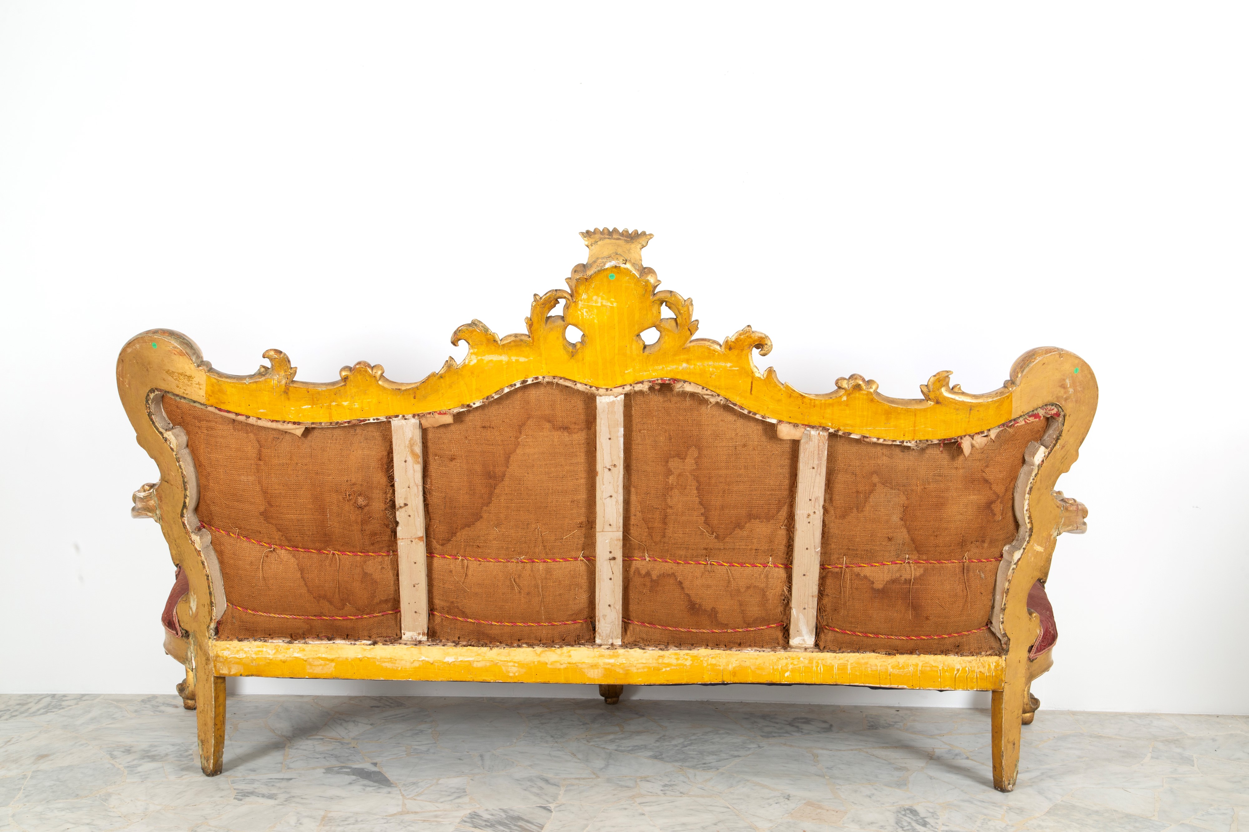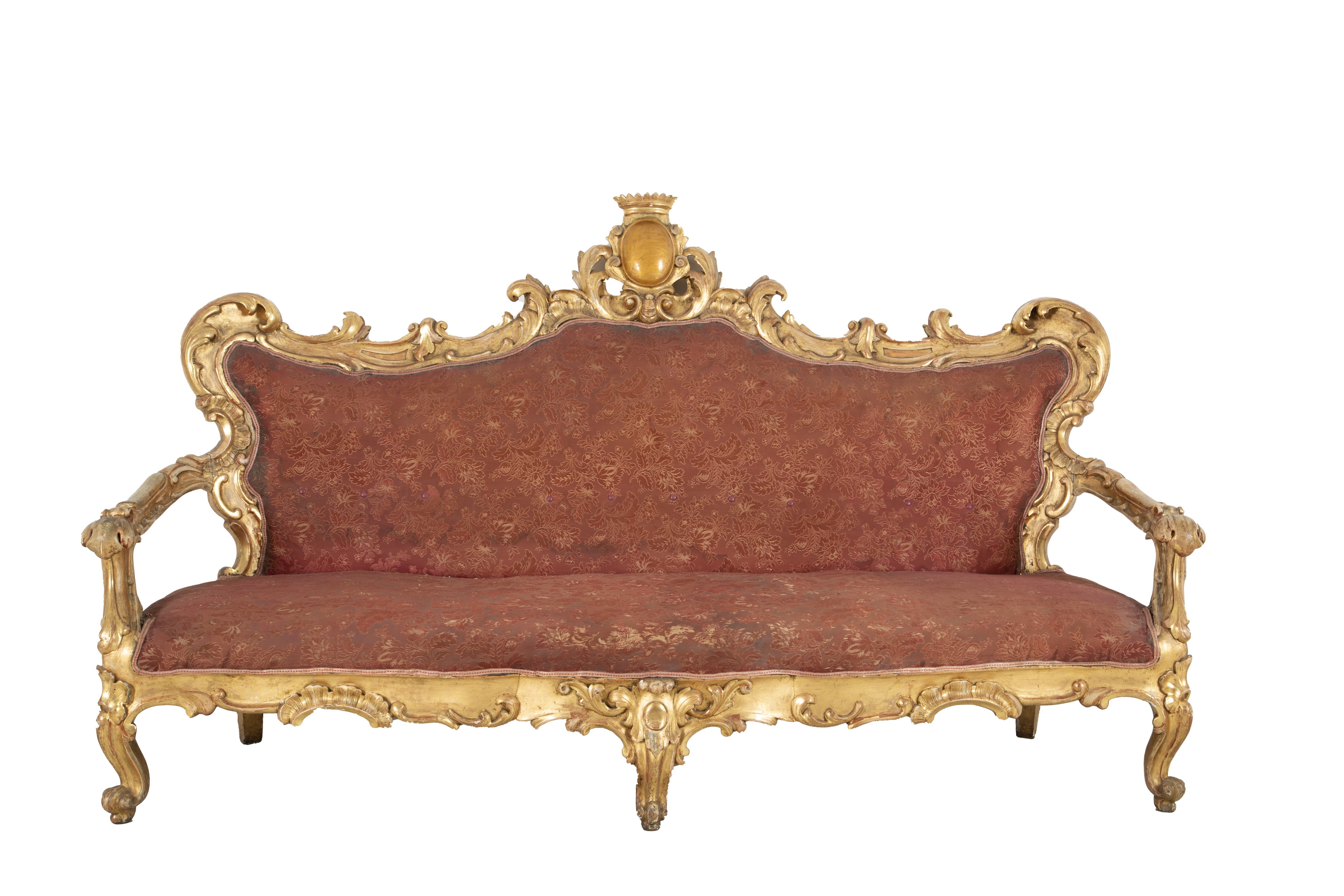 Carved and gilded wooden sofa with a crowned coat of arms on the friezes. Central Italy. 19th century. Defects and missing parts.