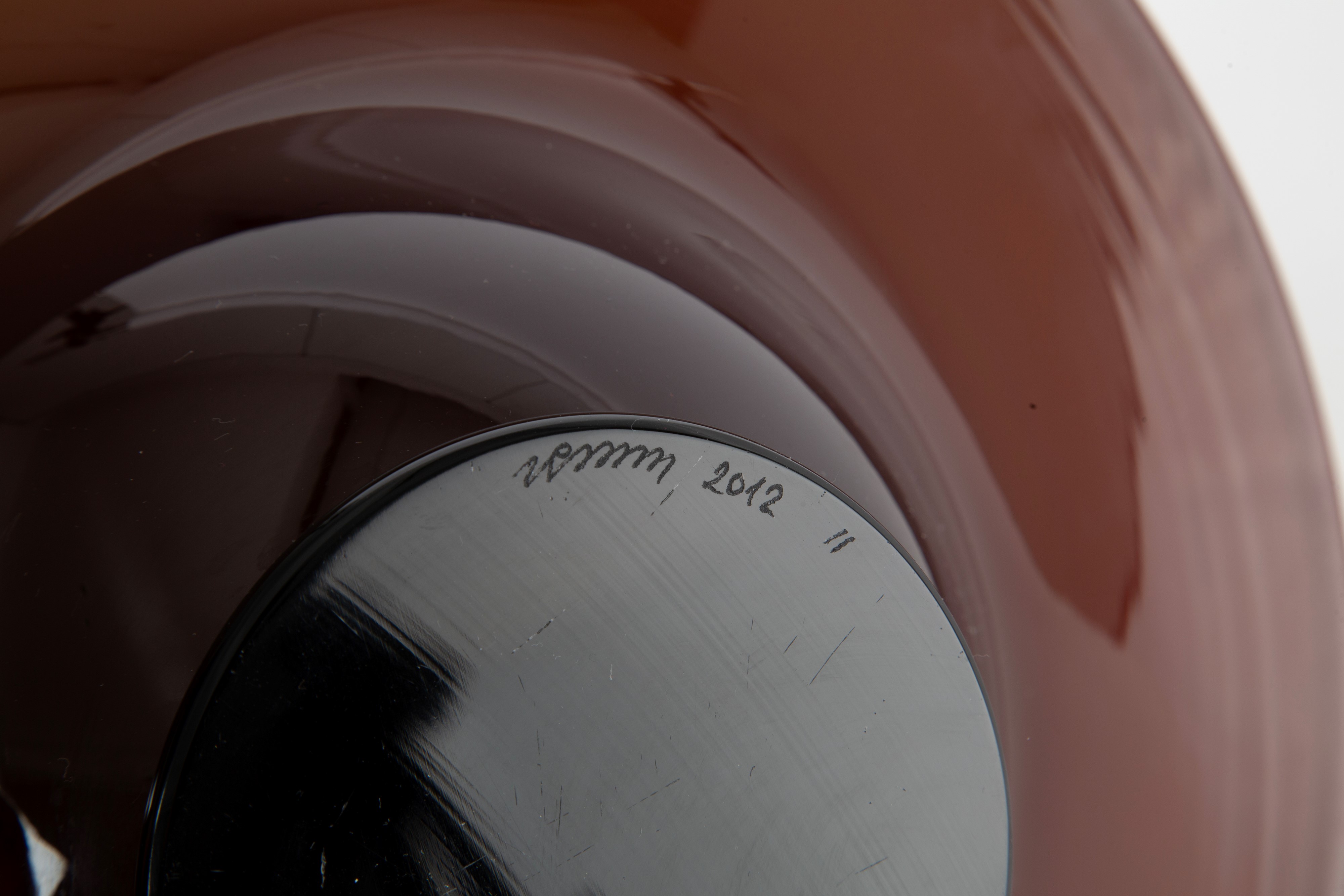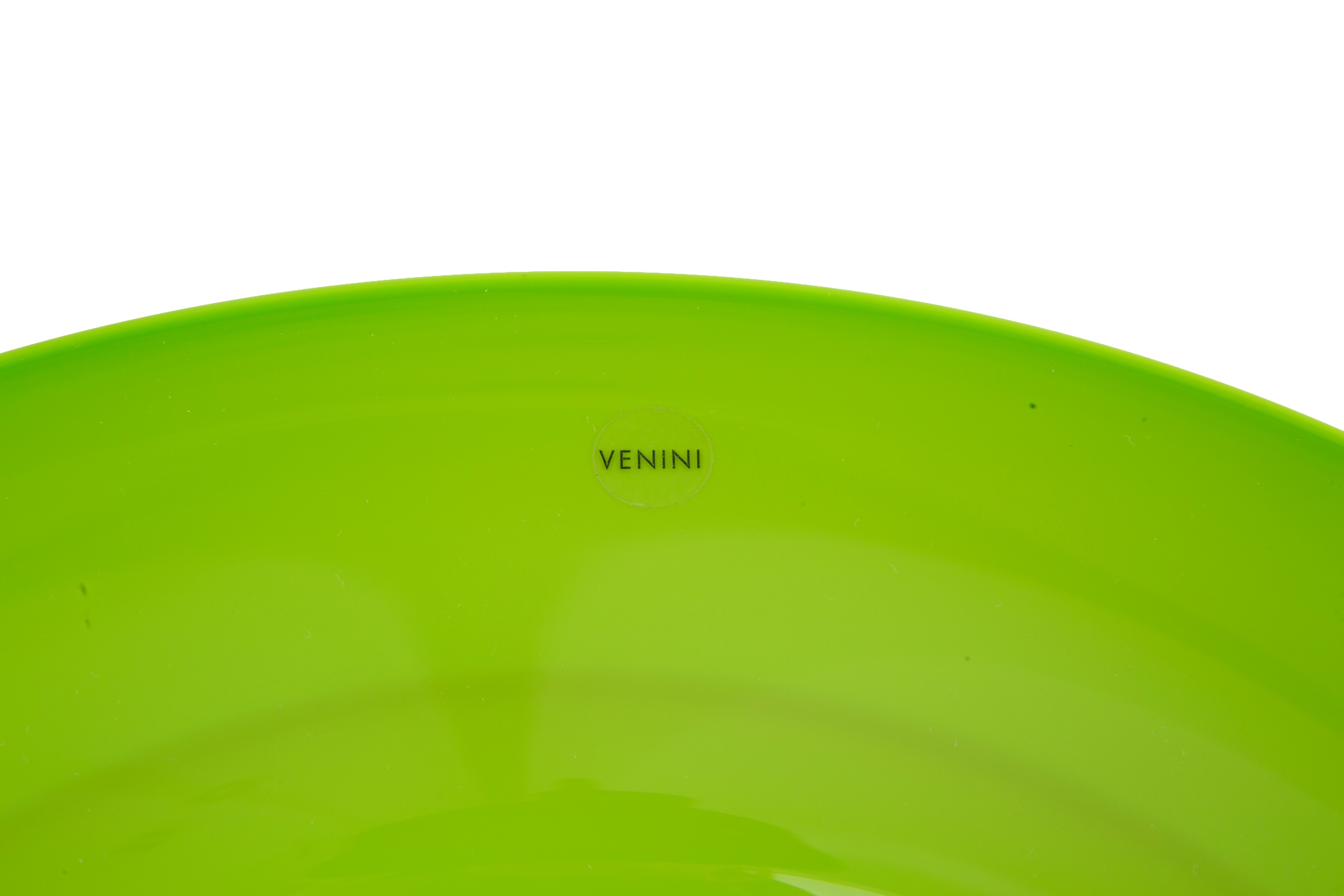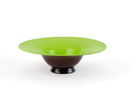 Green Murano glass centerpiece with an aubergine-colored base. Made by VENINI. Marked and dated 2012 on the bottom and with a manufacturer's label.