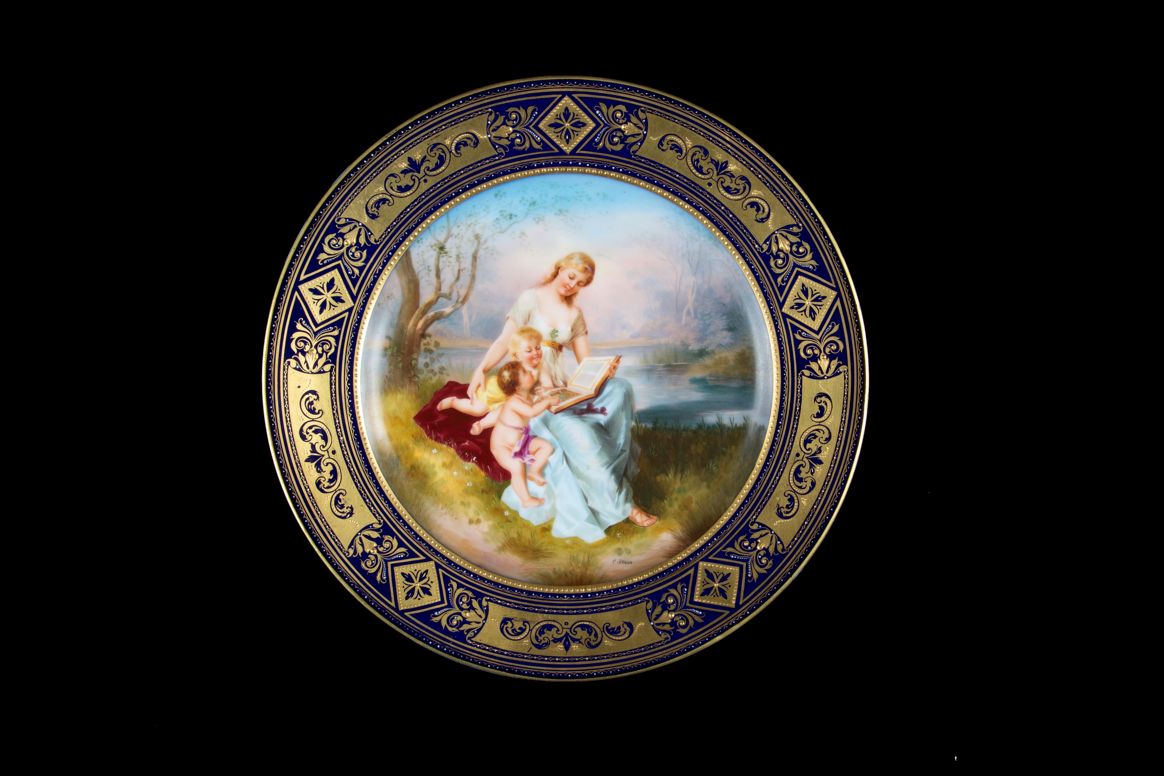 Porcelain plate depicting "FEMALE FIGURE READING WITH CHILDREN." Signed lower center. Marked on the bottom. Vienna. Late 19th century.