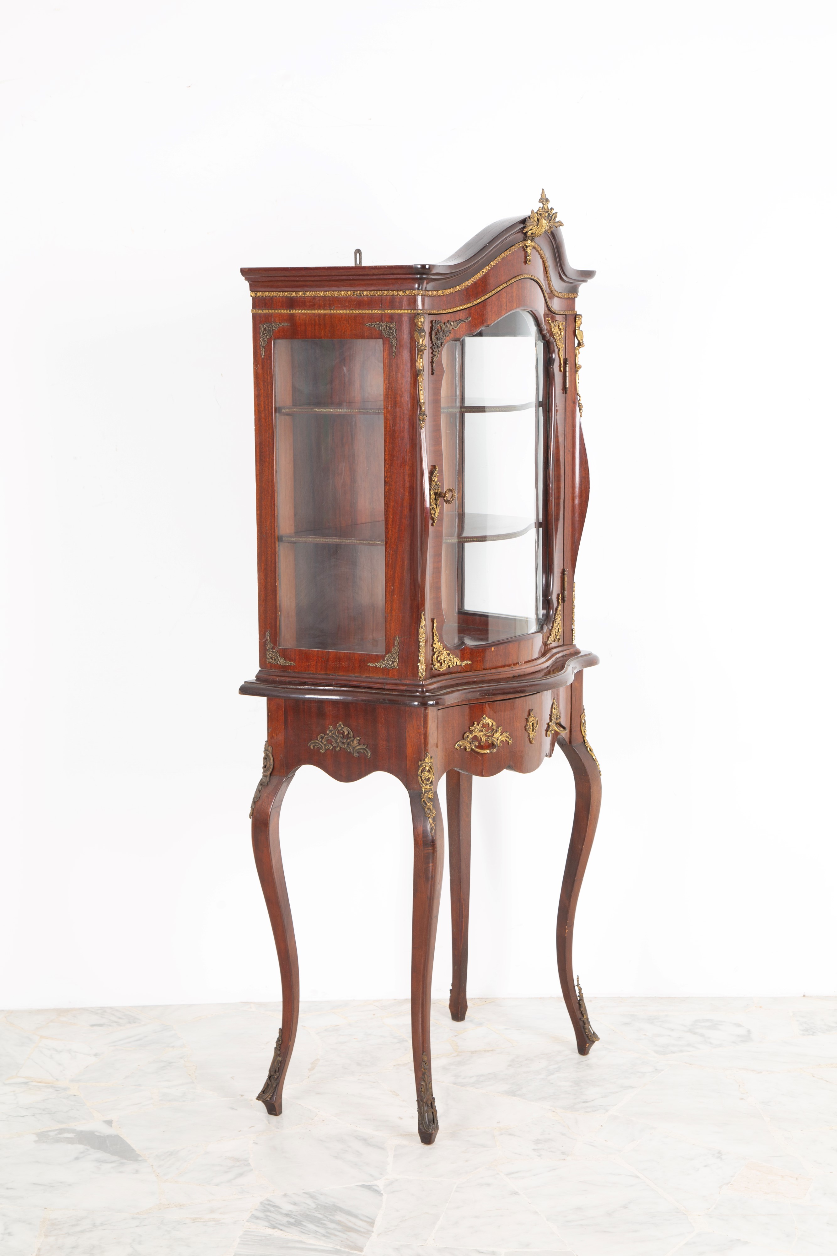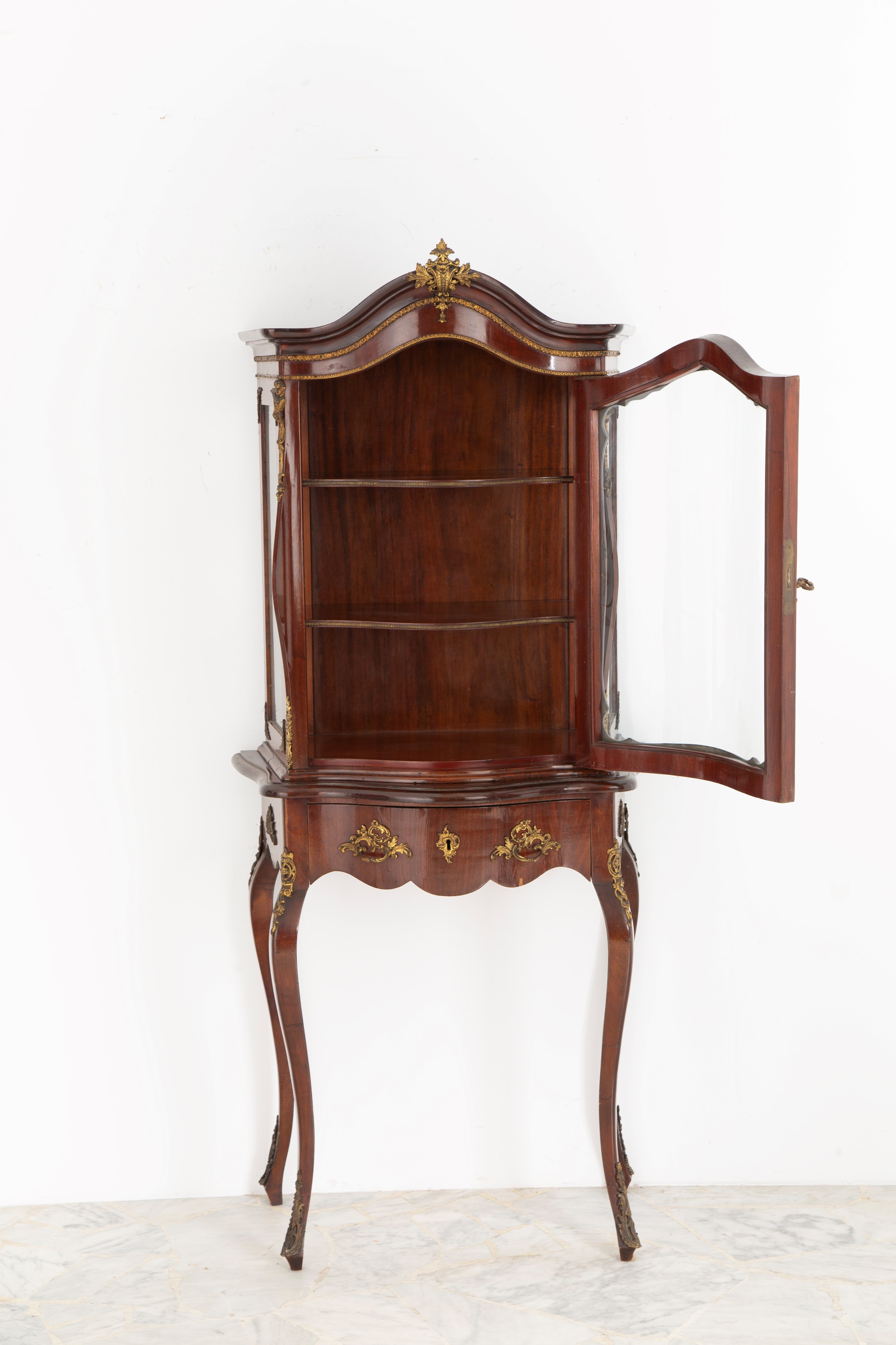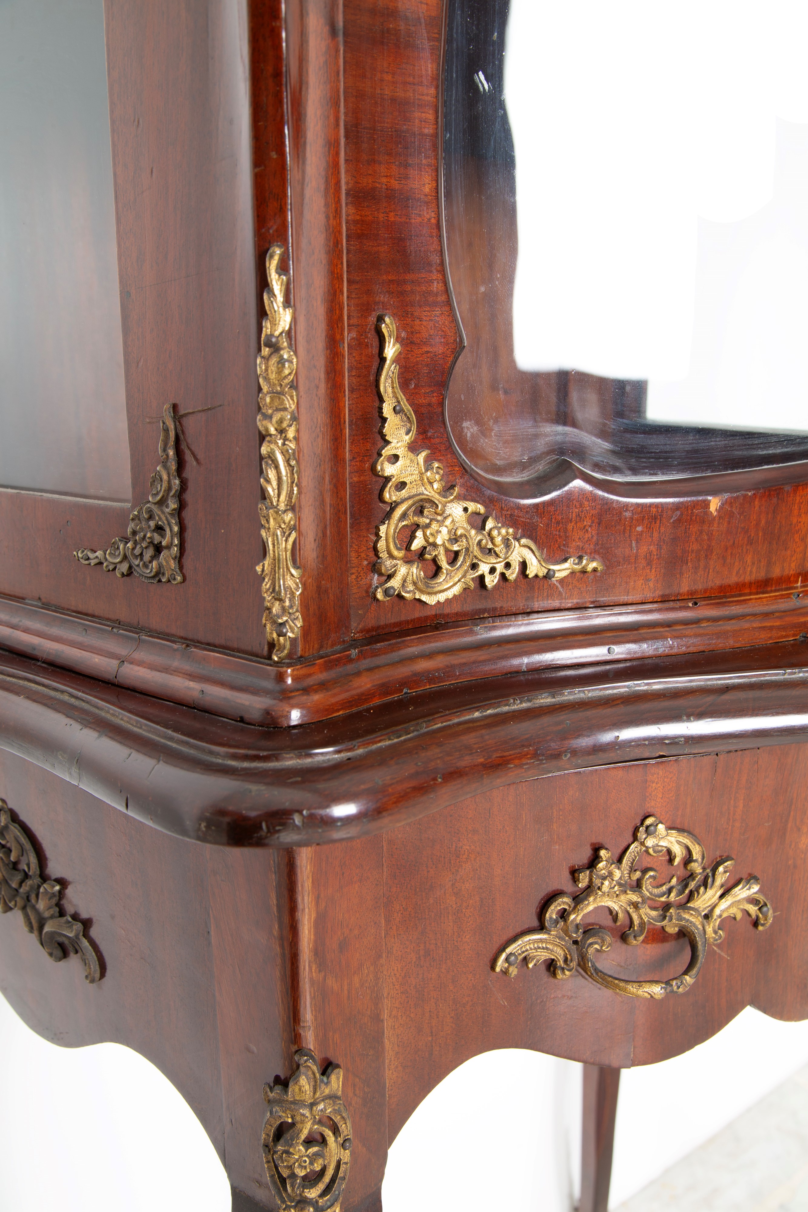 High leg display mahogany cabinet with gilt bronze trim and drawer on the side. Napoleon III period. Minor defects.