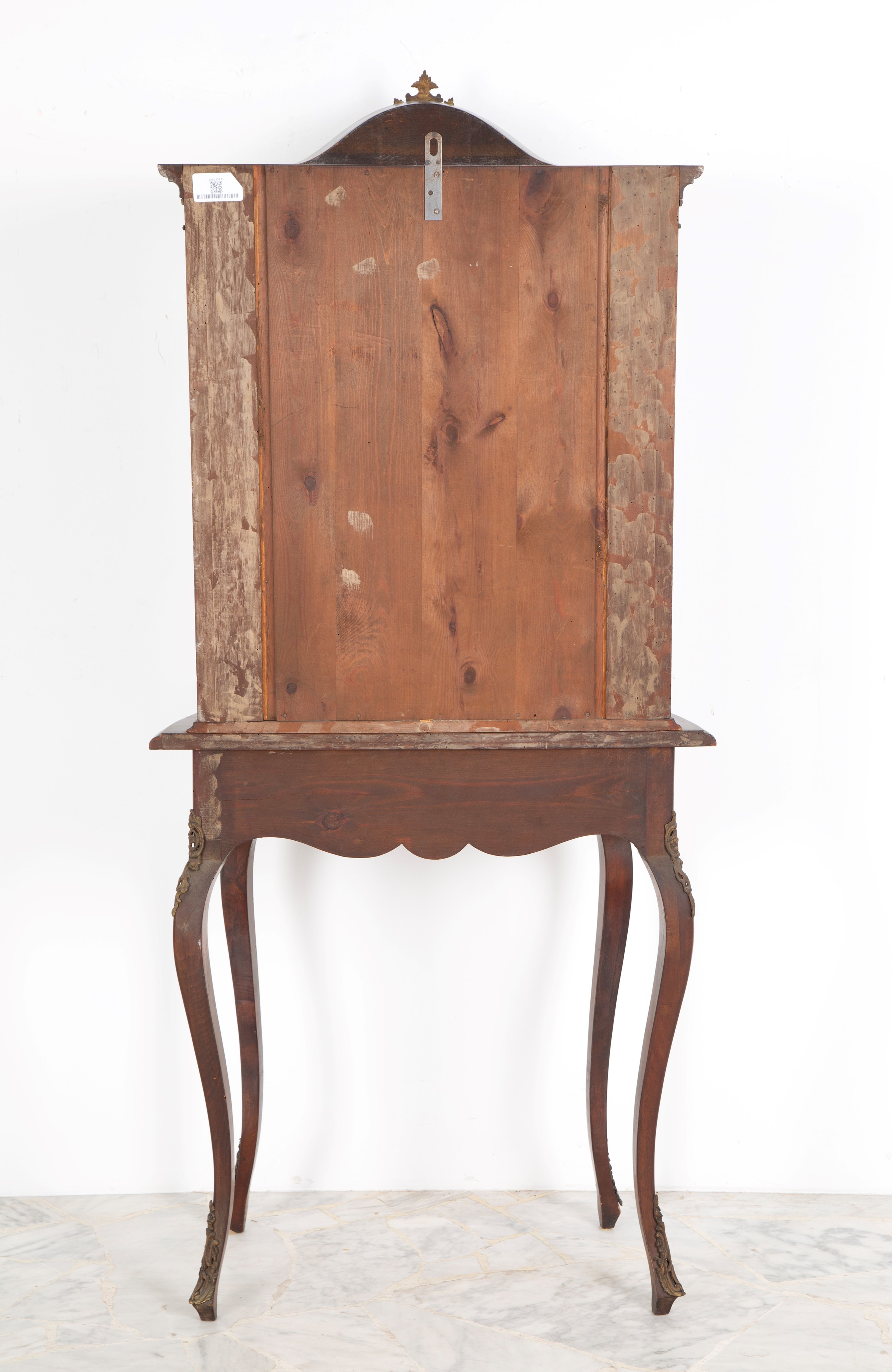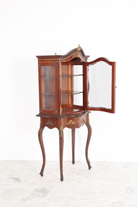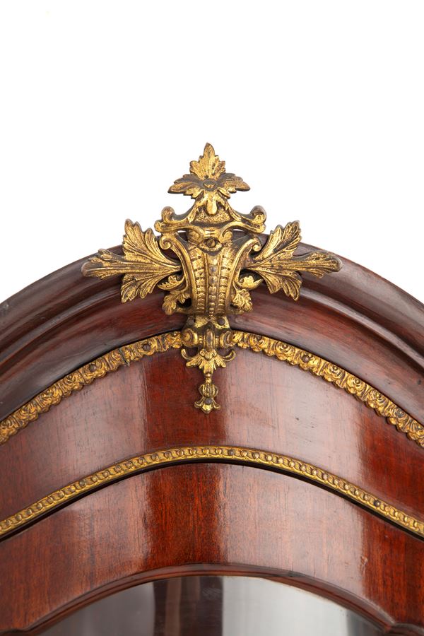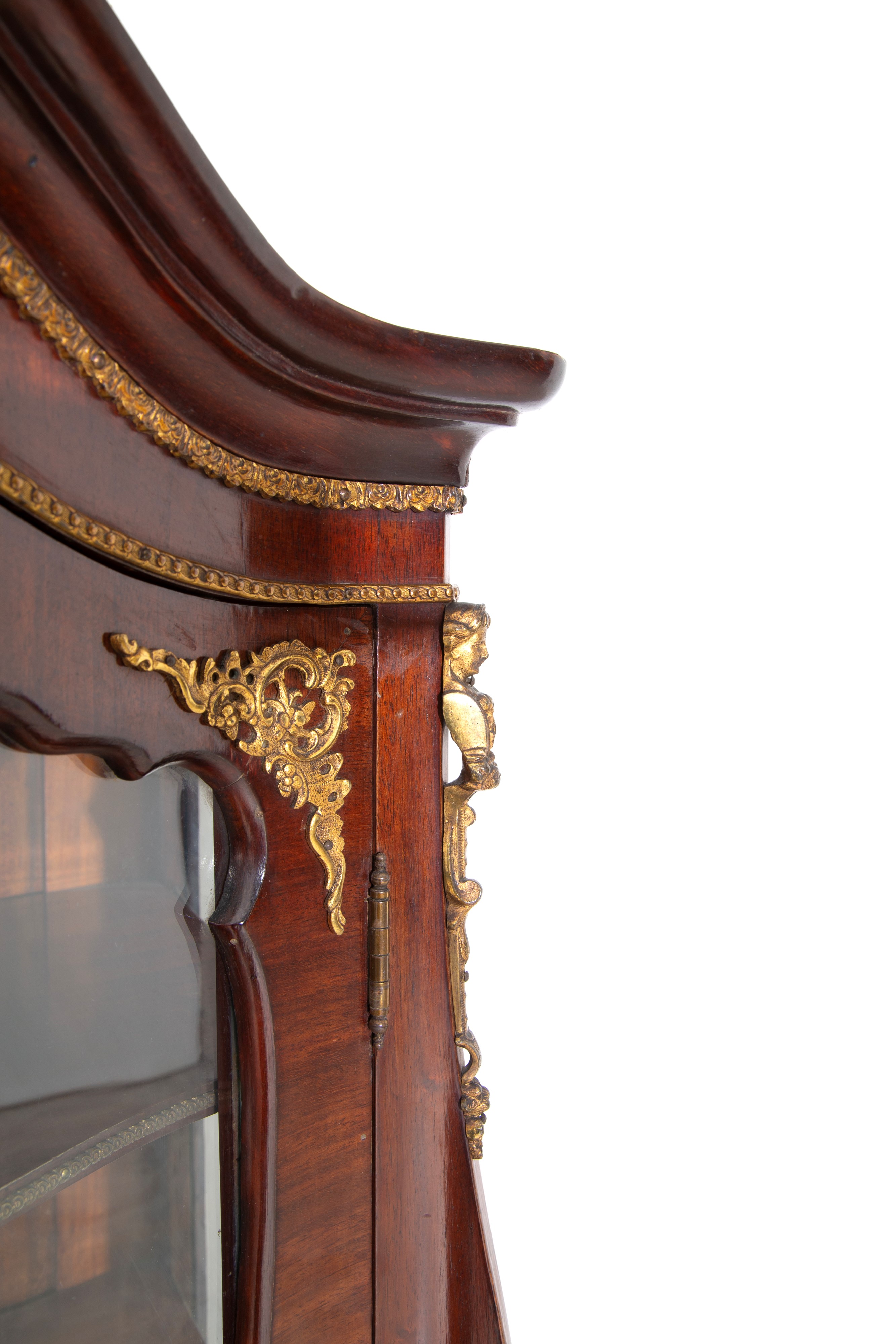 High leg display mahogany cabinet with gilt bronze trim and drawer on the side. Napoleon III period. Minor defects.