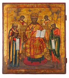 Icon depicting "CHRIST ON THE THRONE AND SAINTS". 19th century. Minor defects.