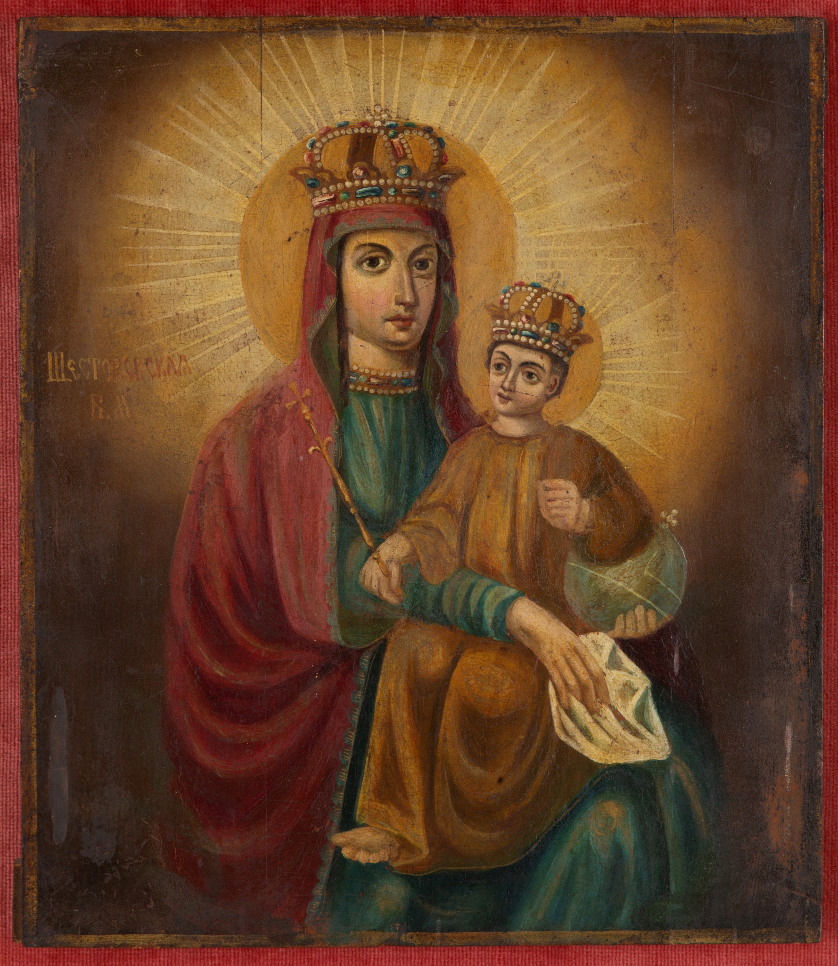Icon depicting "MADONNA WITH CHILD". 19th century. Mounted on a panel in a frame. Defects.