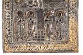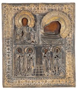 Partially gilded silver icon with a riza depicting "SAINTS." Hallmarks on the lower edge. Russia. 19th century.