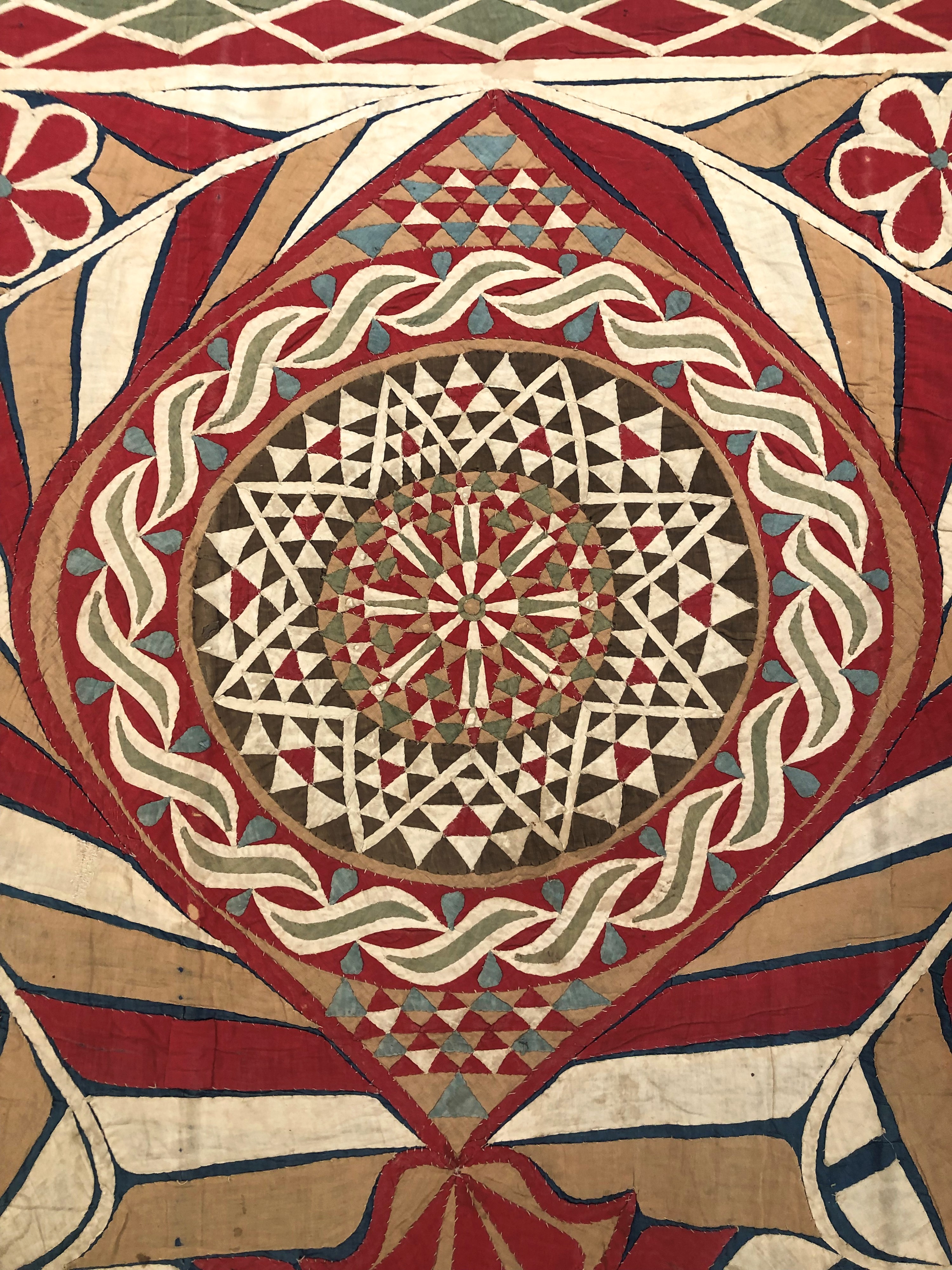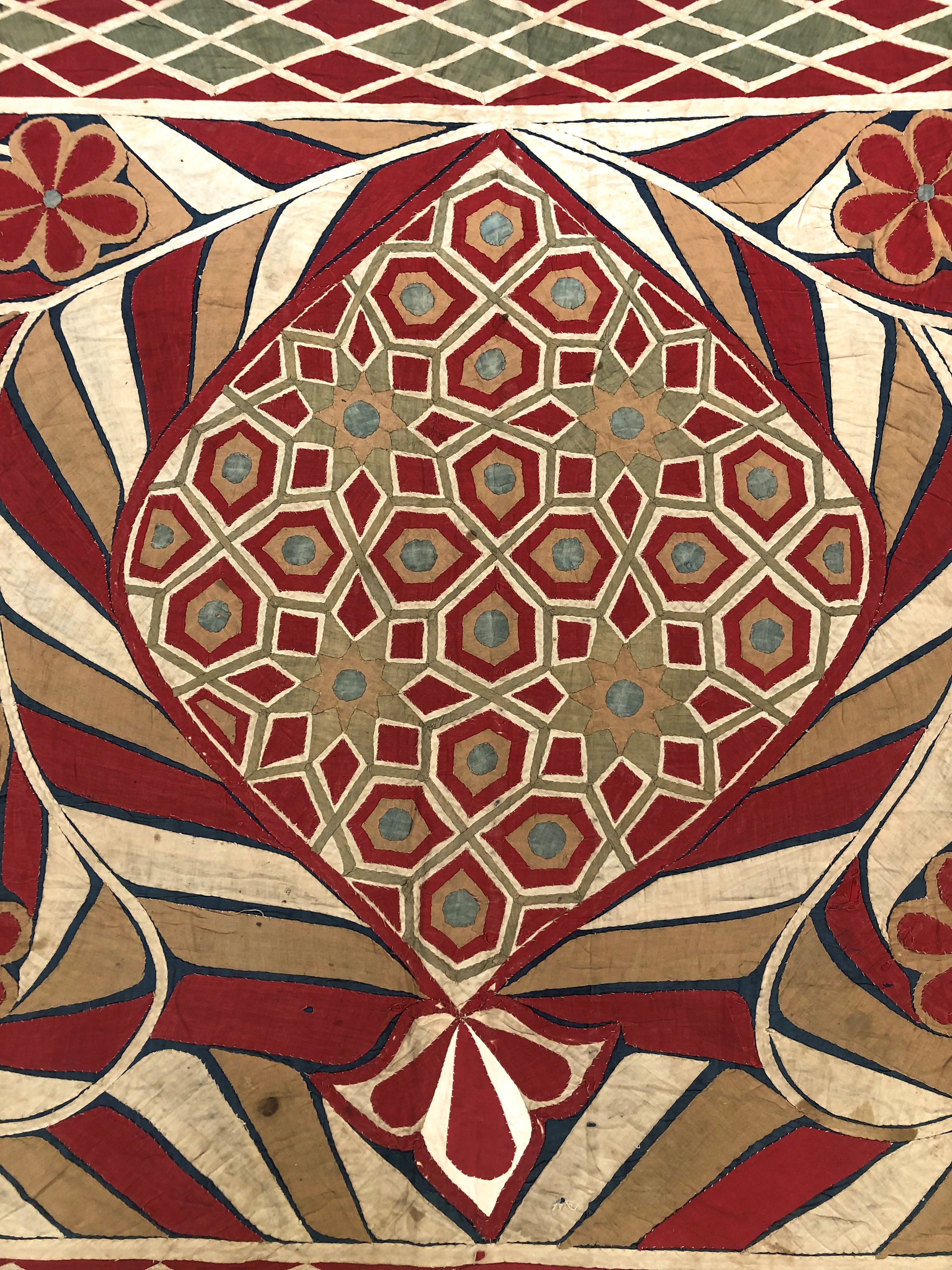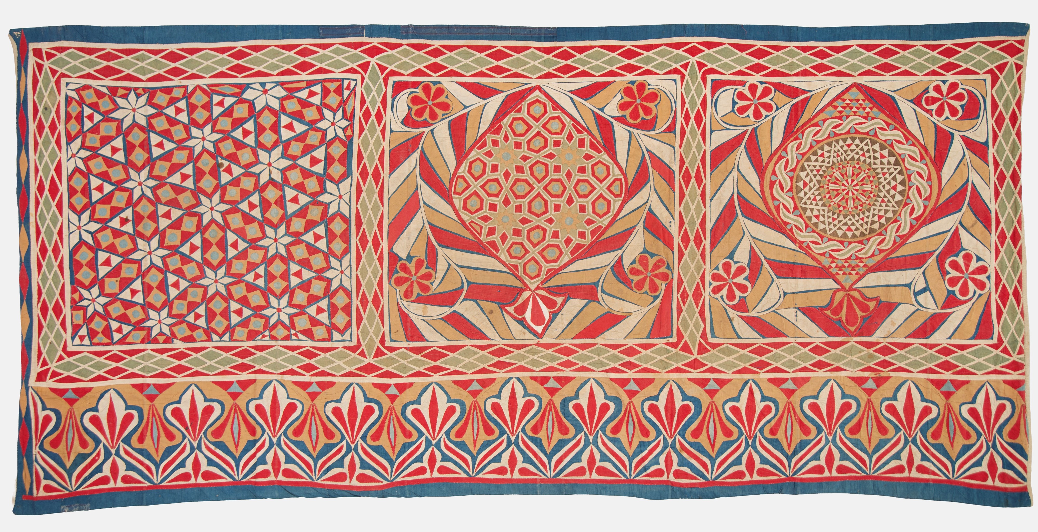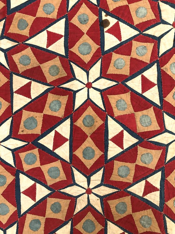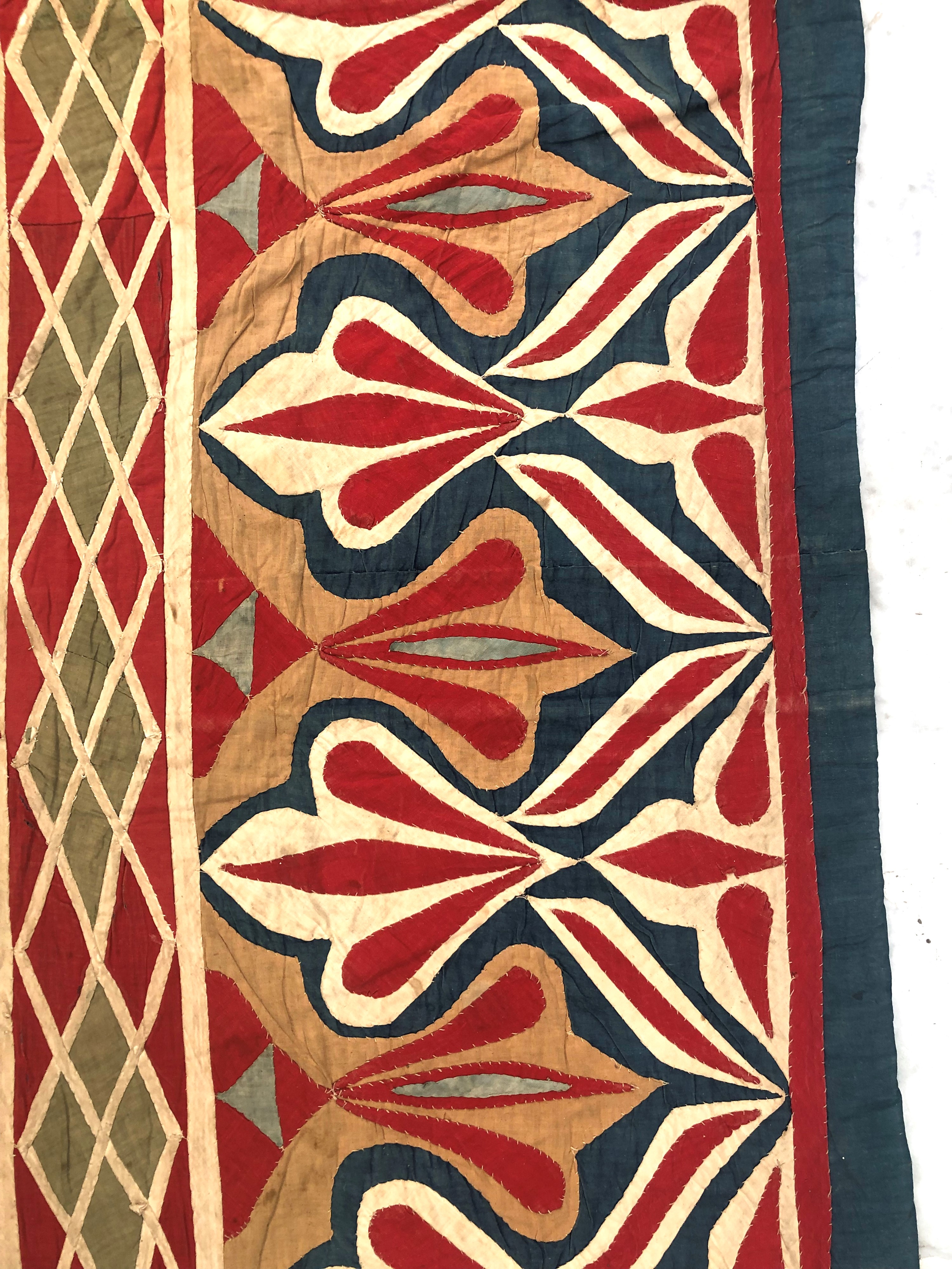Indian fabric. Around 1900. Good condition, short in length. Given the rug's size, the main photo is a composite of multiple shots.