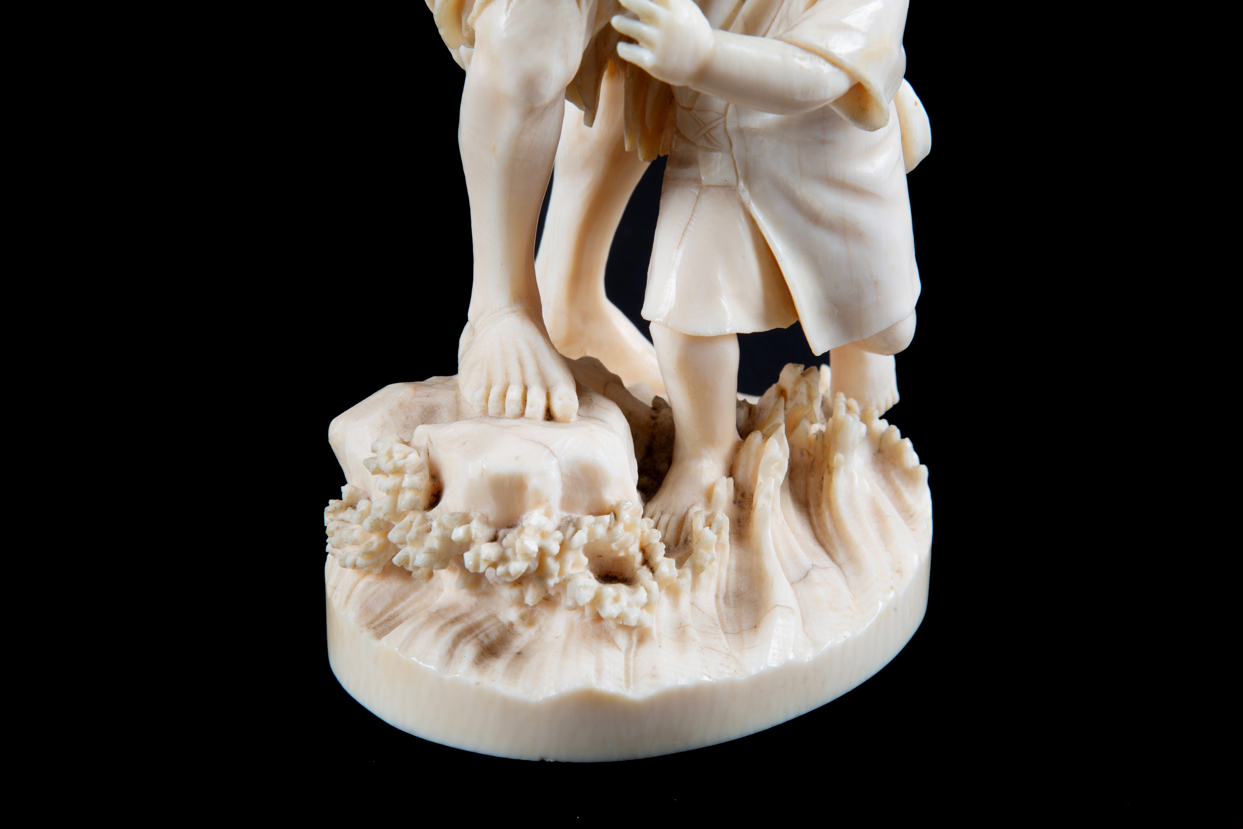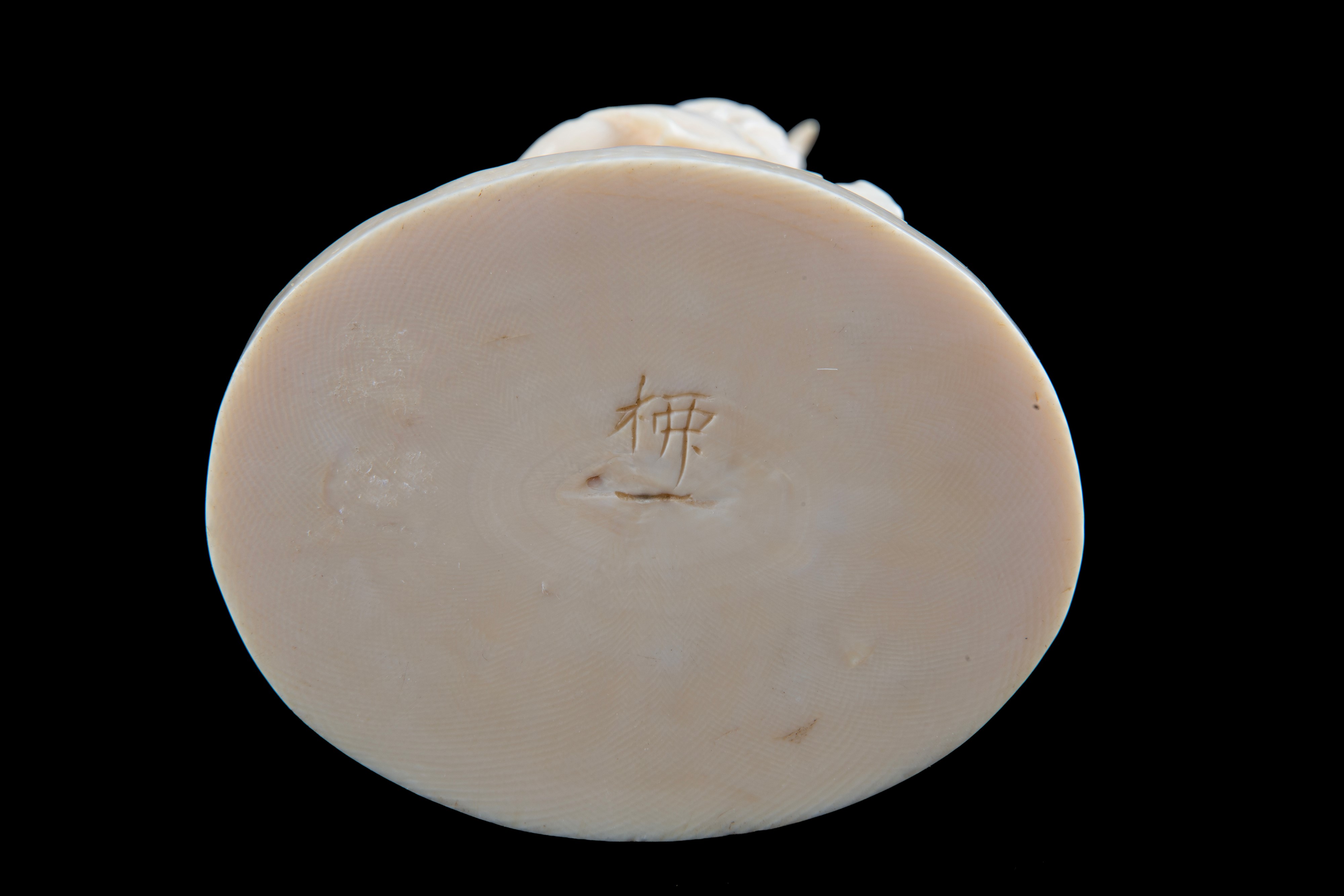 Ivory okimono depicting "FISHERMAN WITH CHILD." Signed on the bottom. Japan. Meiji period. With CITES certificate.