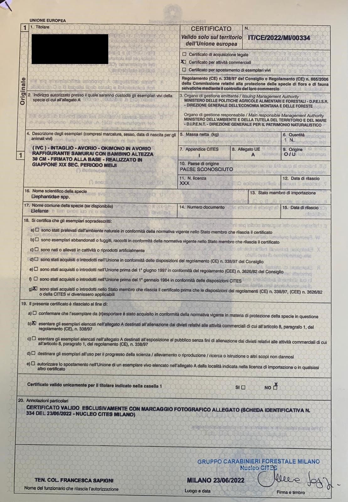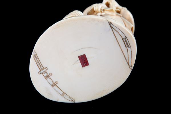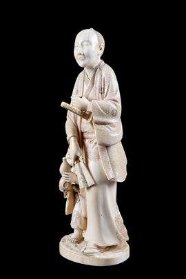 Ivory okimono depicting "SAMURAI WITH CHILD." Signed at the base. Japan. Meiji period. With CITES certificate.
