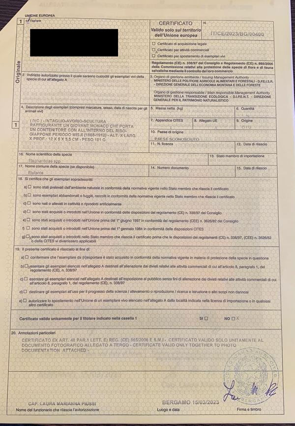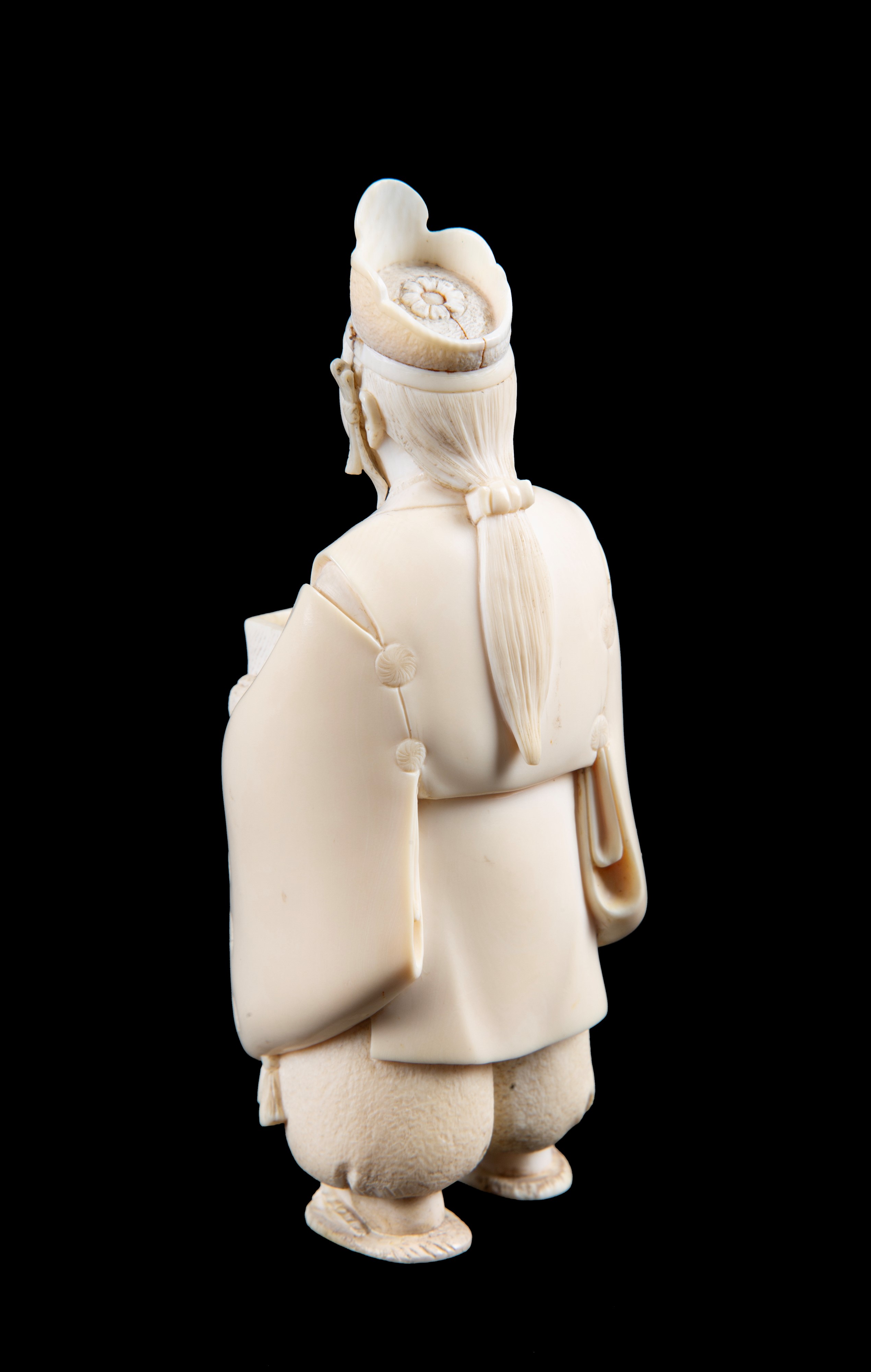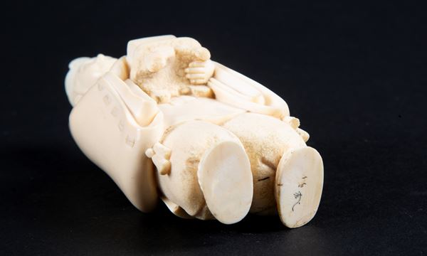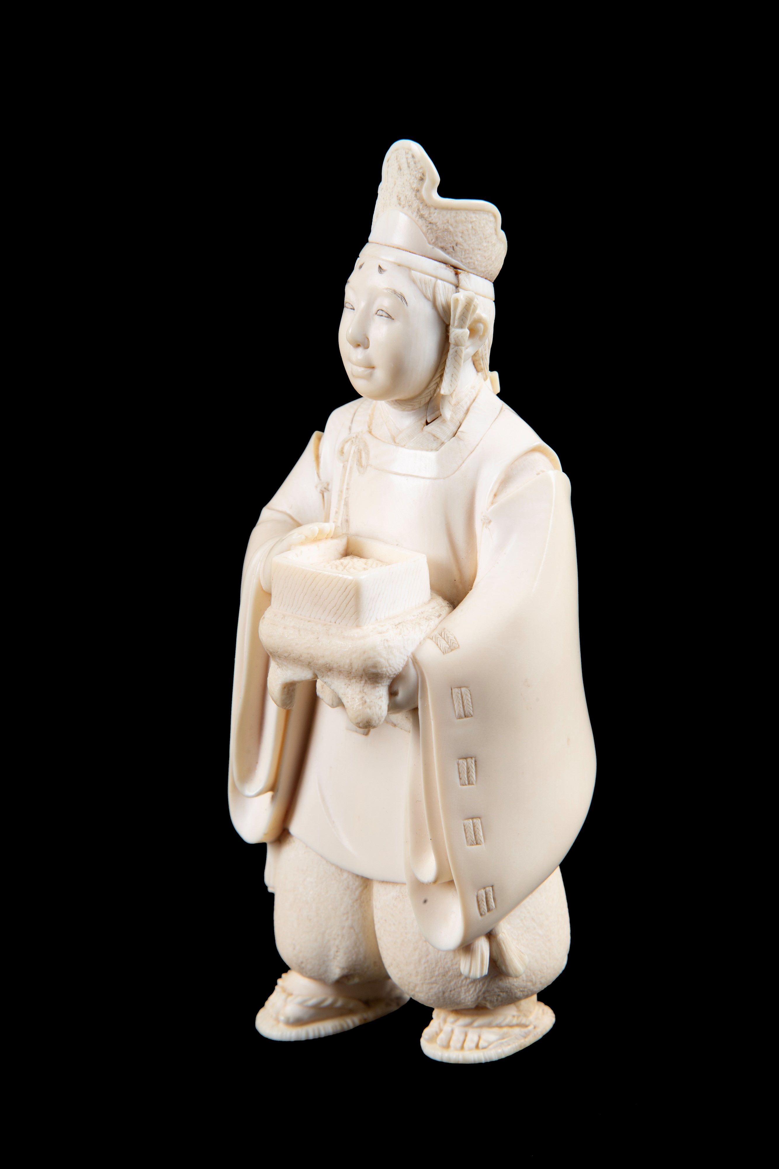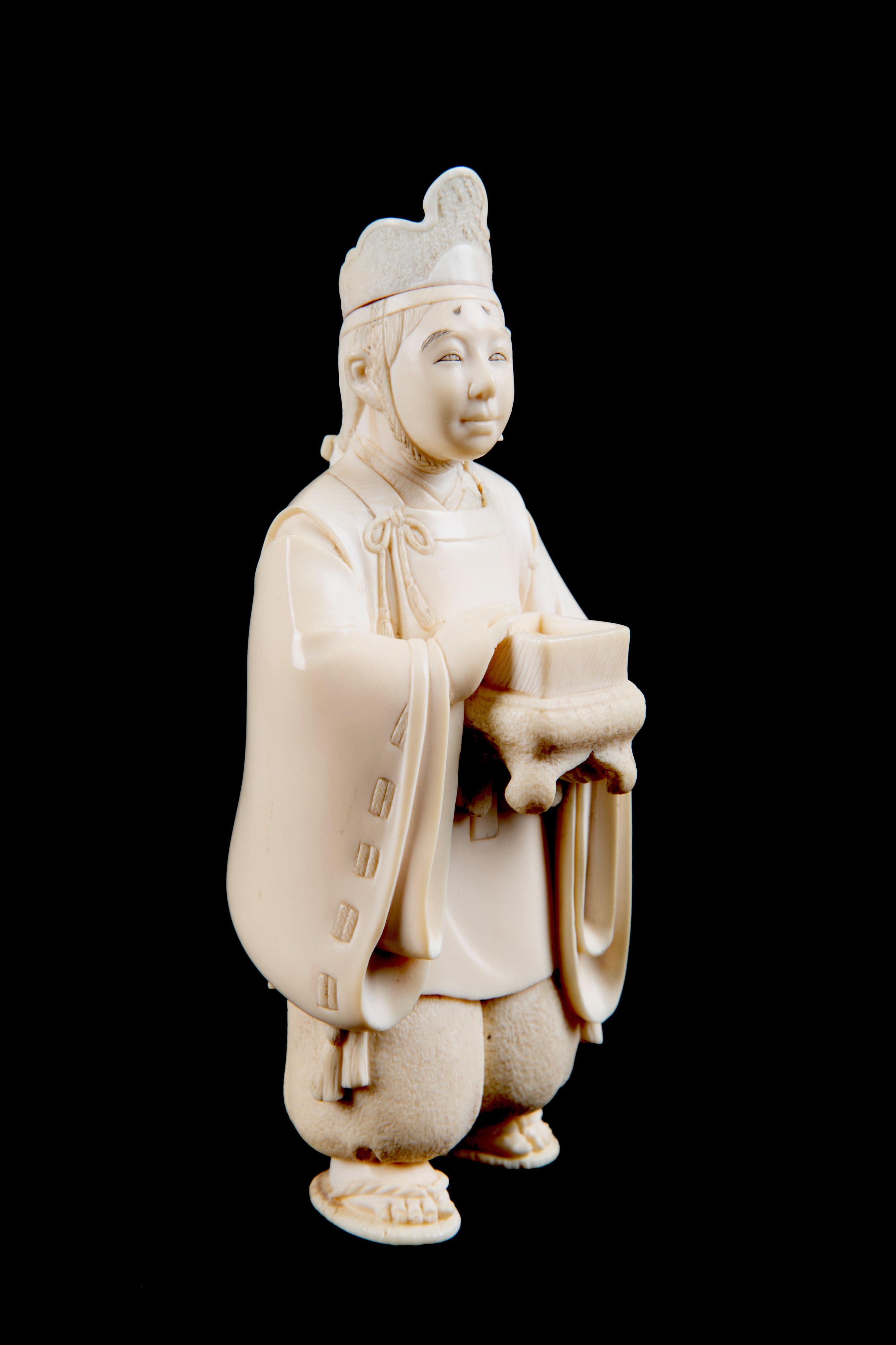 Ivory okimono depicting "YOUNG MONK CARRYING A CONTAINER OF RICE." Signed on the bottom. Japan. Meiji period. With CITES certificate.
