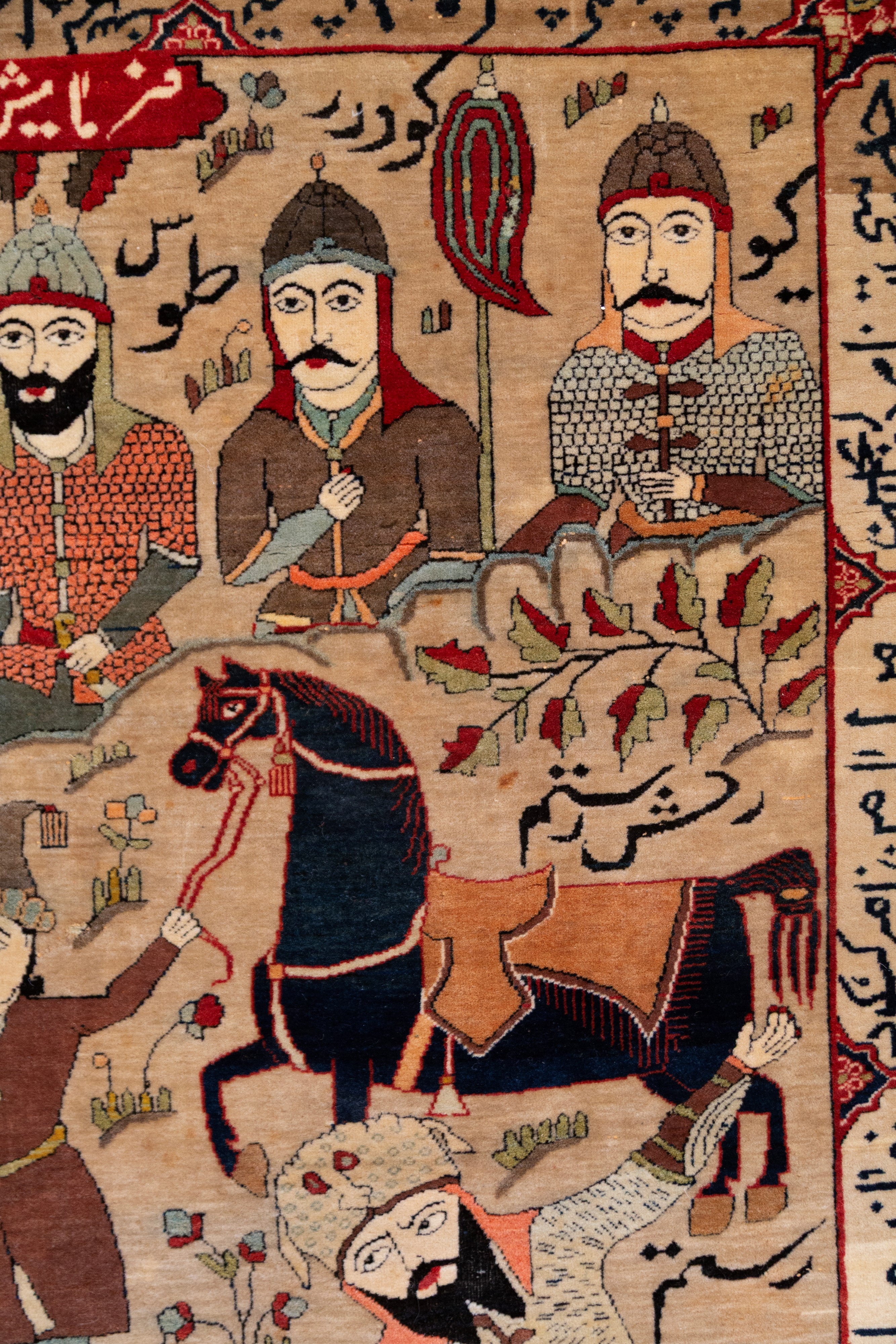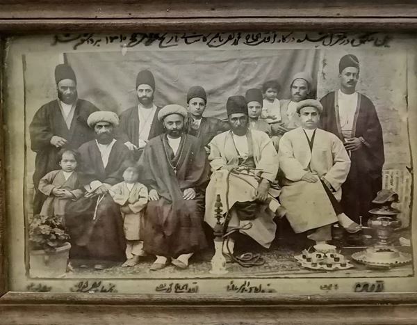 The photo was taken at the home of Dergah Mohammad Taqi, a merchant from Kashani, on Muharram in 1310 (1893 A.D.). A note is written above the late Mohammad Taqi, a merchant from Kashani, great-grandfather of the Attarha clan in Kashan, the first person seated on the left, where two children are leaning on him. Amin Al-Raaya is the person in front of the hookah. Ahmad Khan is the first person standing on the right.