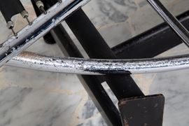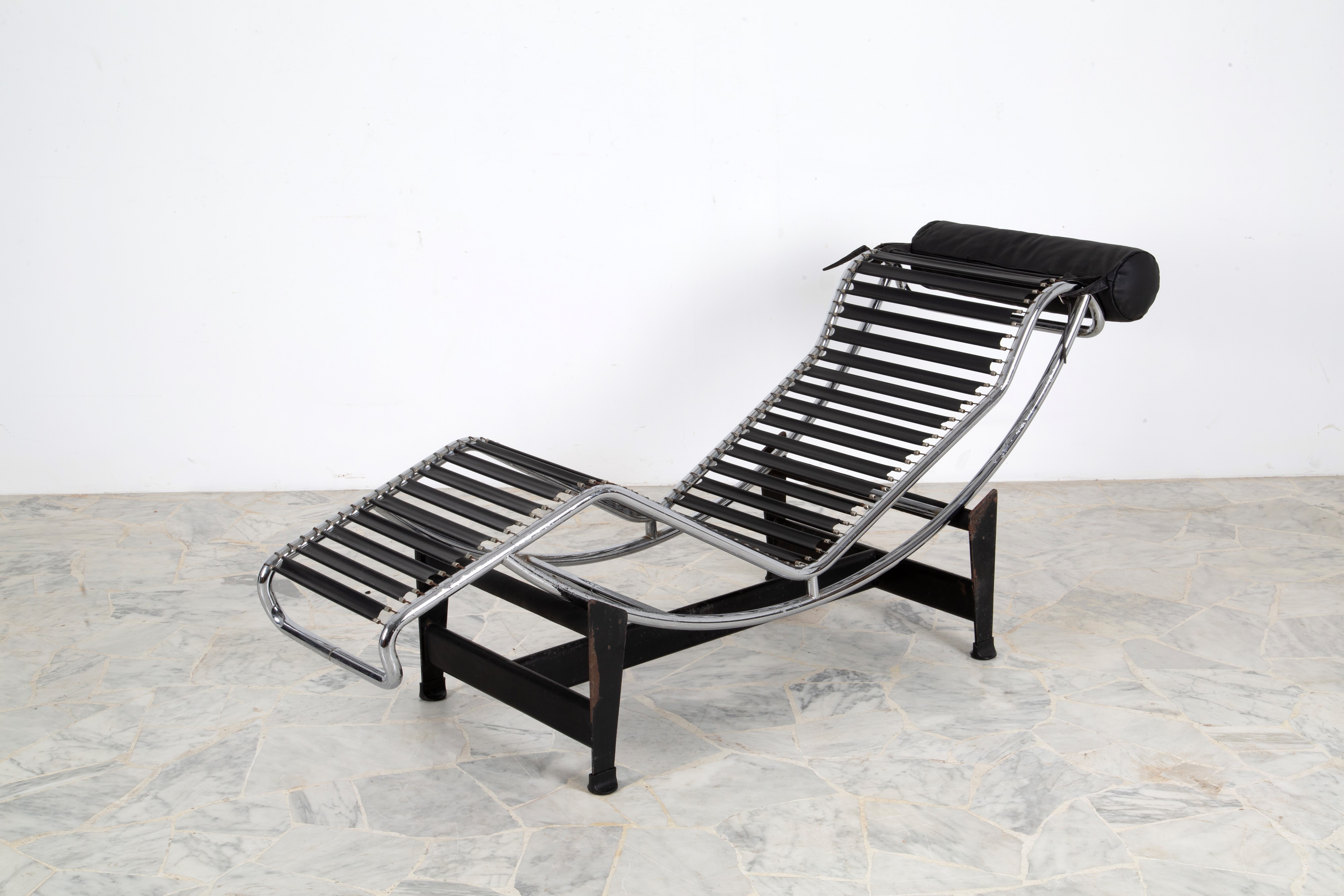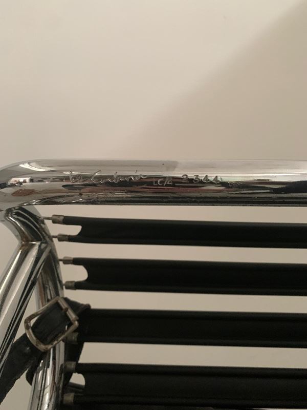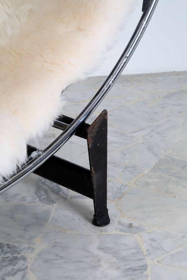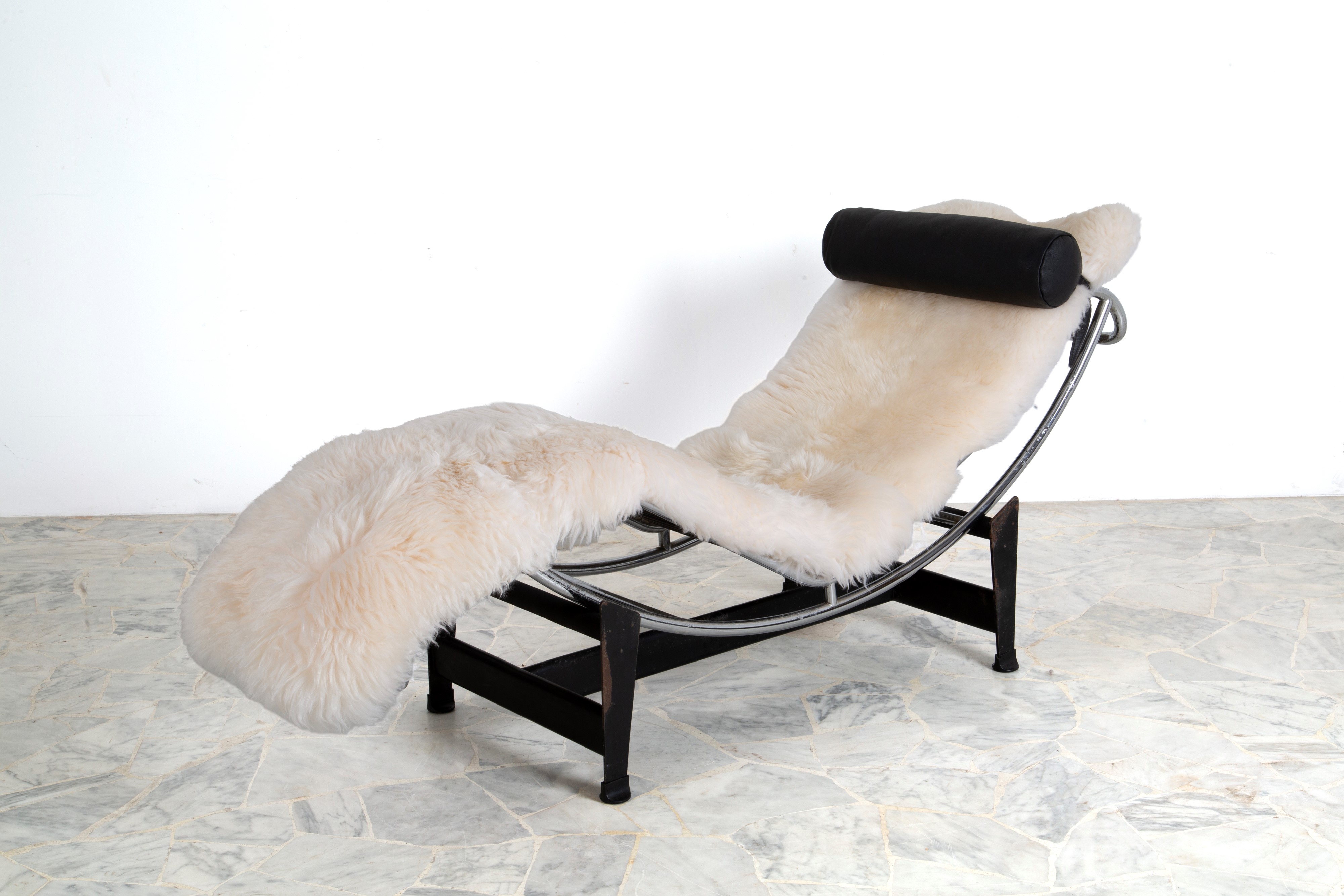 LC4 chaise longue in chromed steel, leather, and white fur. Made by Cassina. Numbered 2344. Reupholstered. Defects and signs of wear.