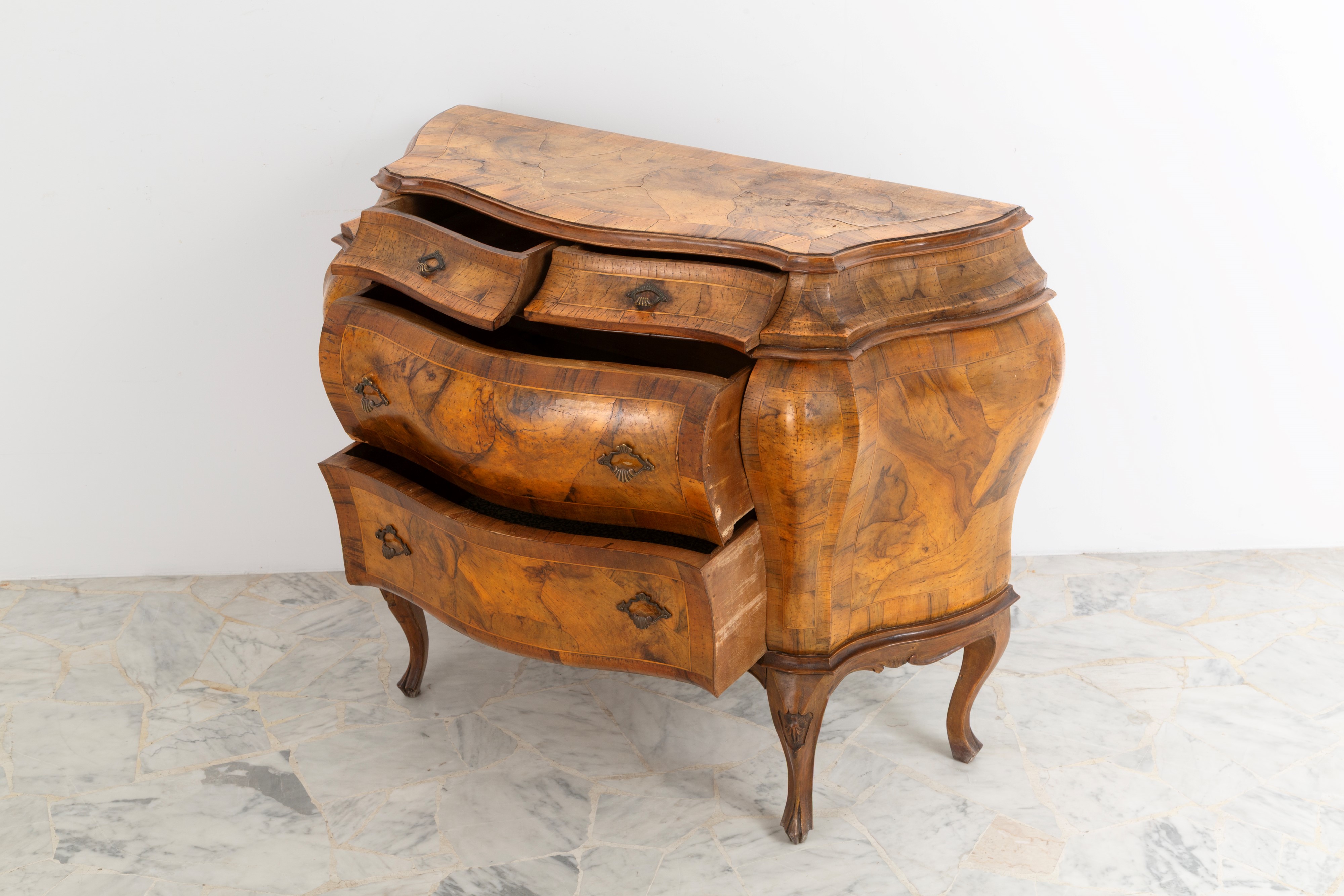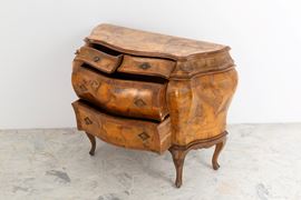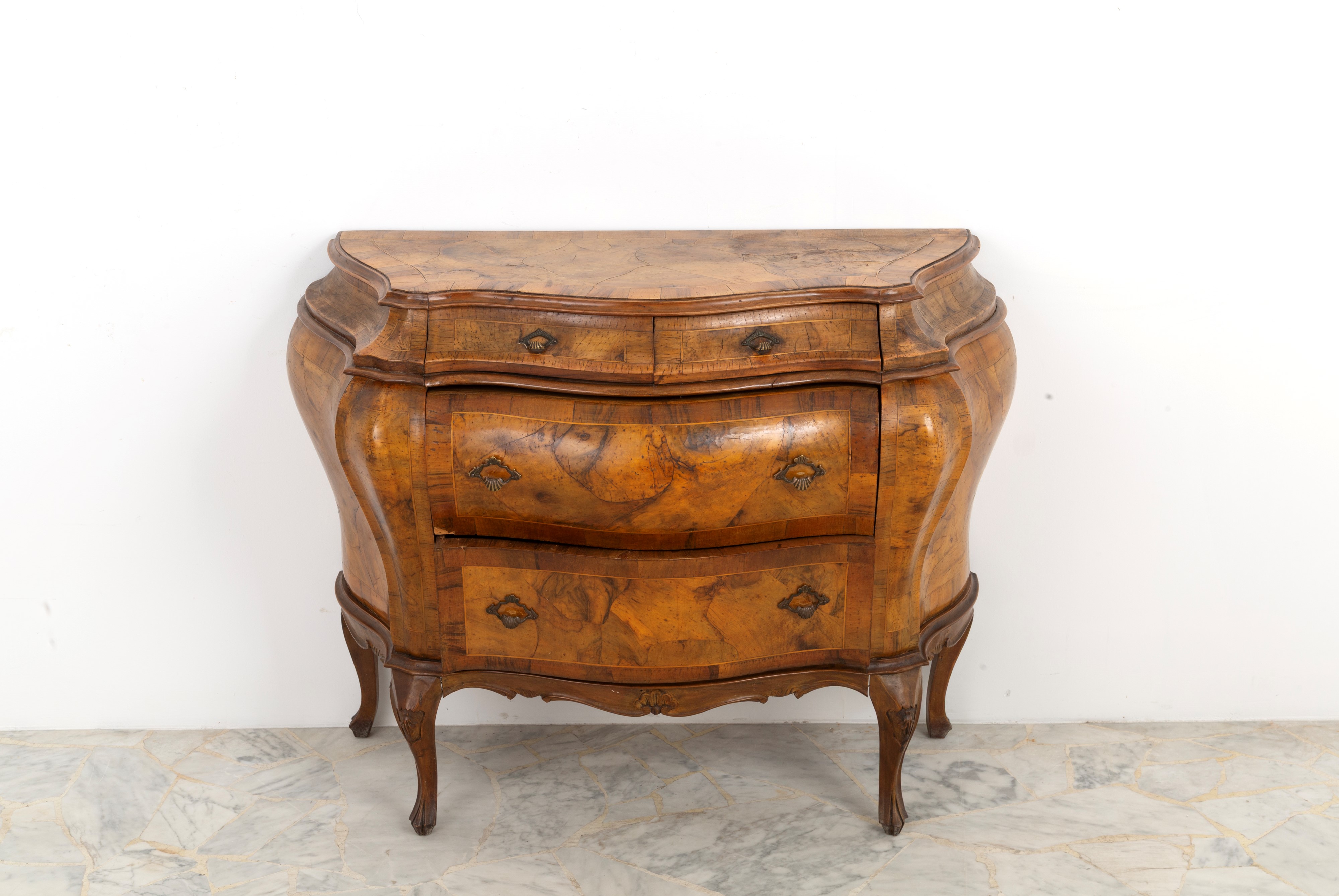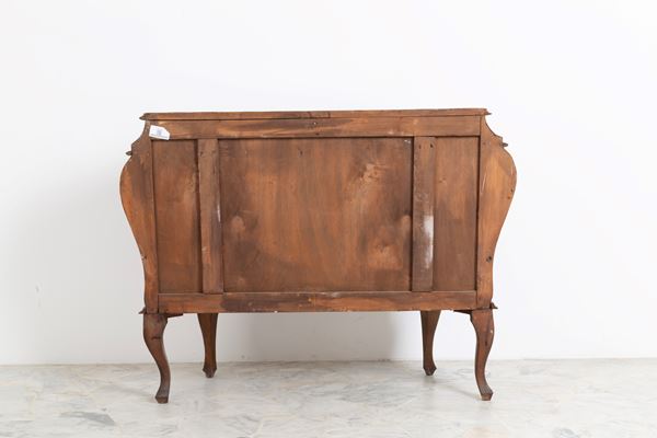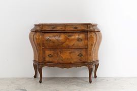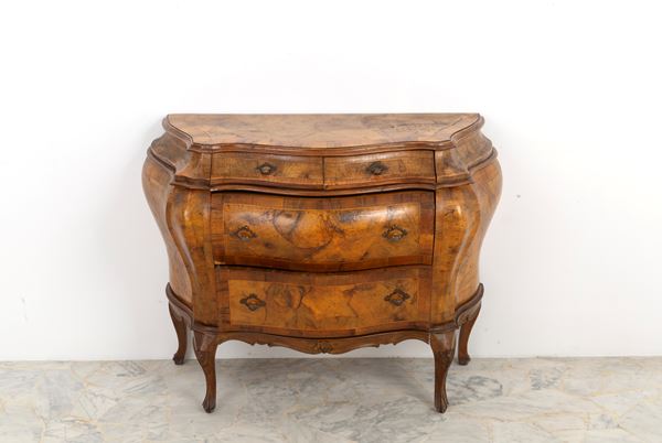 Curved chest of drawers veneered in walnut burl. Lombardy. Early 20th century.