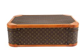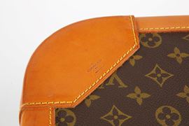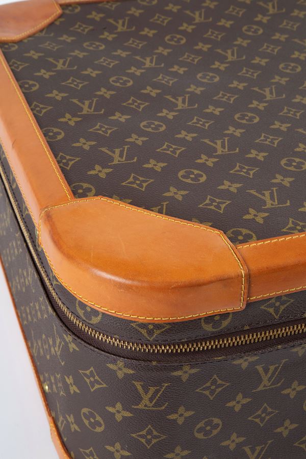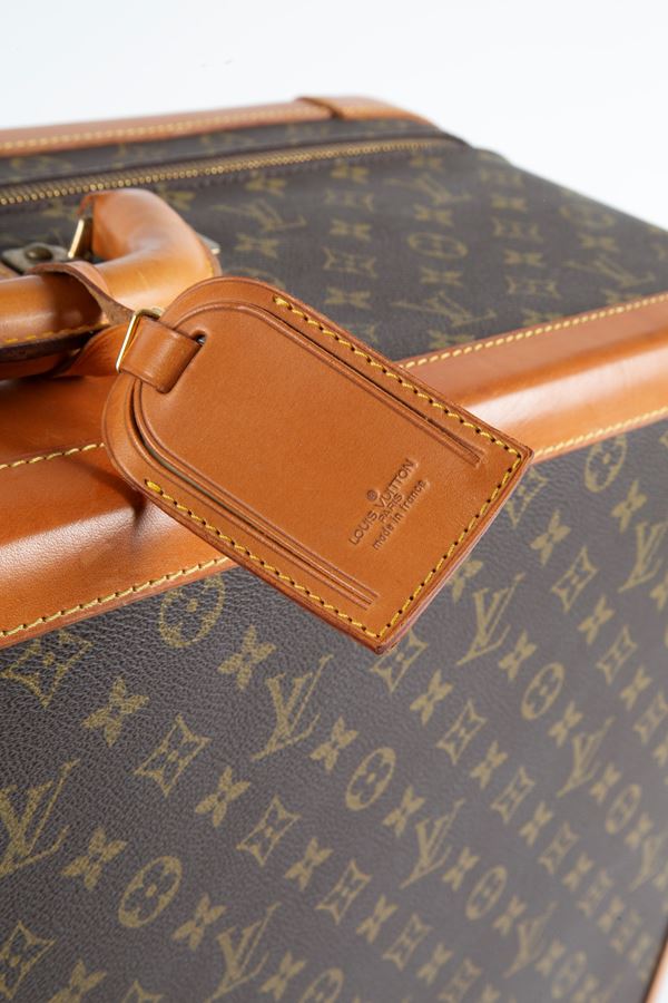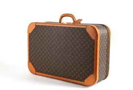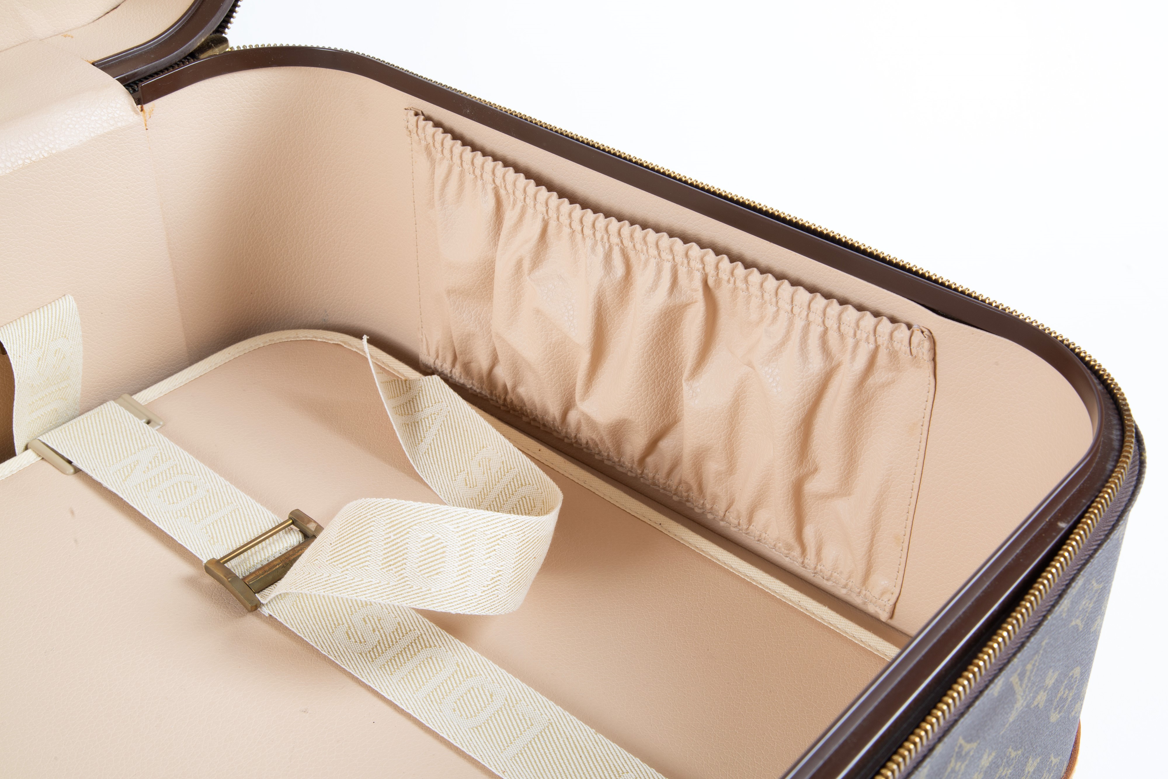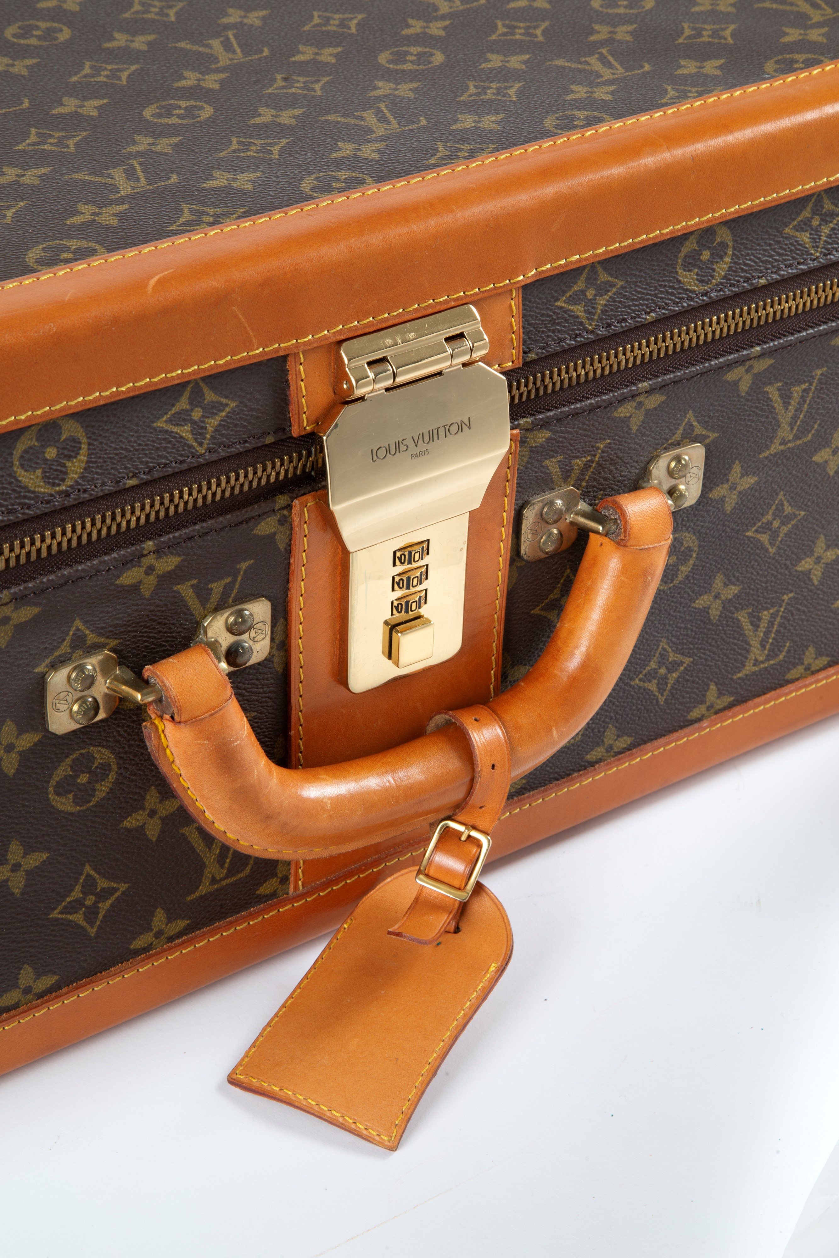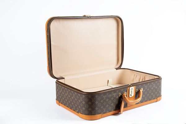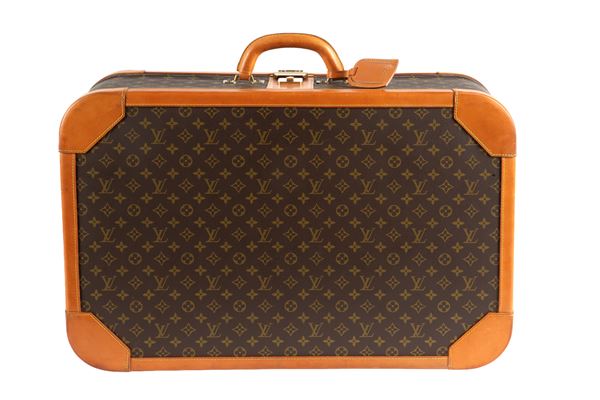 LOUIS VUITTON. Stratos suitcase with light brown leather handle, straps, and edges.
