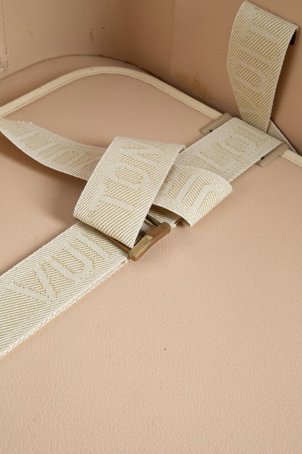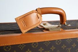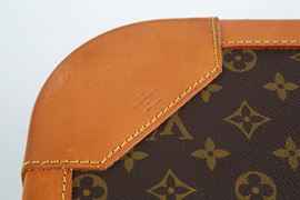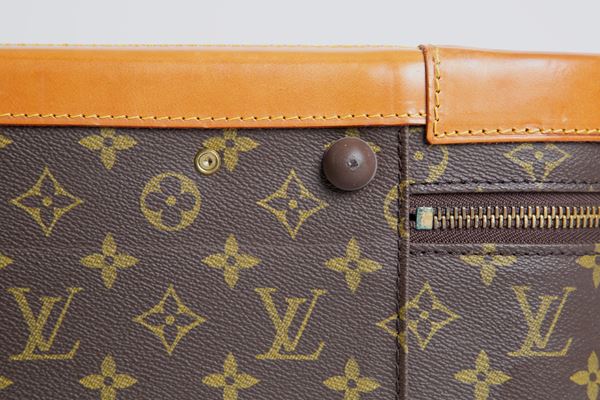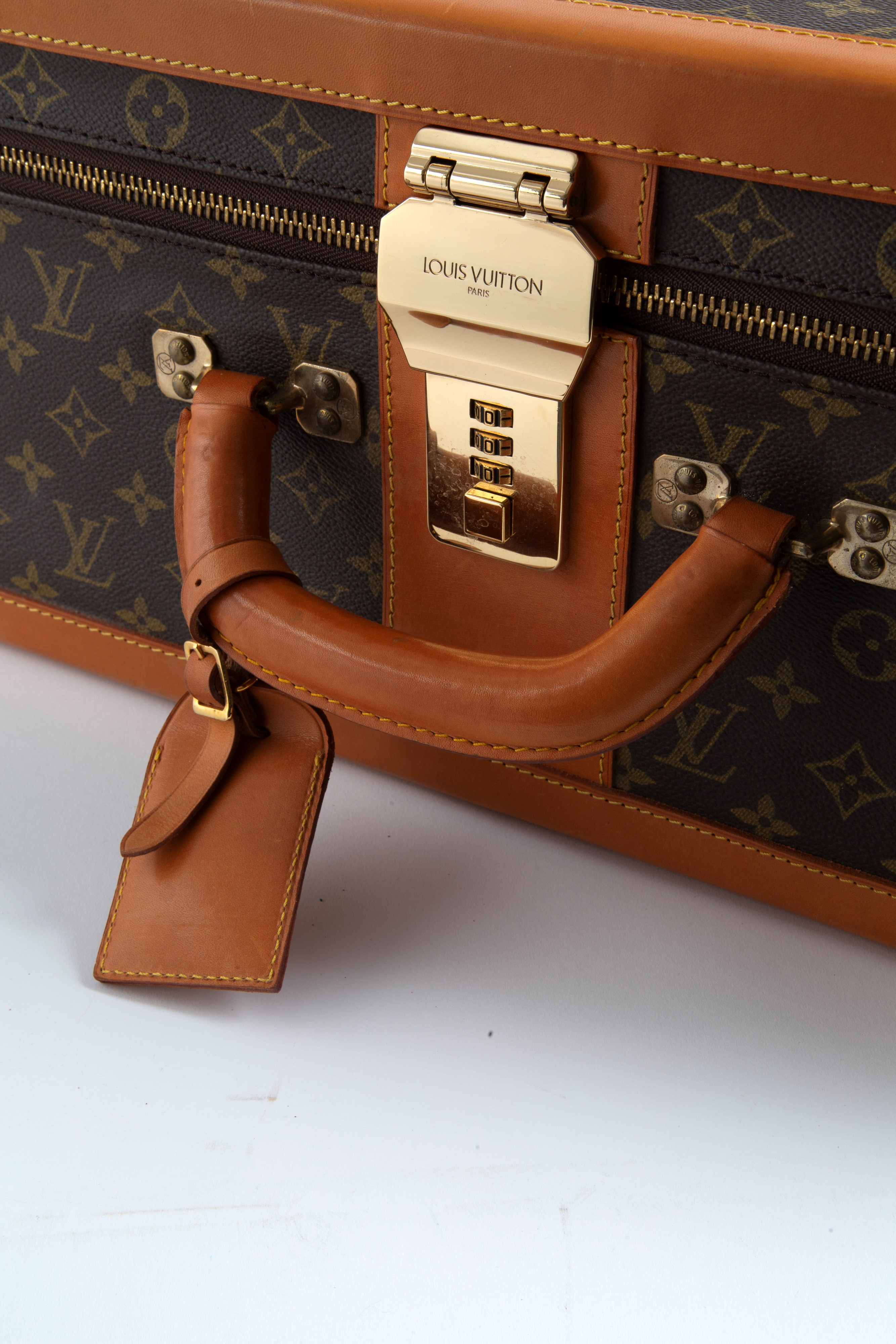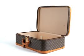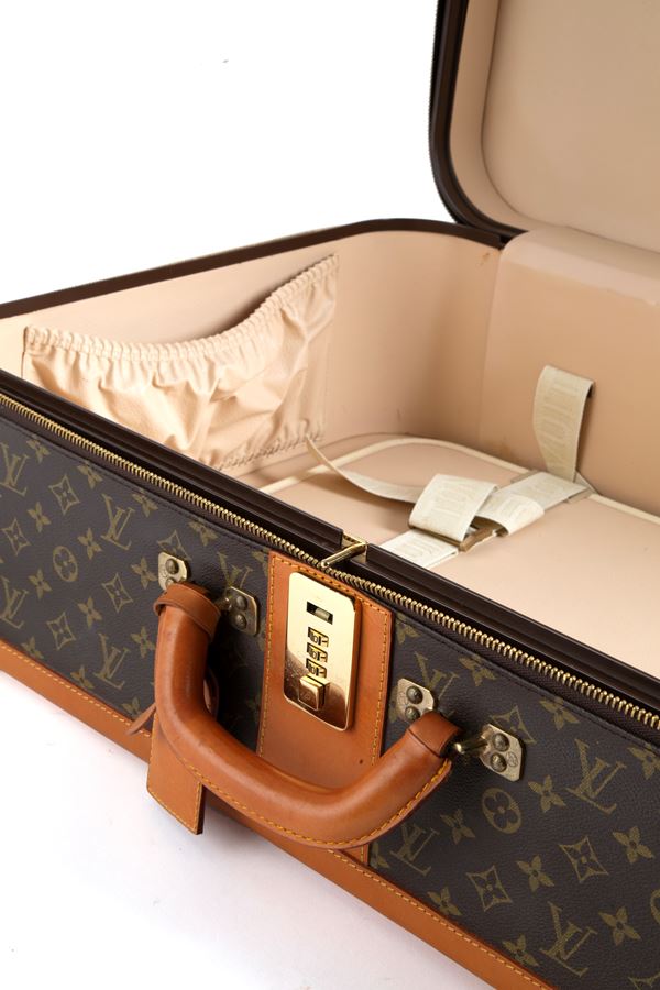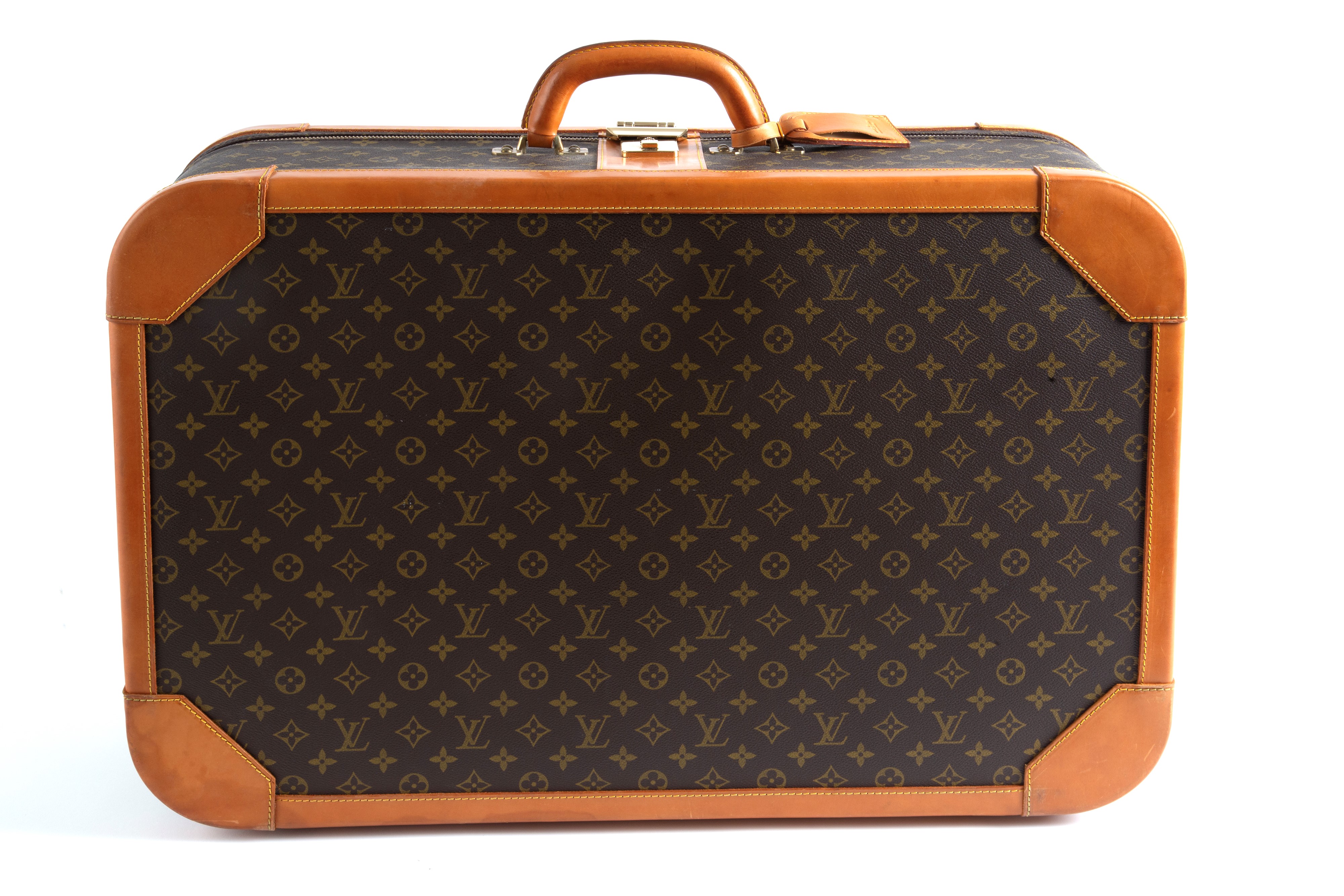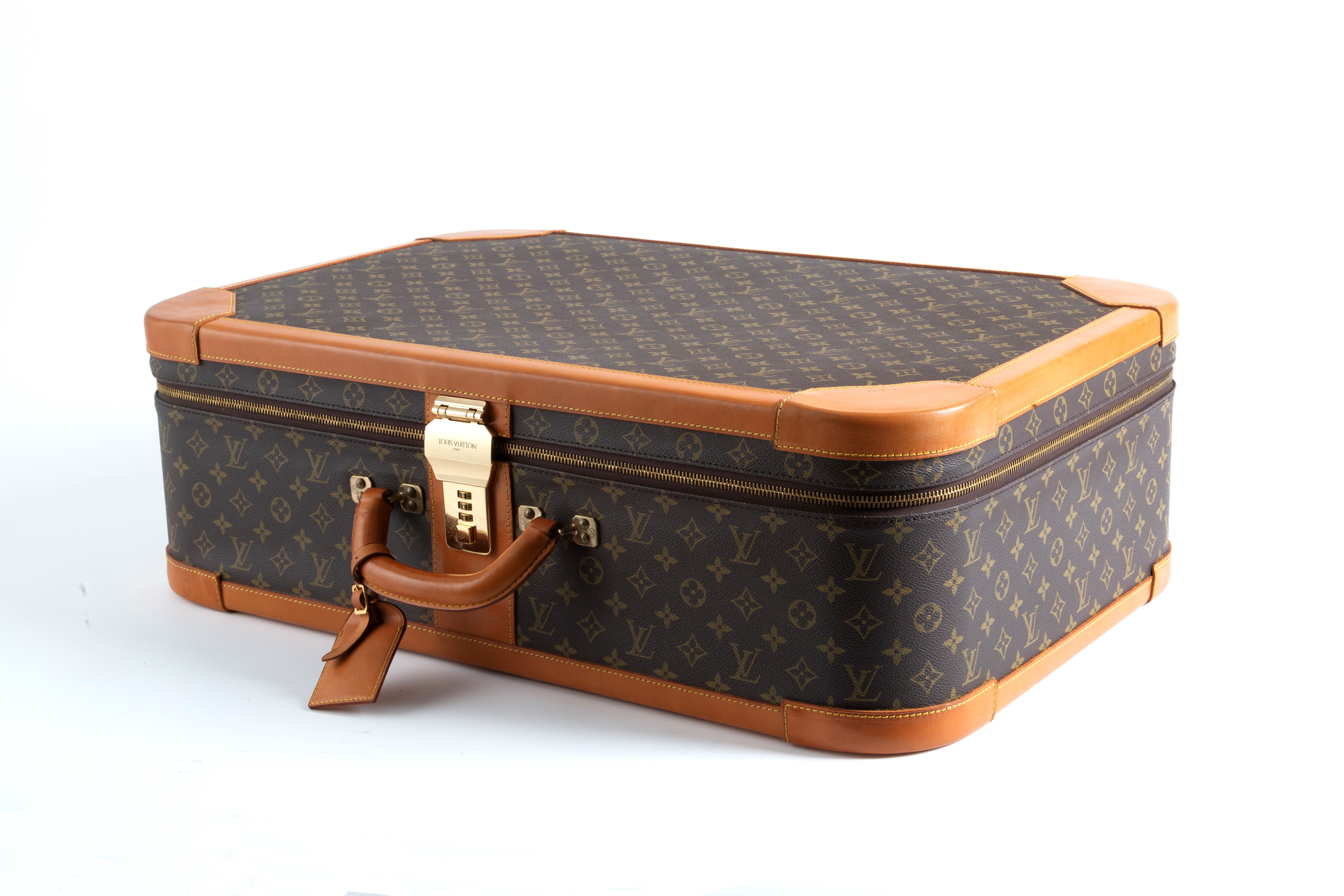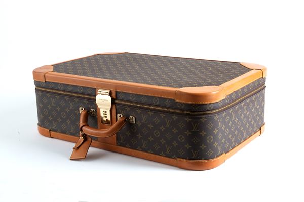 LOUIS VUITTON. Stratos suitcase with light brown leather handle, straps, and edges.
