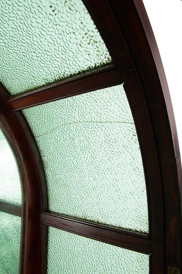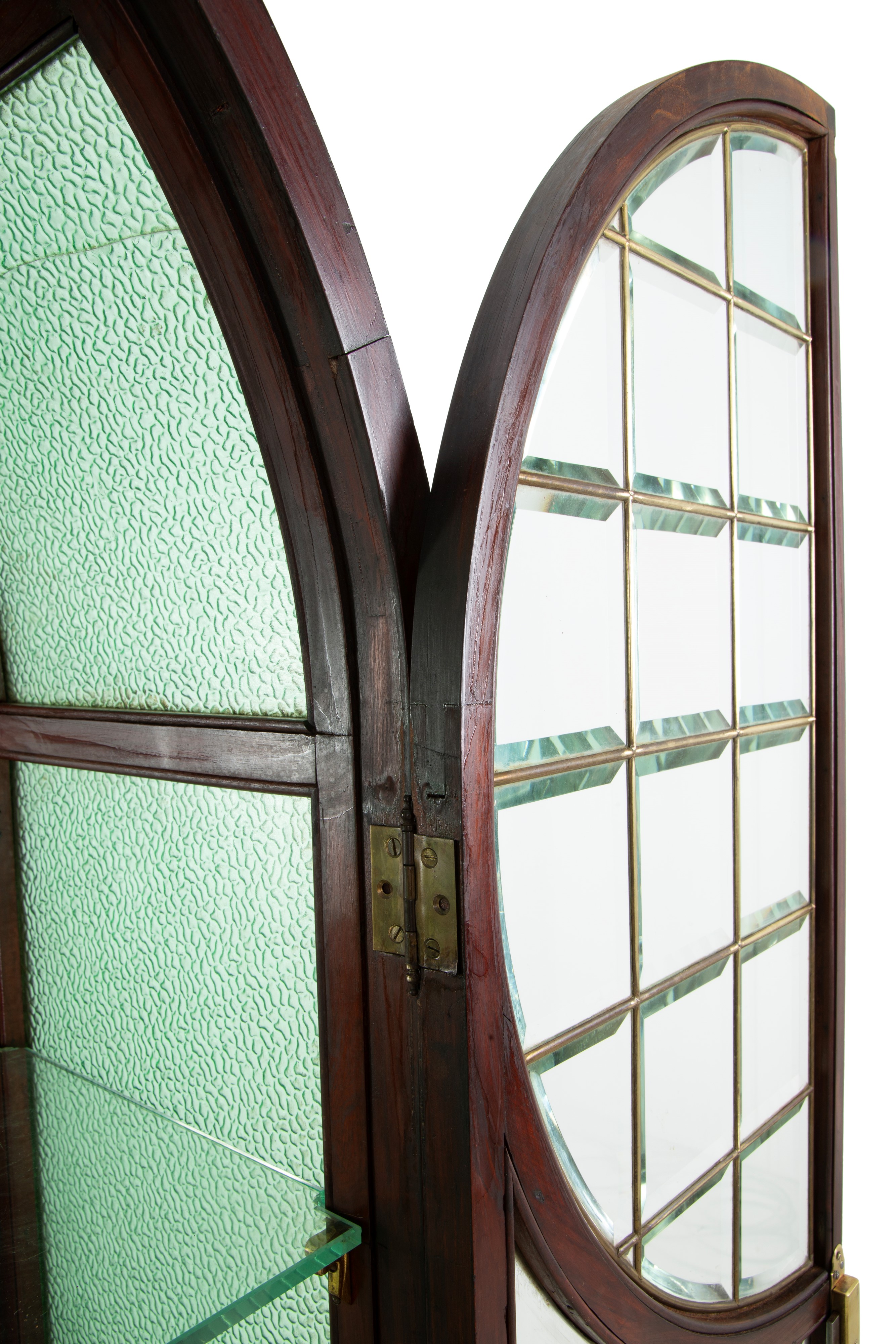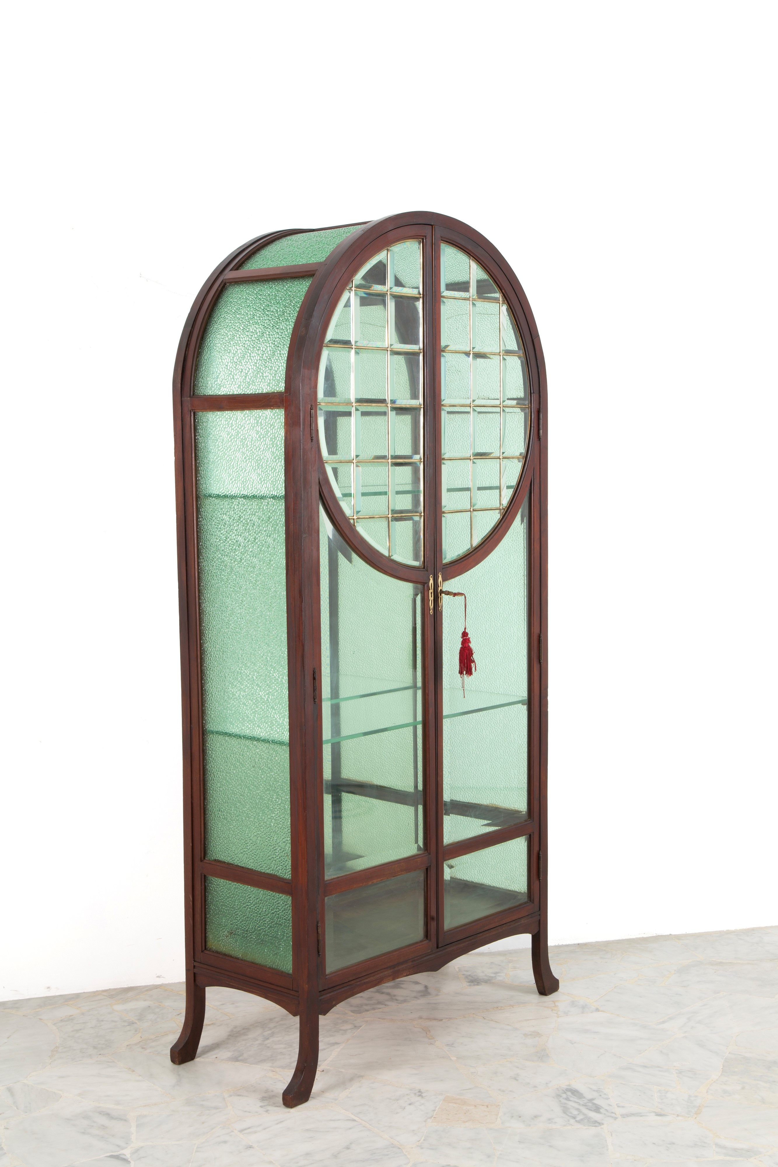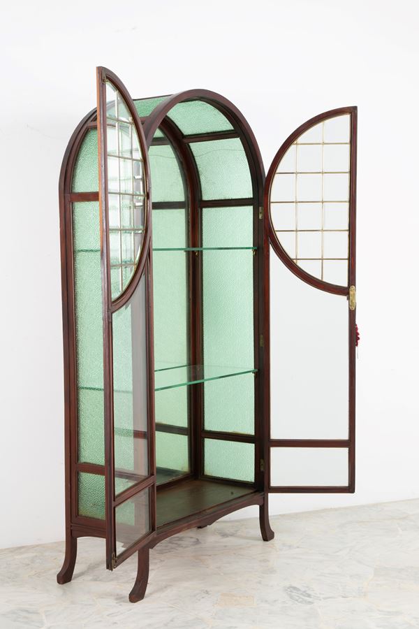 Mahogany display cabinet with green beveled glass and two glass shelves. Early 20th century. Defects.