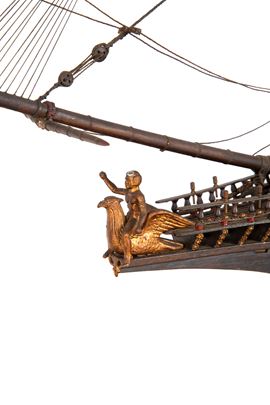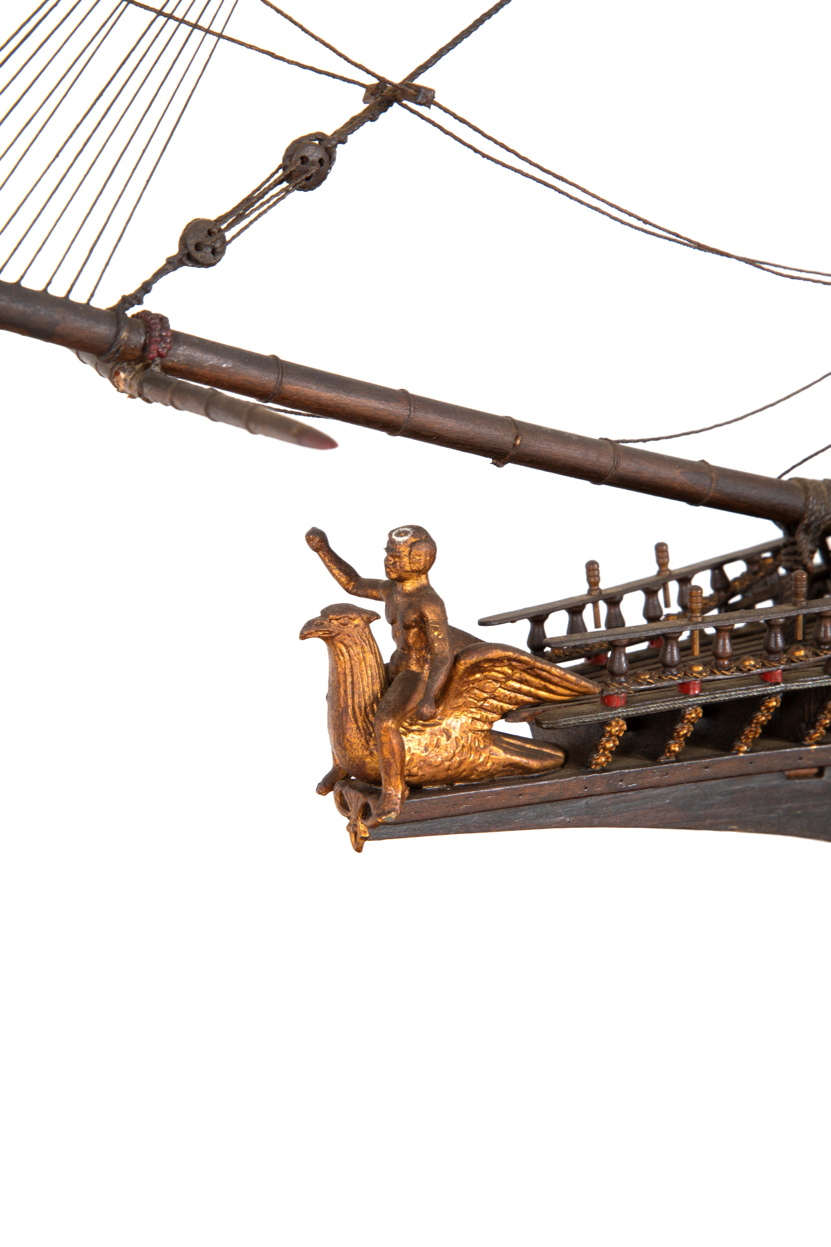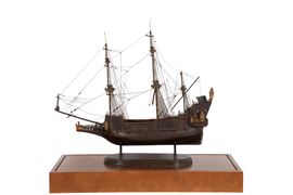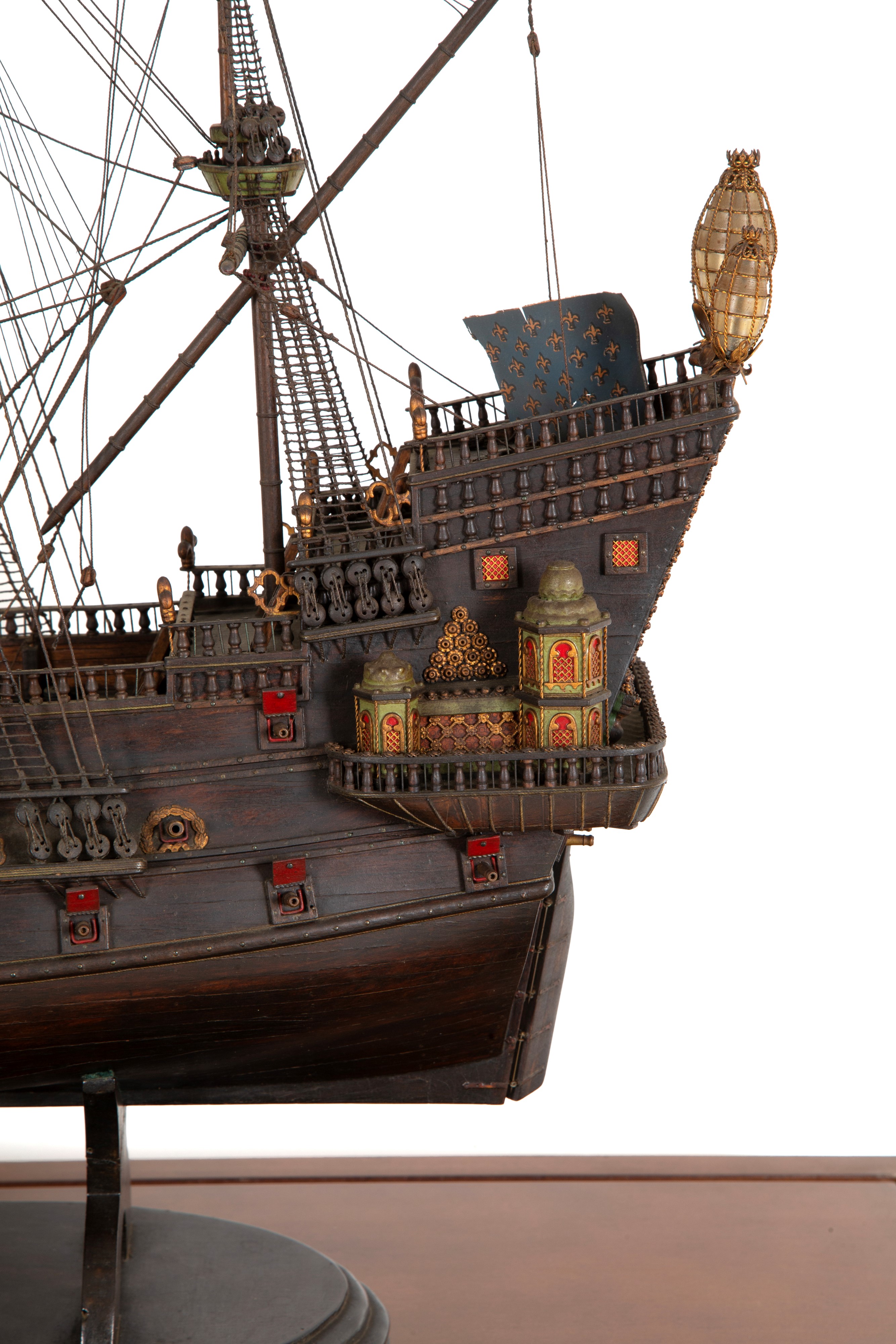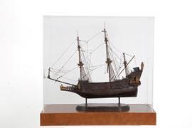Wooden model of a 17th-century French galleon. Late 19th century. In display case. Defects and missing parts.