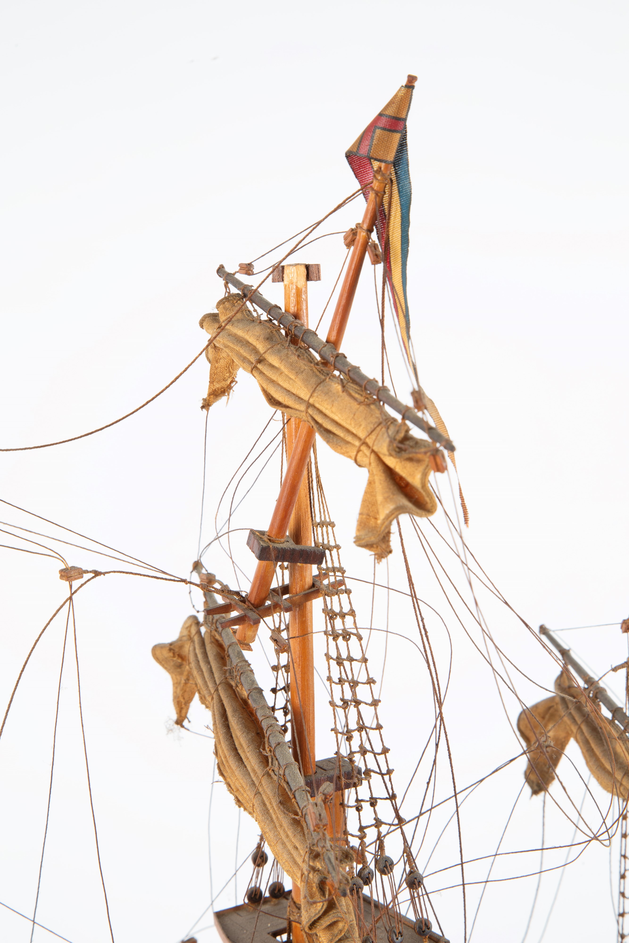 Wooden model of the English brigantine Endeavour. With plaque 'Endeavour. J. Cook's English brigantine. 1768' at the base. 20th century. Defects and missing parts.