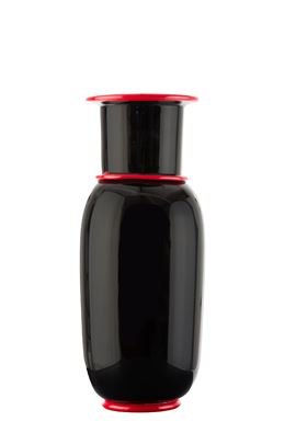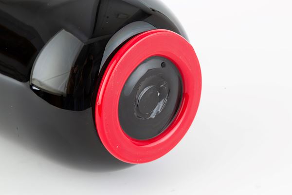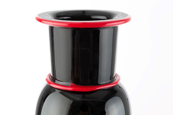 Black Murano glass vase with red trim. VENINI. Marked on the bottom.
