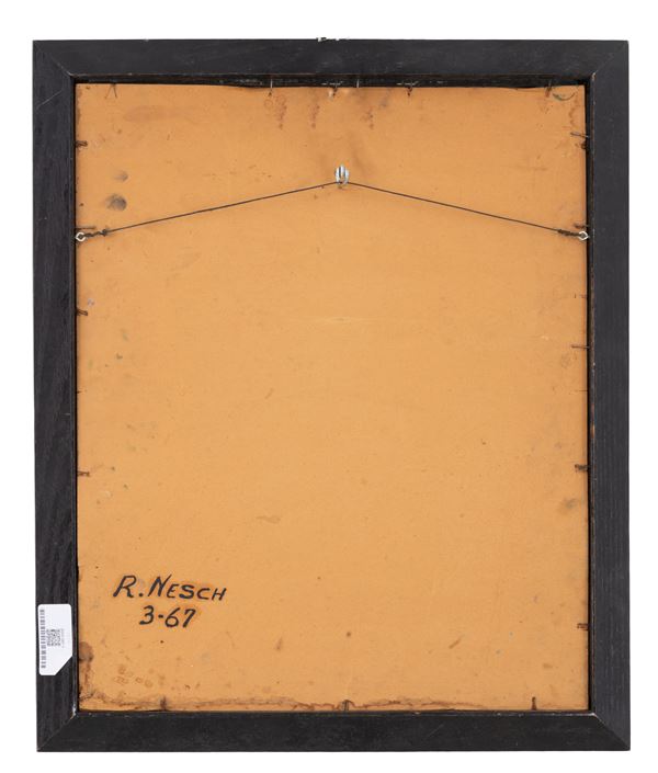 Oil painting on cardboard depicting "LANDSCAPE WITH GEISHA". Signed R. NESCH and dated 3.67 on the back. Framed. Defects.