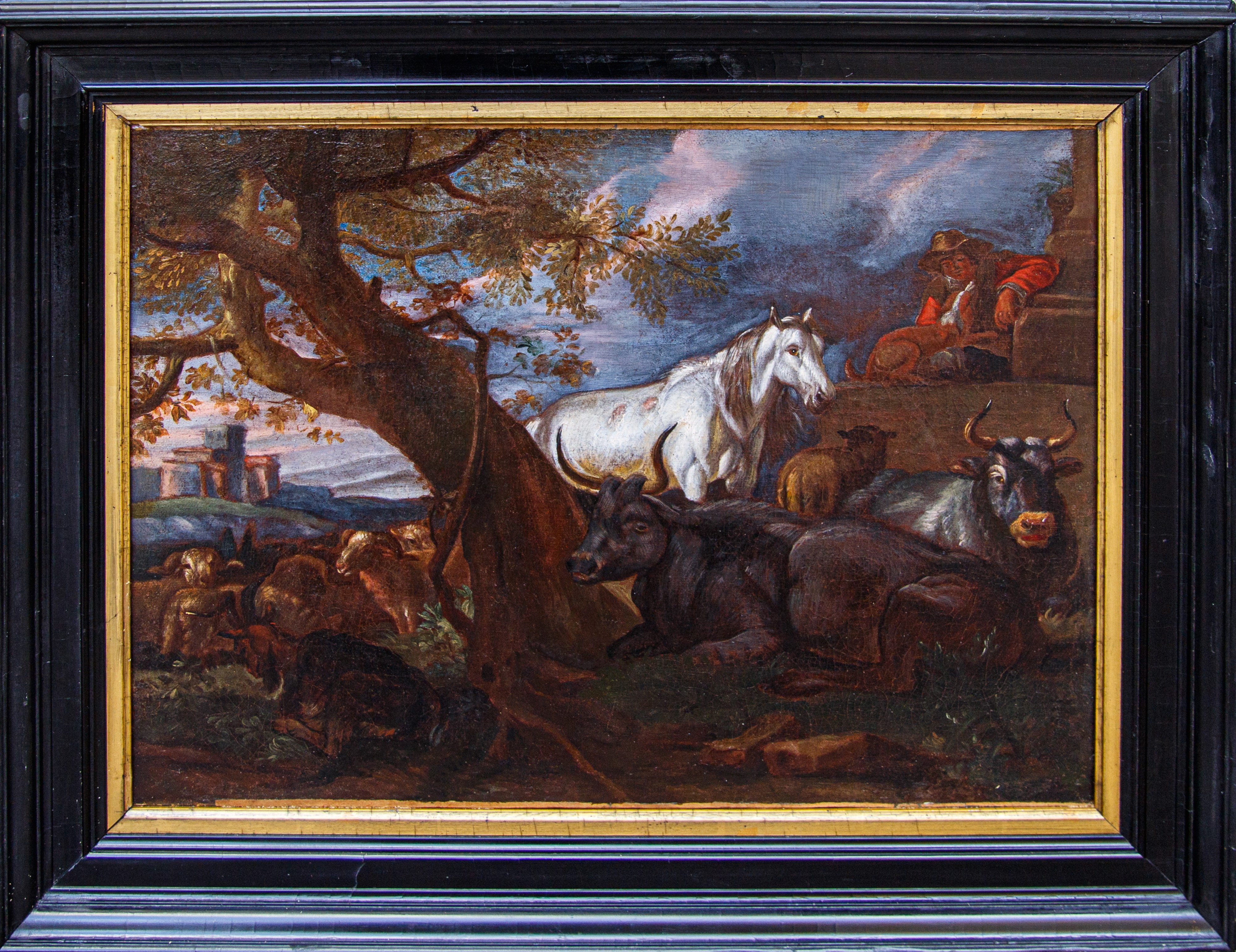 17th-CENTURY FLEMISH SCHOOL. Oil painting on canvas depicting "LANDSCAPE WITH HERD." In a lacquered wood frame. Restored. Already relined and re-stretched.