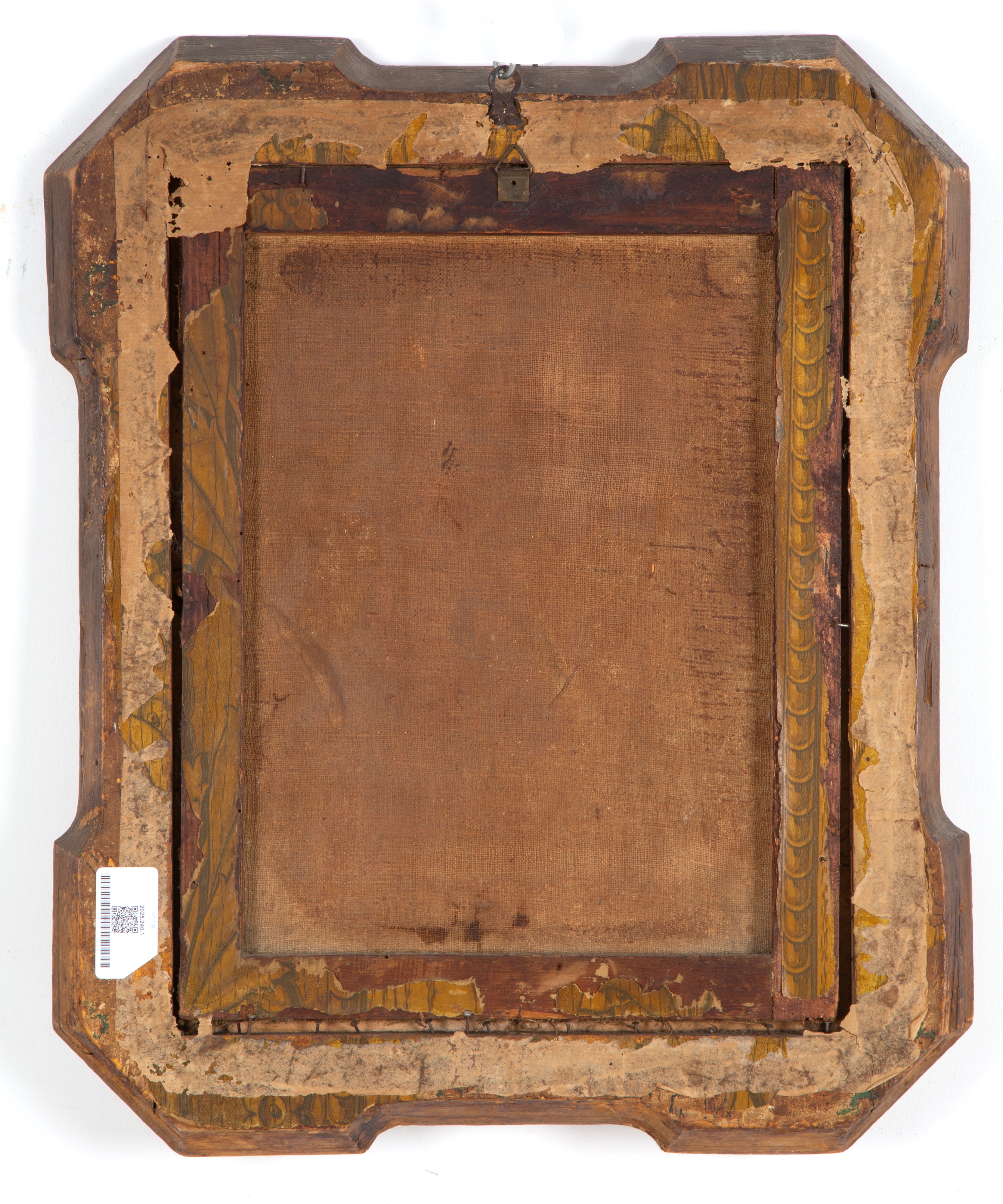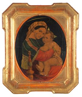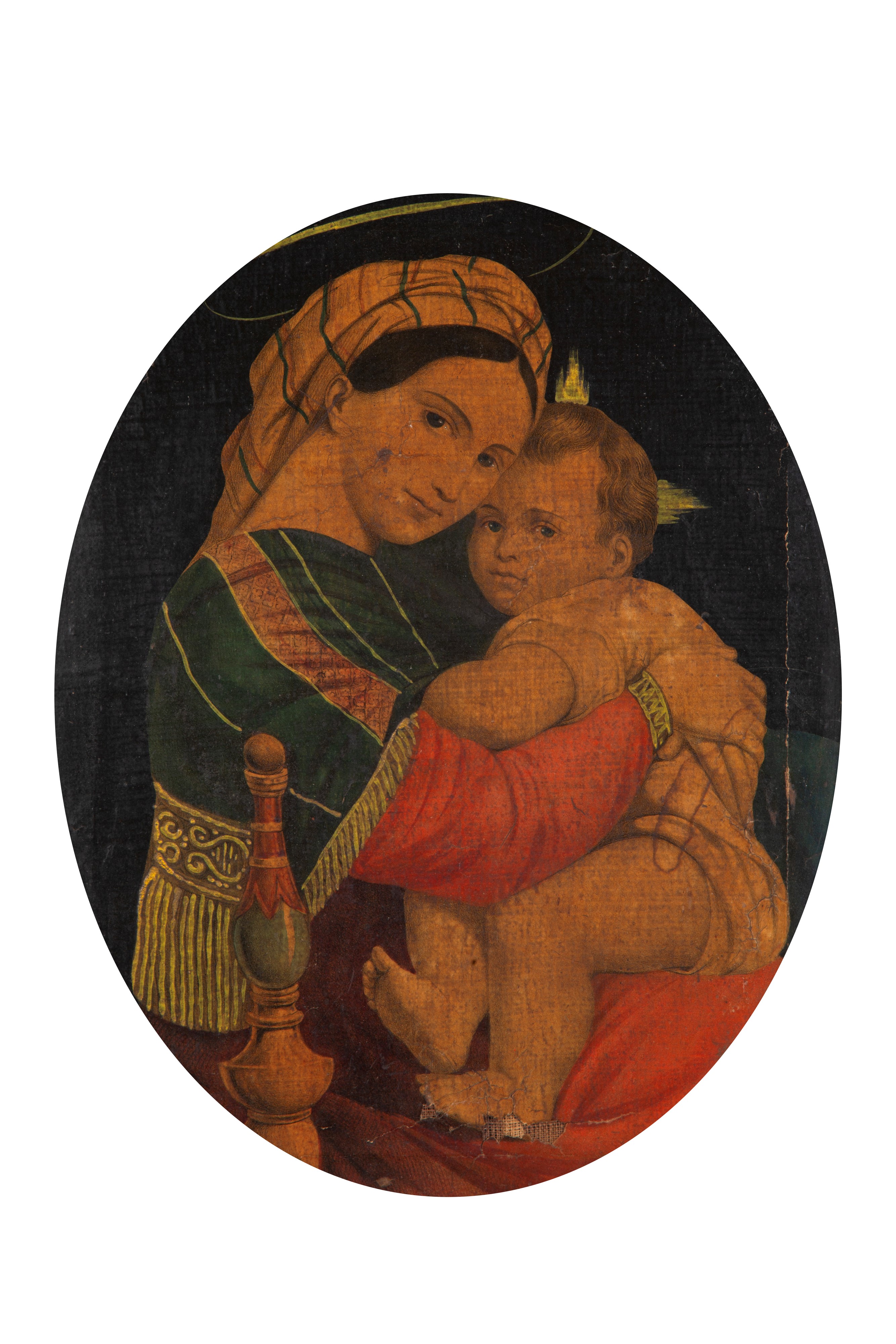 Oil painting on canvas depicting "MADONNA DELLA SEGGIOLA". 19th century. In a gilded tray frame. Defects and missing parts.