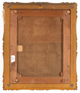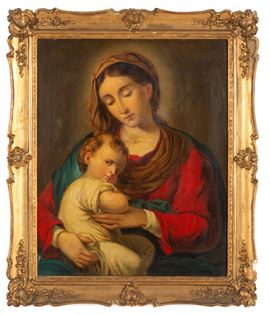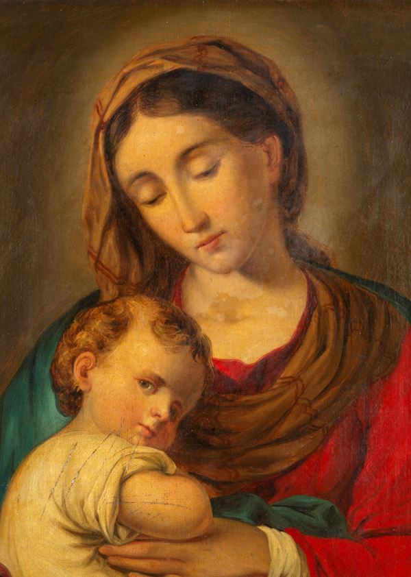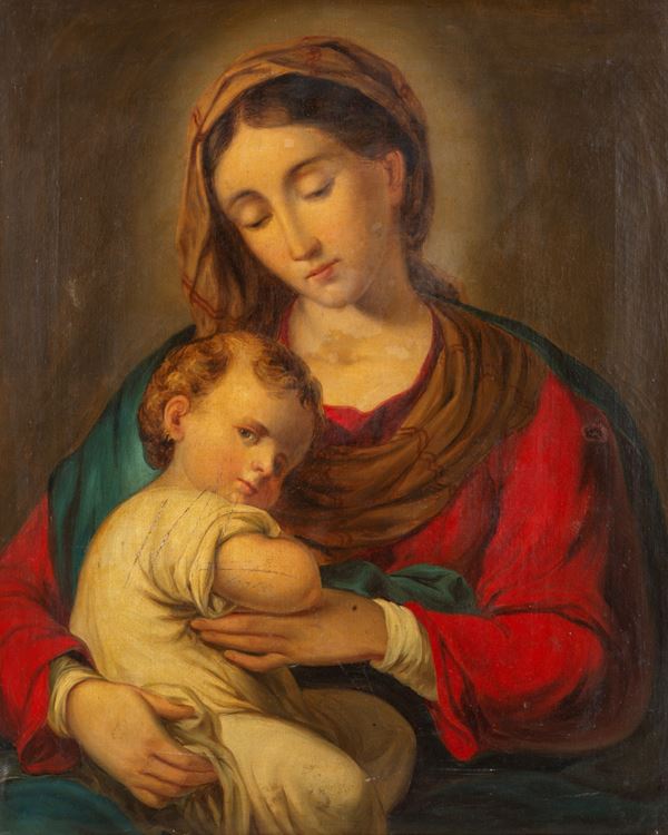 Oil painting on canvas depicting "MADONNA AND CHILD". 19th century. In a gilded frame. Defects and restorations.