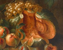 Oil painting on canvas depicting "STILL LIFE WITH PUMPLING, GRAPES AND PEACHES". 18th century. In a carved, lacquered and gilded wooden frame. Restored. Already relined and re-stretched.