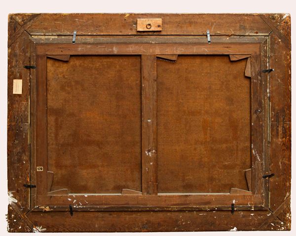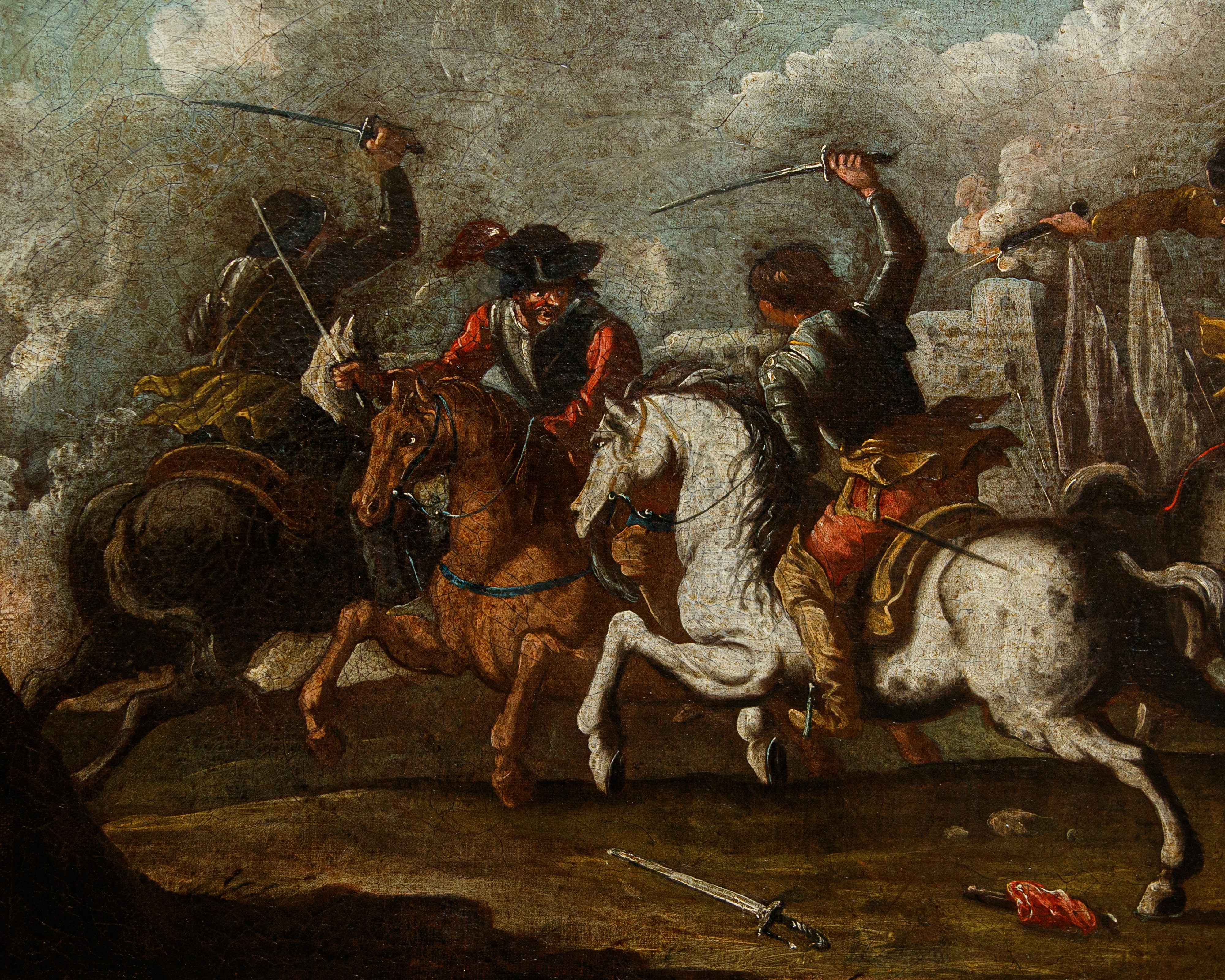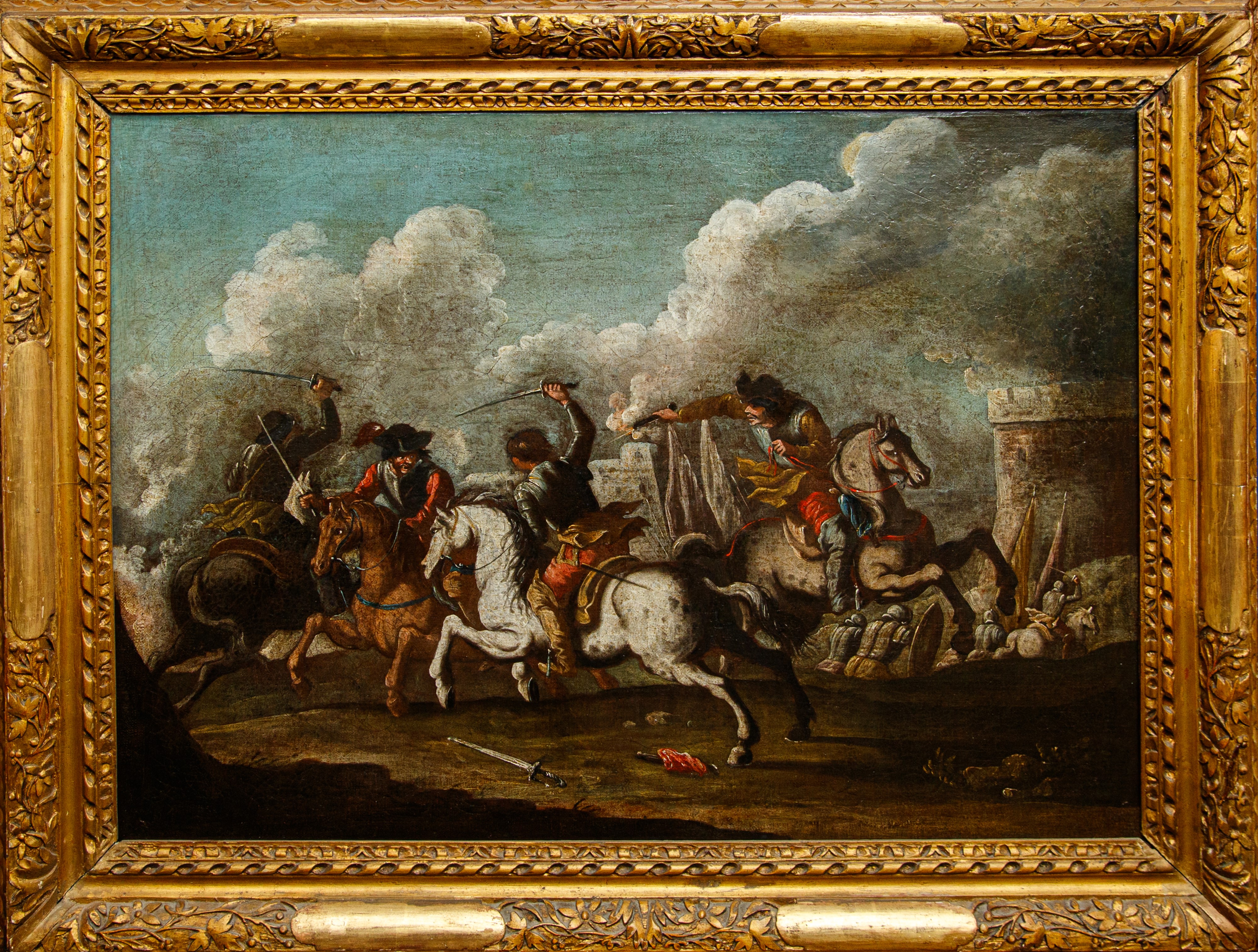 17th-CENTURY NEAPOLITAN SCHOOL. Oil painting on canvas depicting "THE BATTLE OF CERIGNOLA". In a carved and gilded wooden frame. Defects and restorations. Already relined and re-stretched.