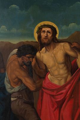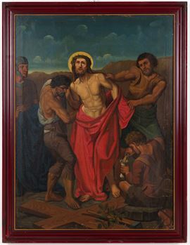 Oil painting on canvas depicting "VIA CRUCIS. STATION X". Late 18th-early 19th century. Framed. Already re-stretched and re-lined.