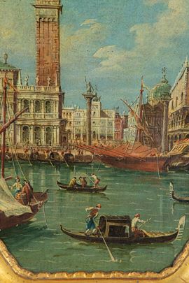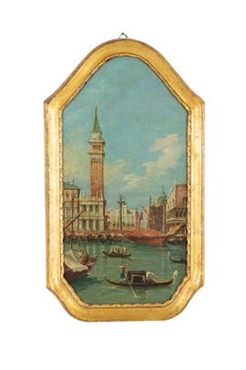 Oil on canvas depicting "VIEW OF SAN MARCO BASIN". Mid-19th century. In a gilded wooden frame.