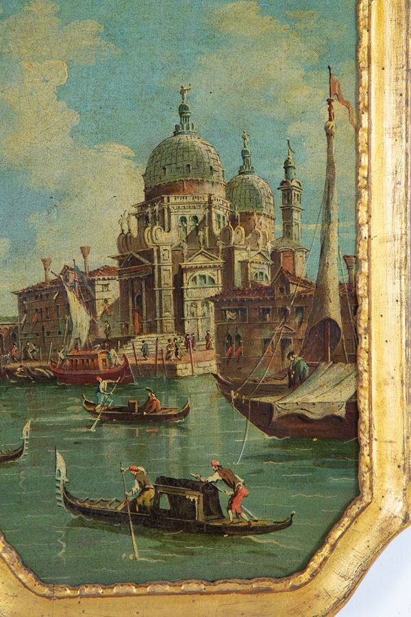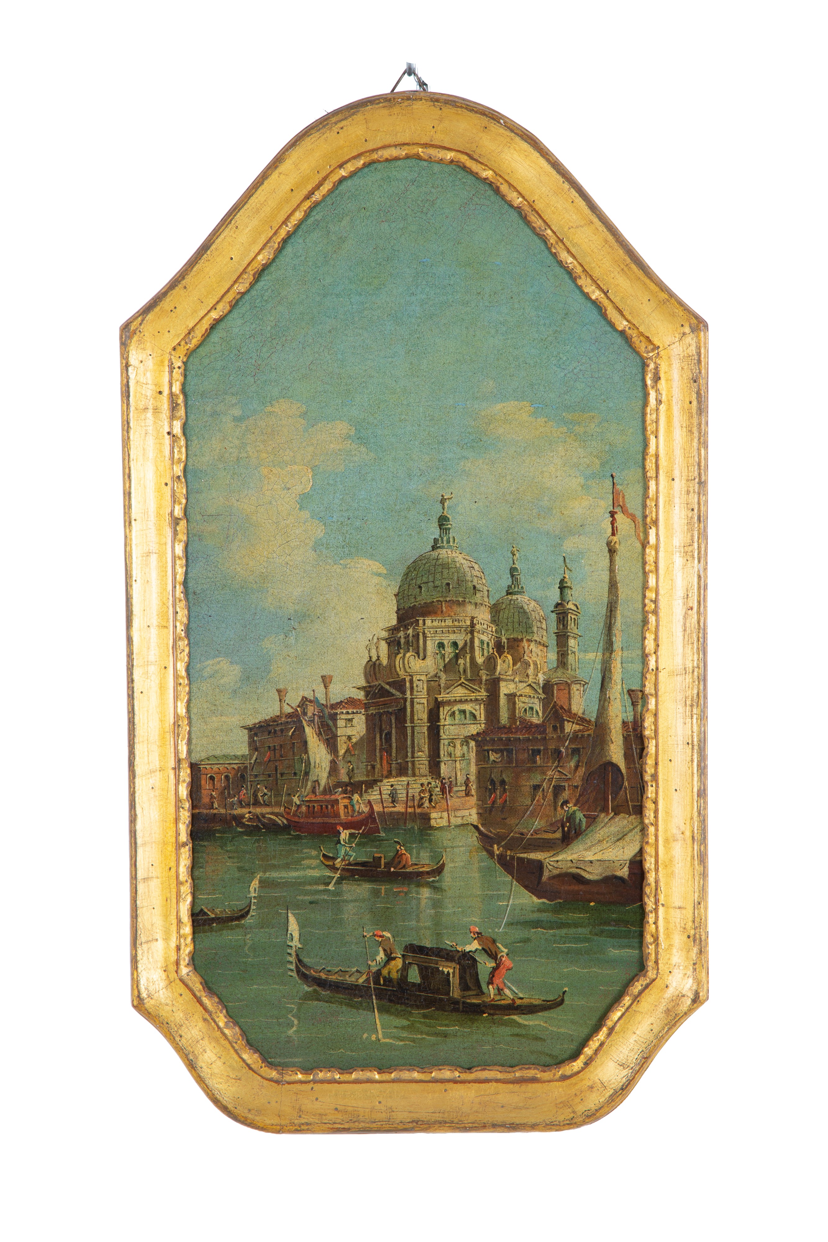 Oil painting on canvas depicting "VIEW OF THE BASILICA OF SANTA MARIA DELLA SALUTE". Mid-19th century. In a gilded wooden frame.