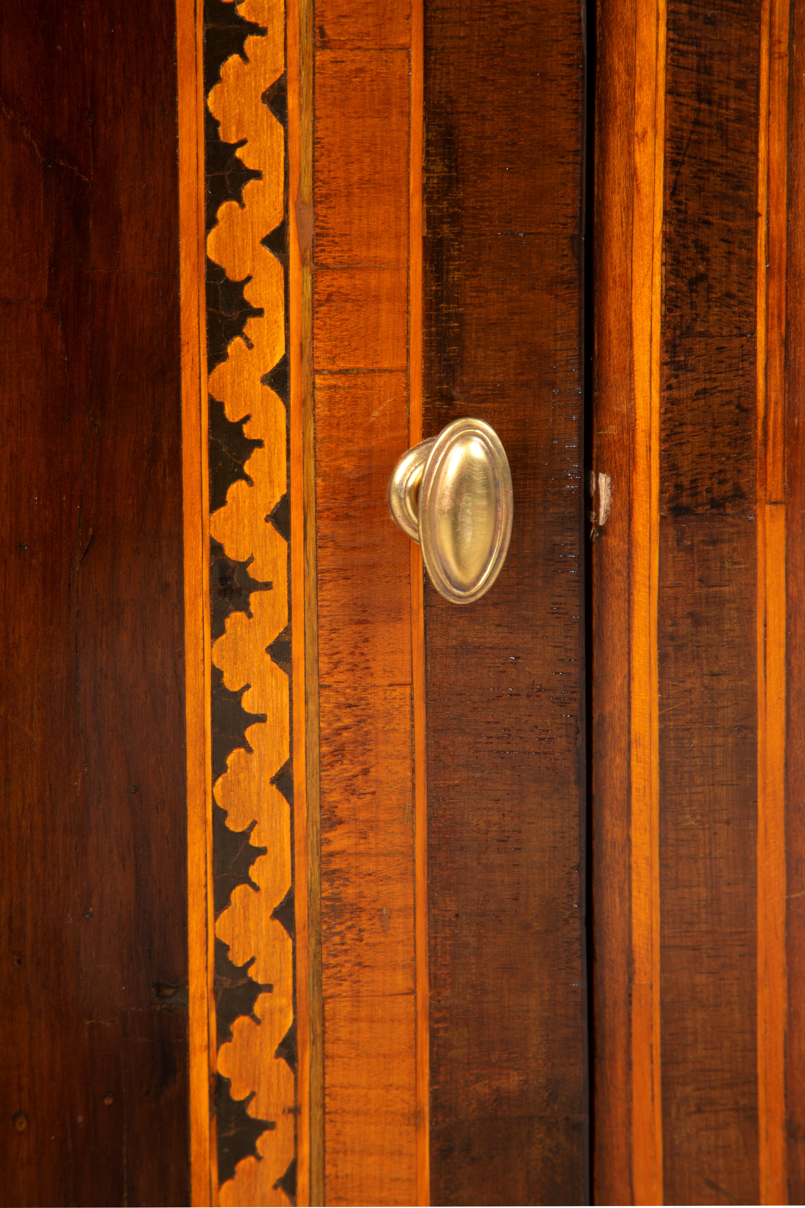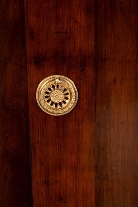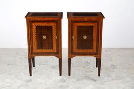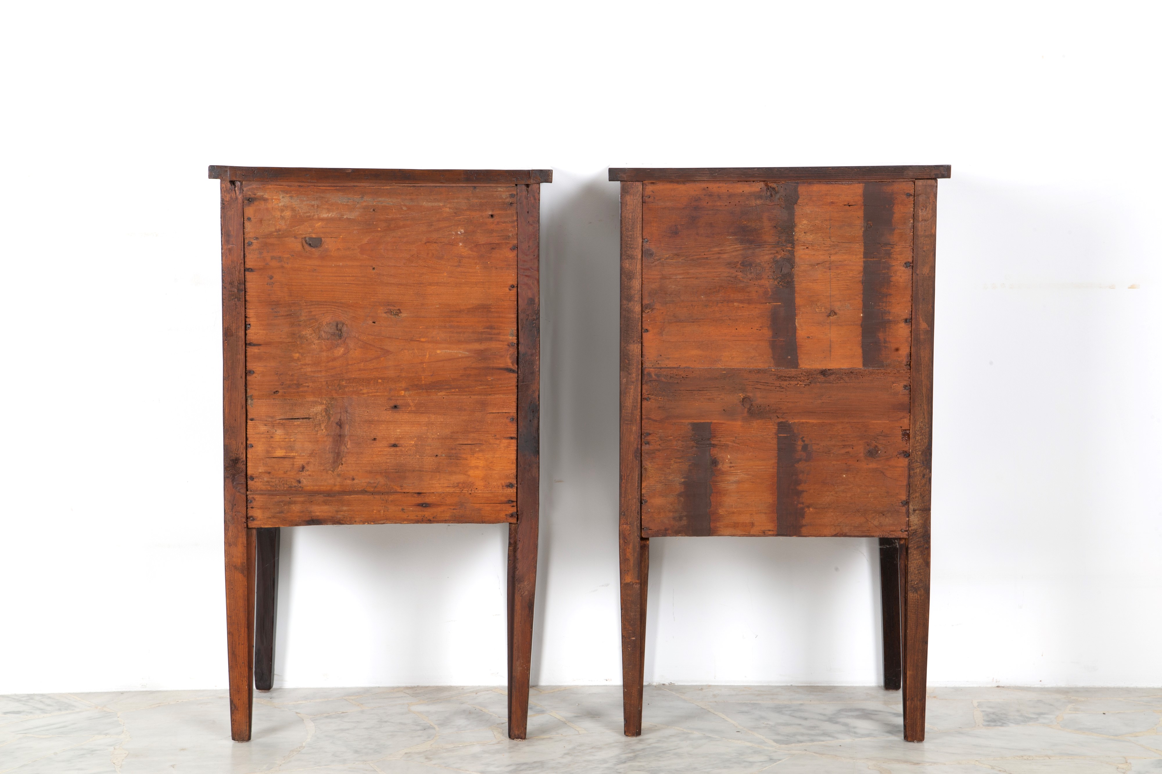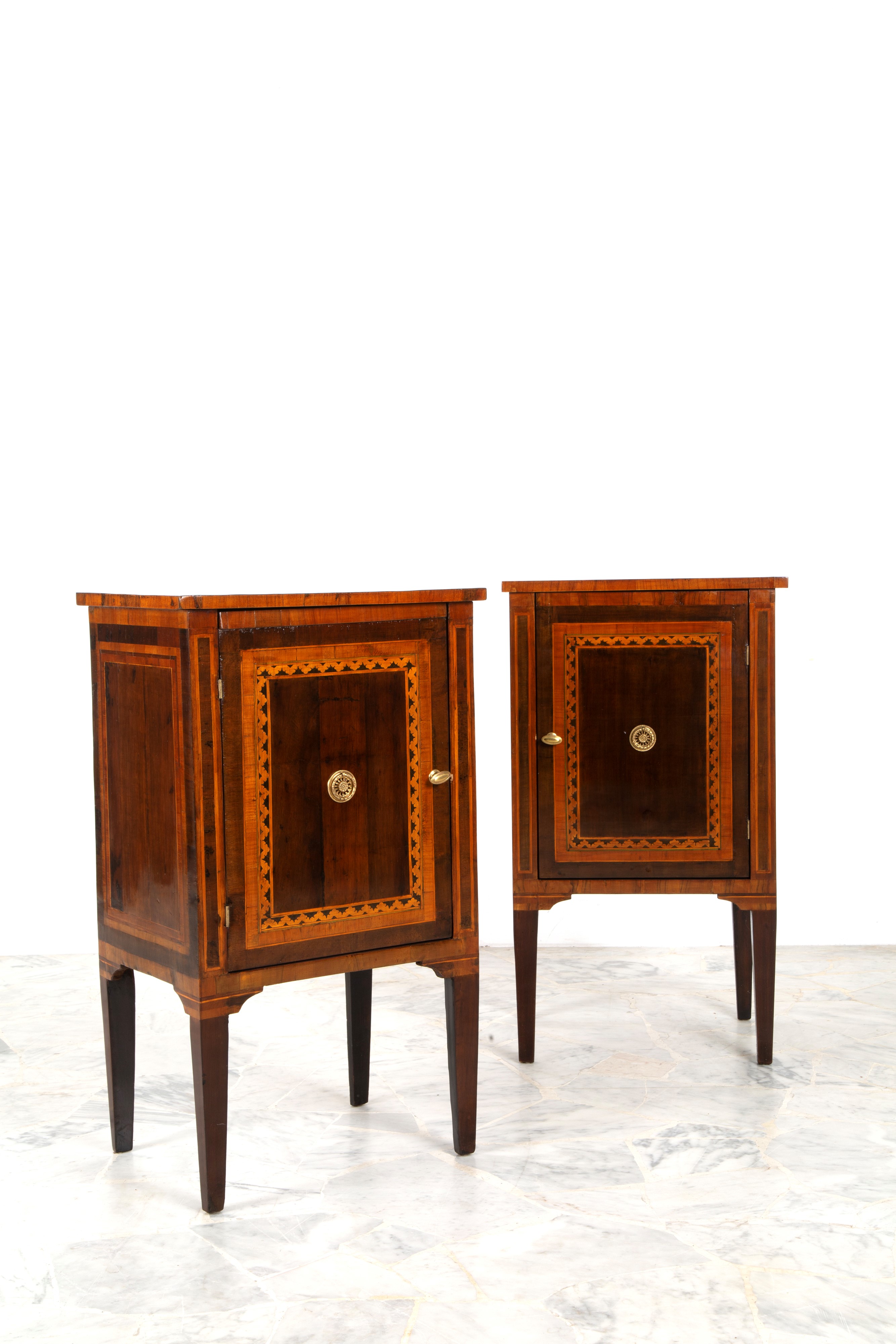 Pair of Louis XVI bedside tables, veneered and trimmed in various woods with gilded bronze handles. First half of the 19th century. Minor defects.