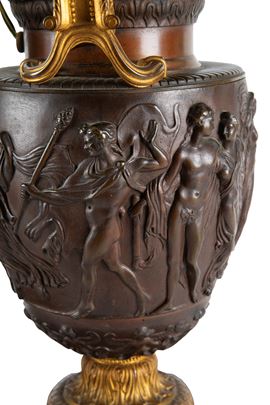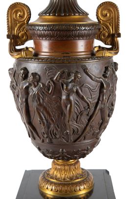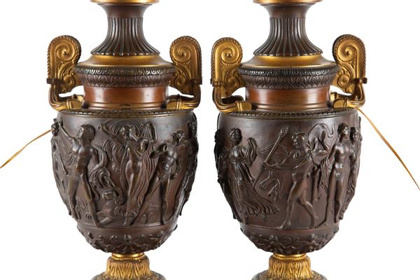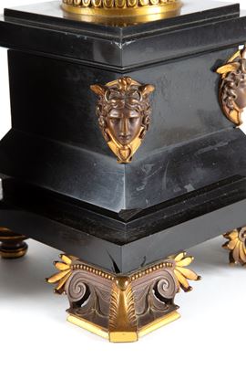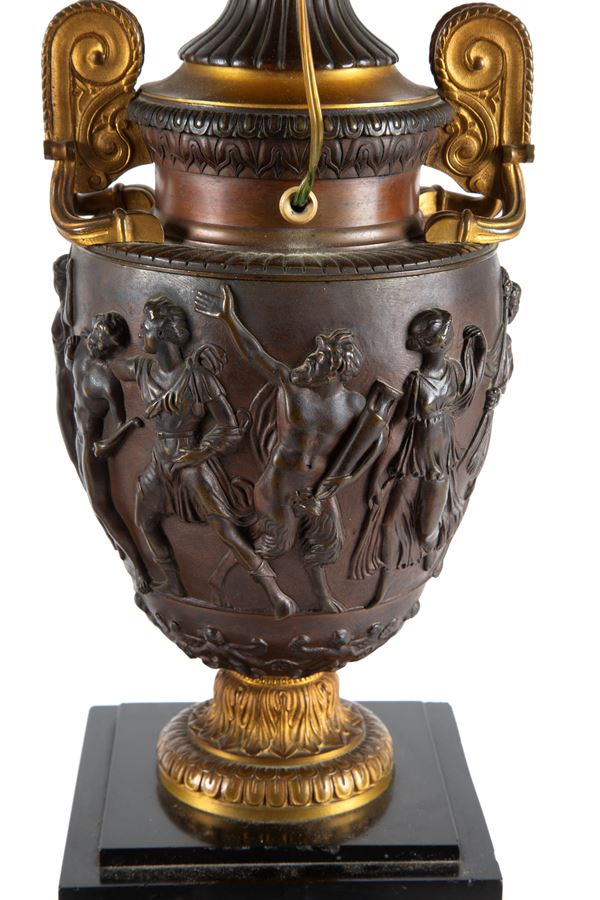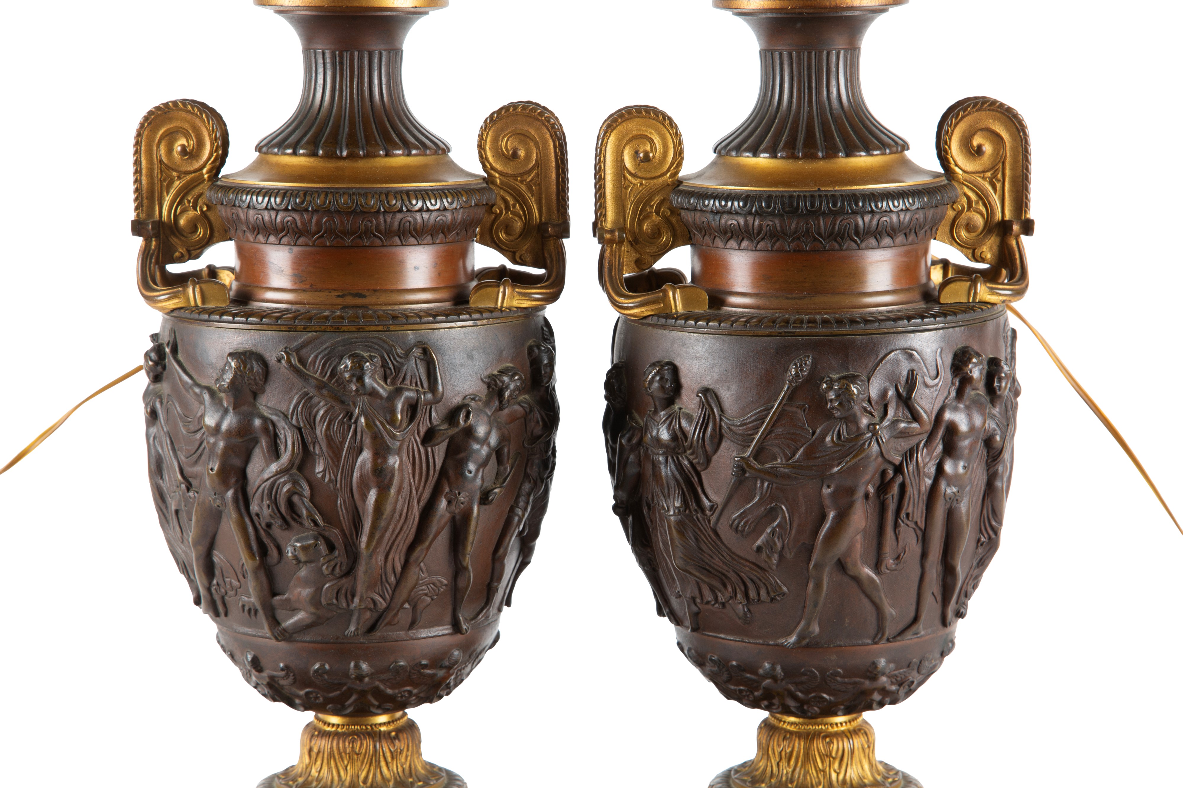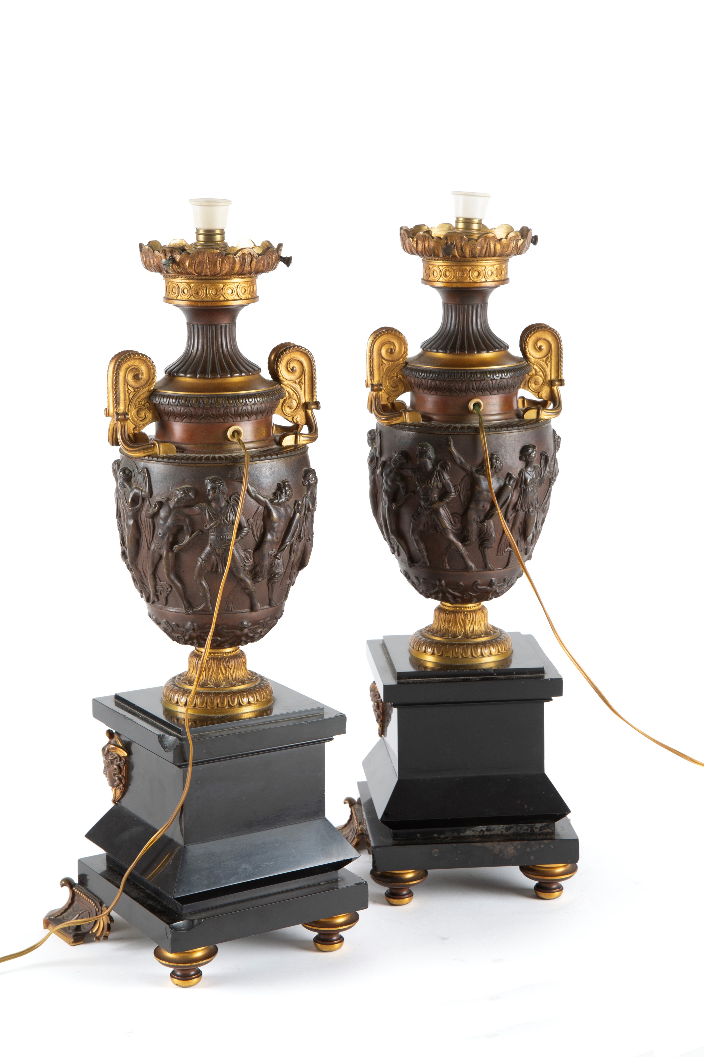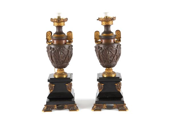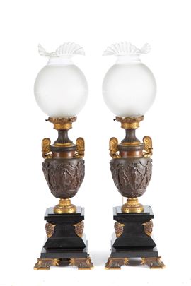 Pair of patinated gilt bronze lamps with Belgian black marble bases and glass bowls. 19th century.