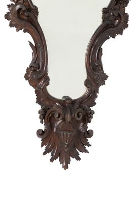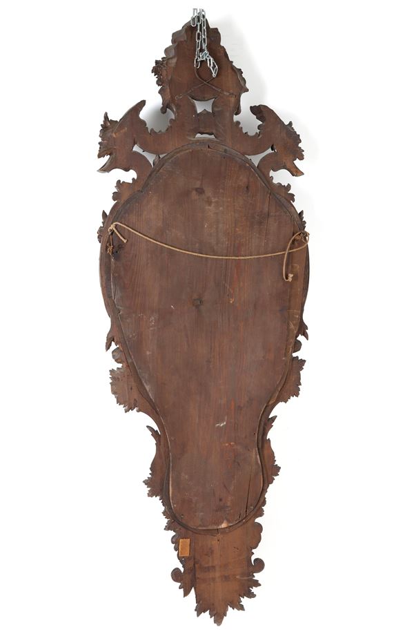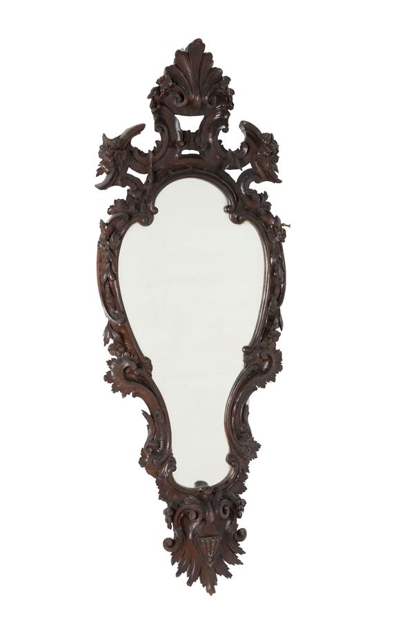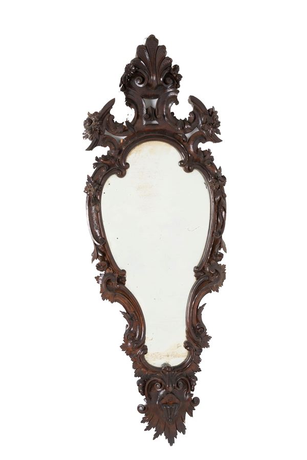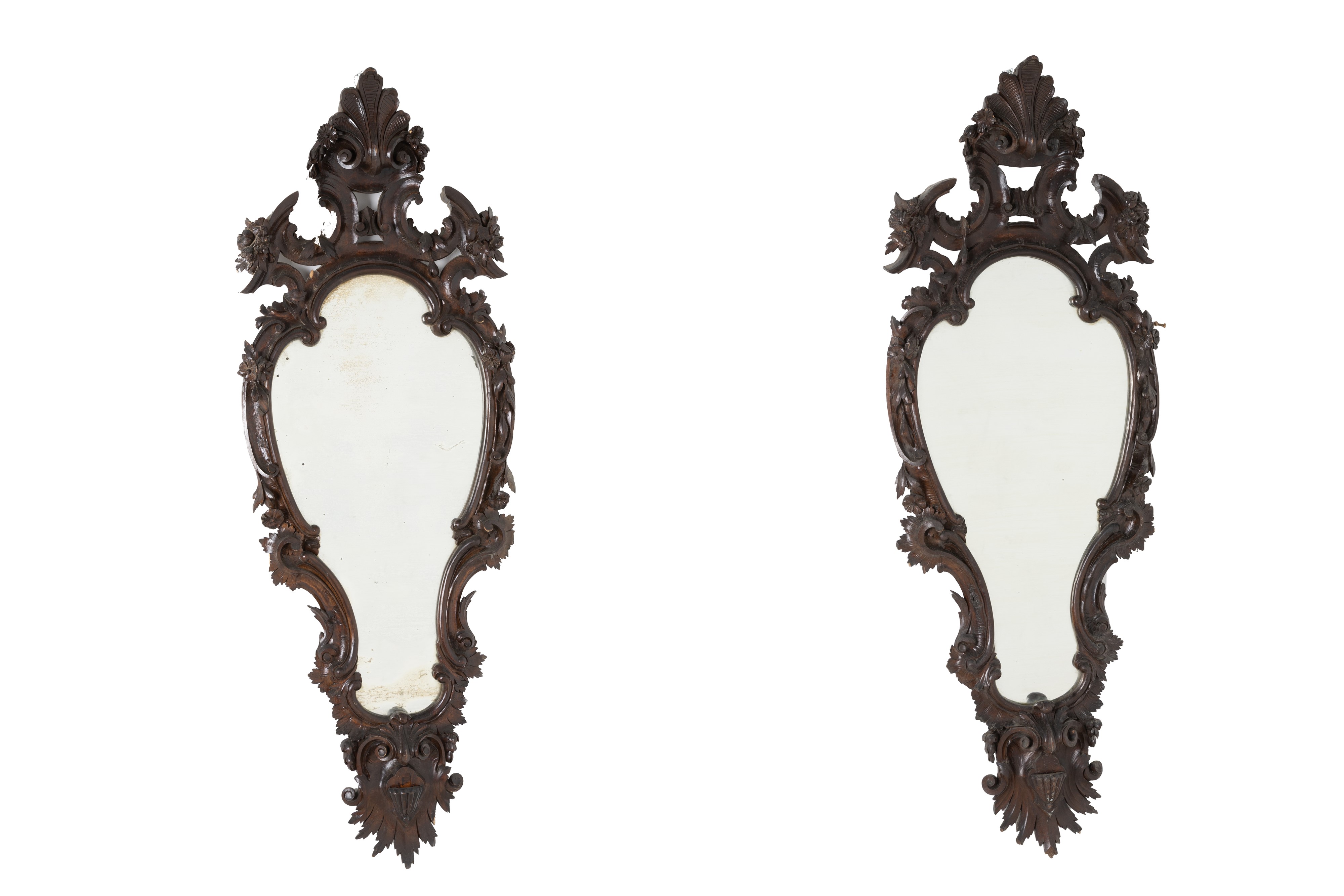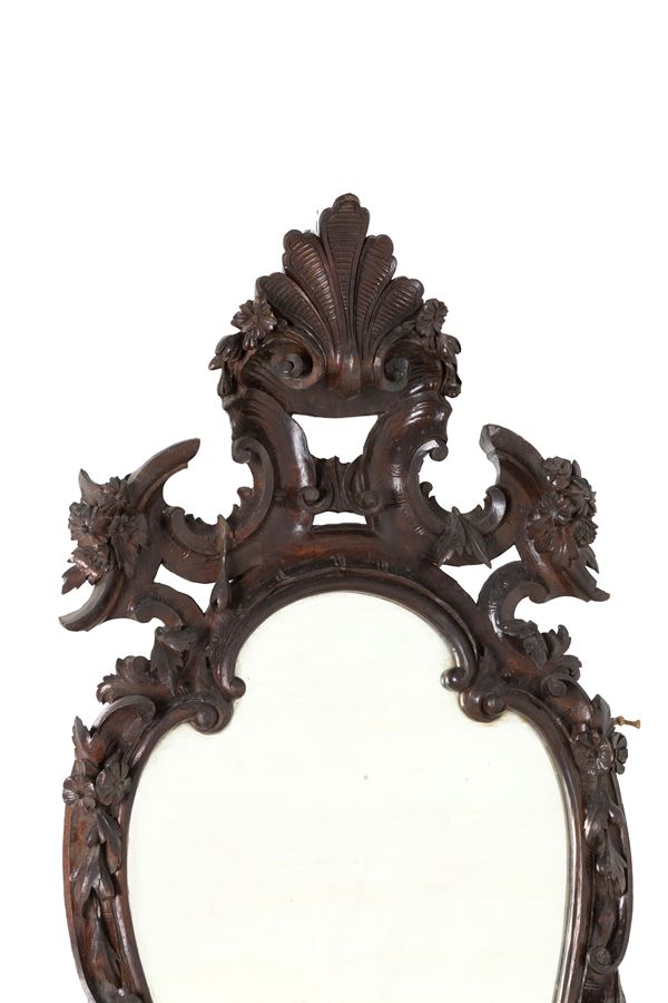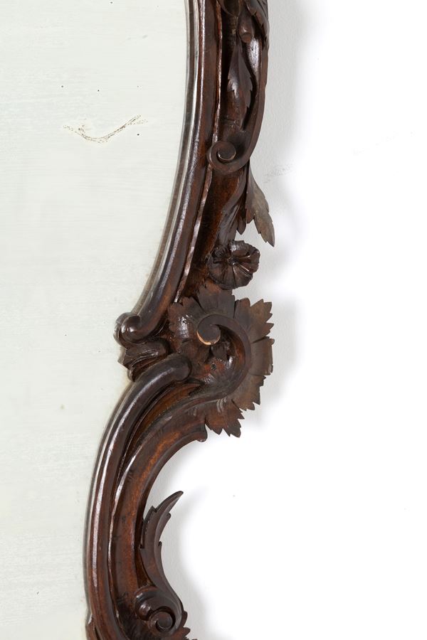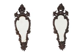 Pair of carved and stained wooden mirrors. 19th century. Minor defects.