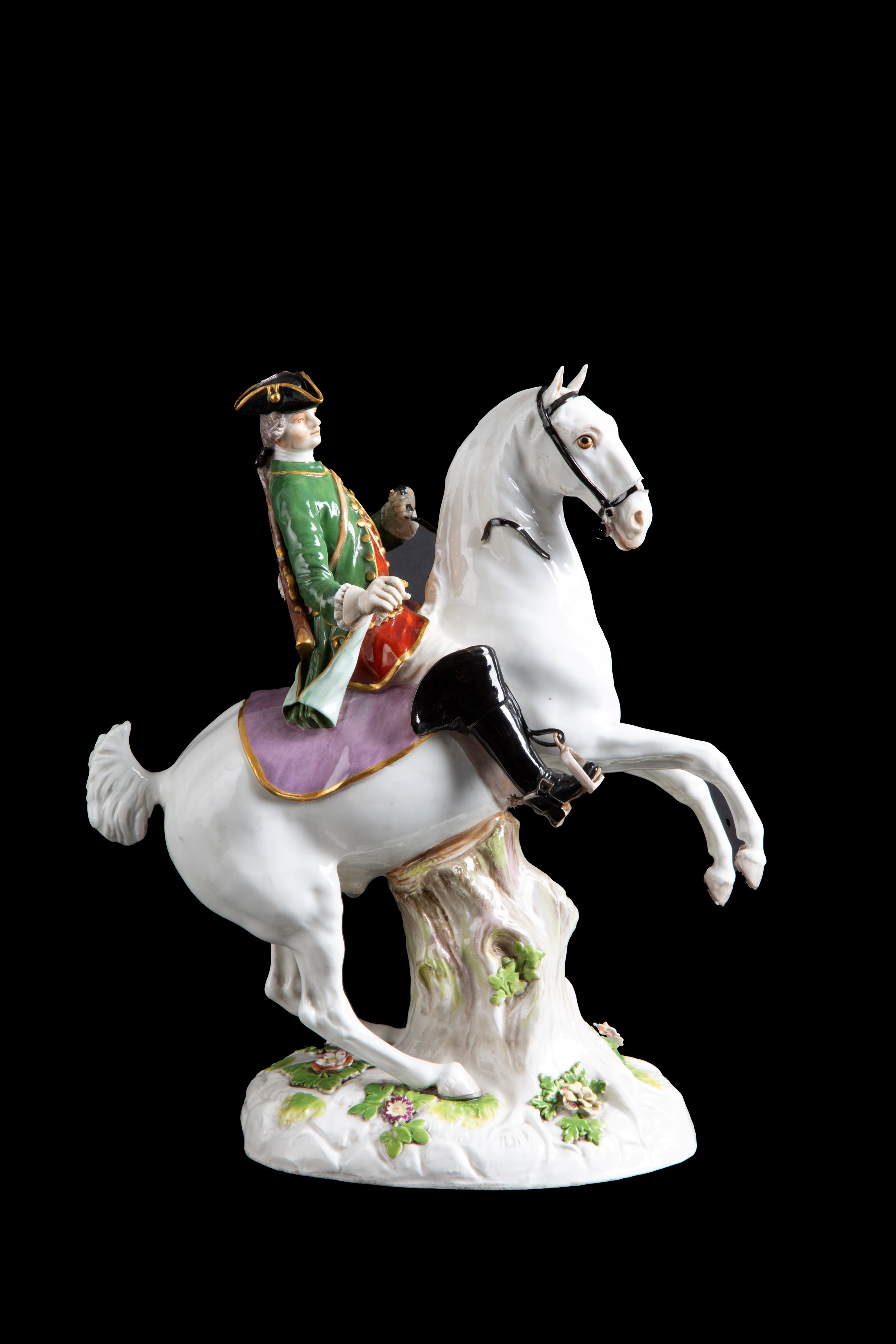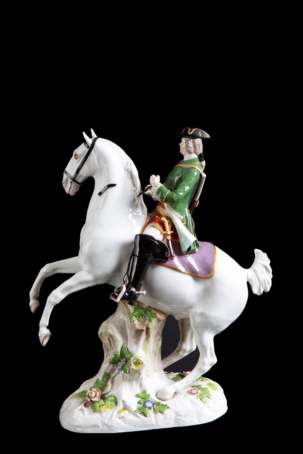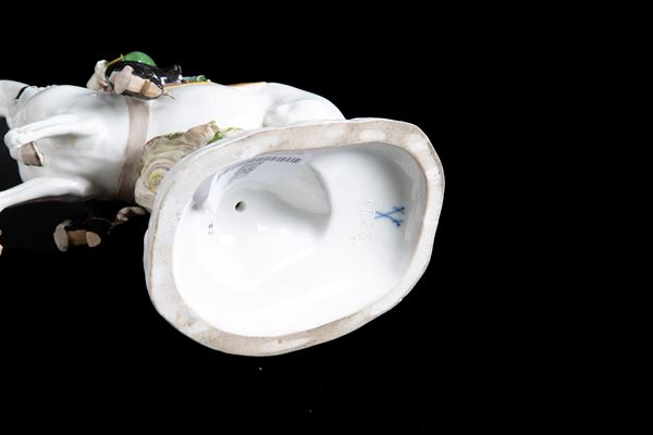 Polychrome porcelain sculpture depicting "GENTMAN ON HORSE". MEISSEN manufacture. Marked on the bottom. 20th century. Minor losses.