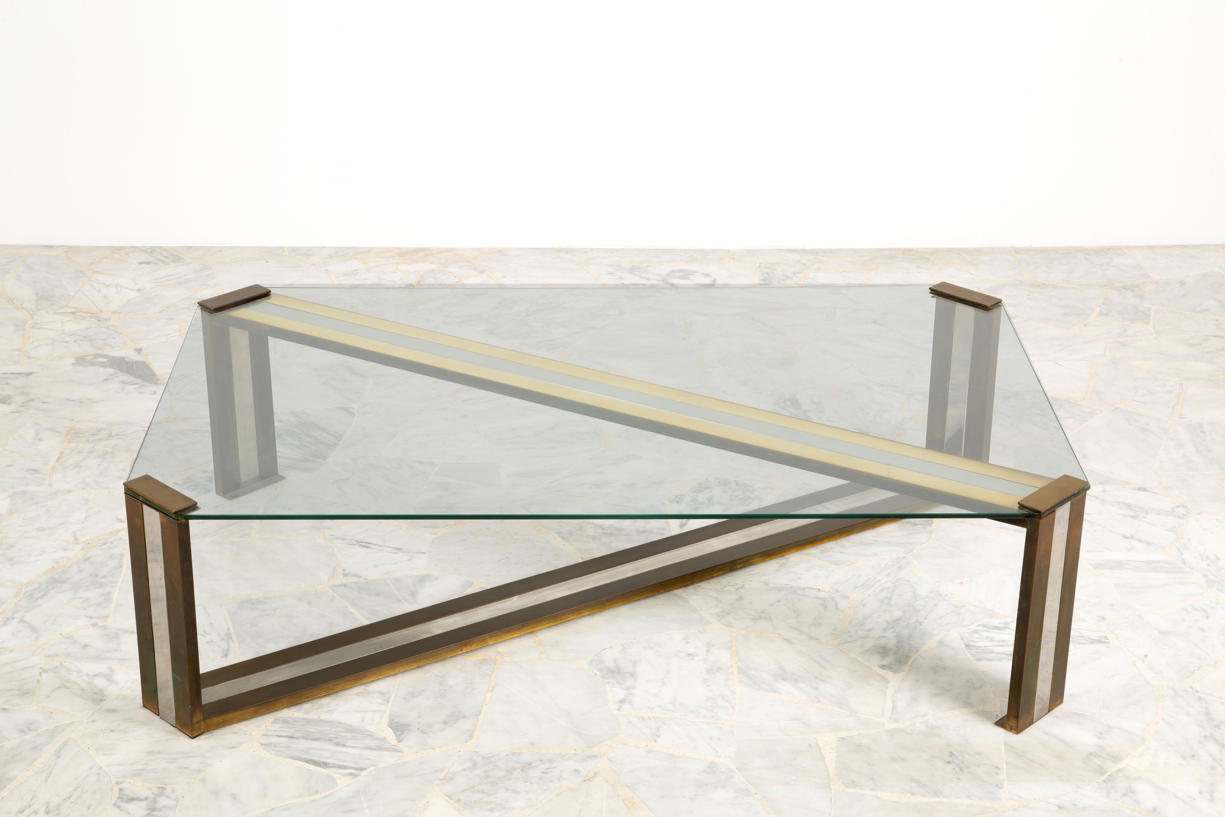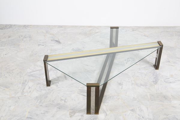 Brass, steel, and glass coffee table. 1970s. Defects.