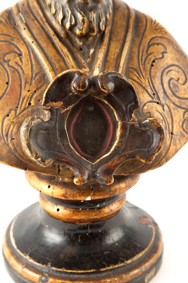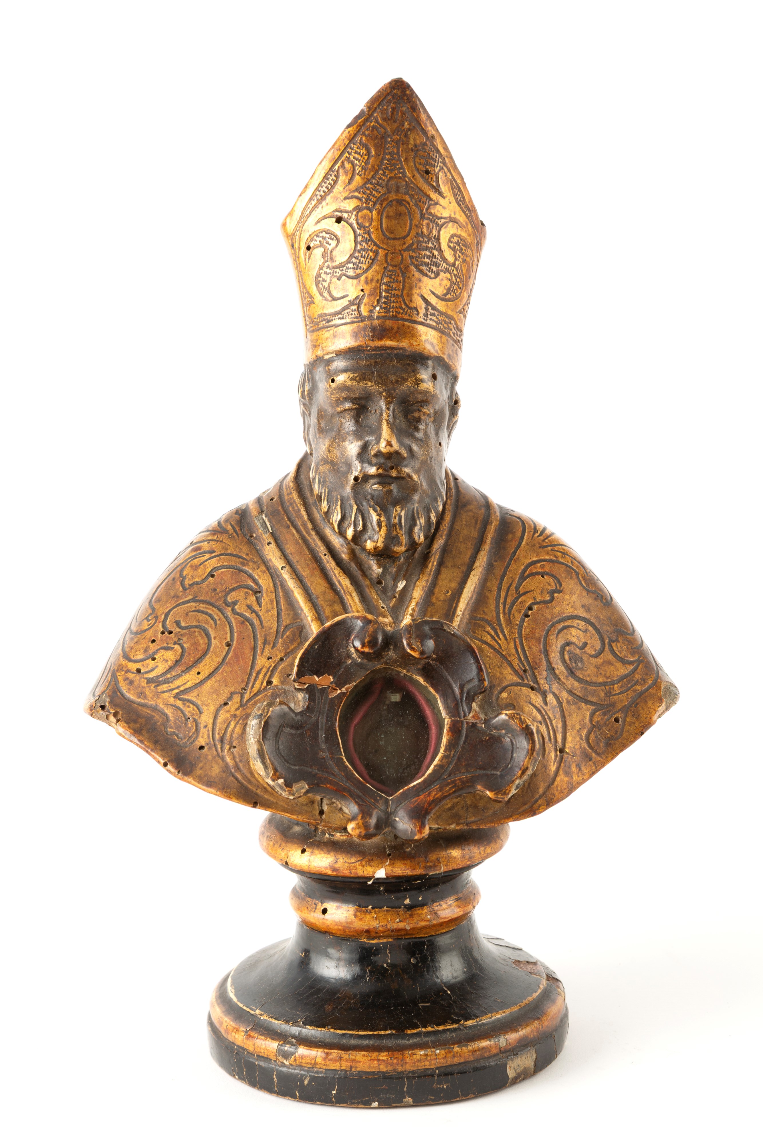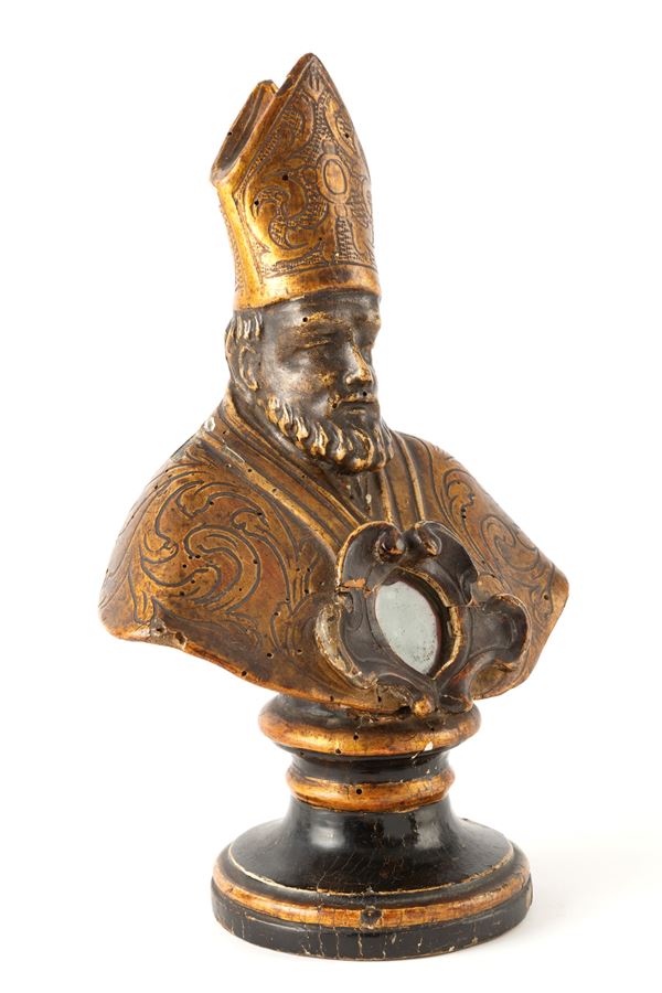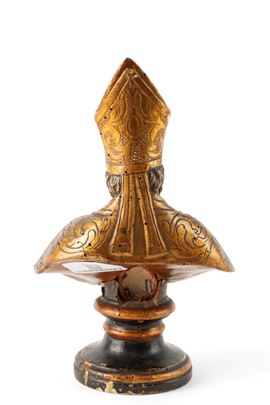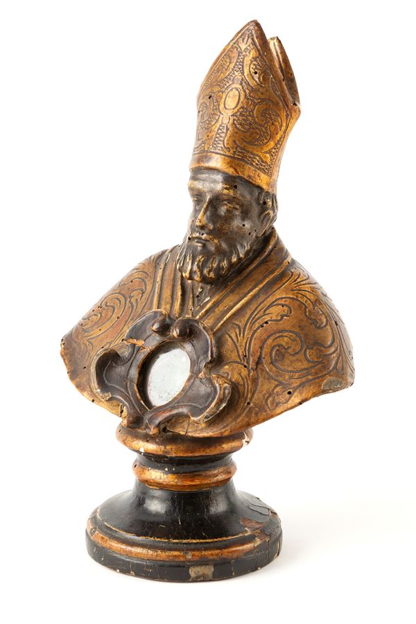 Carved, silvered and gilded wooden reliquary bust depicting "BISHOP". 17th century. Minor defects.