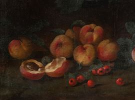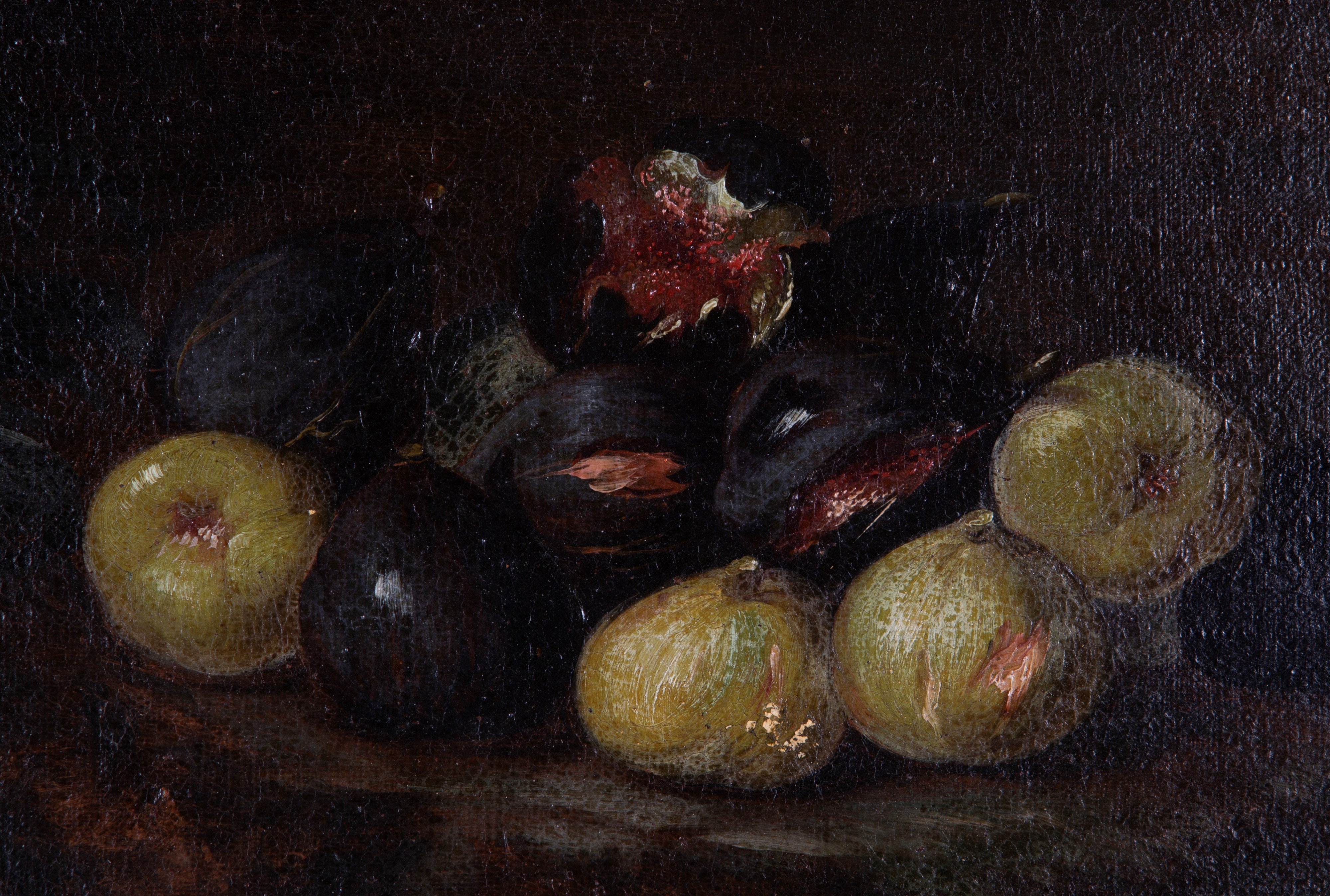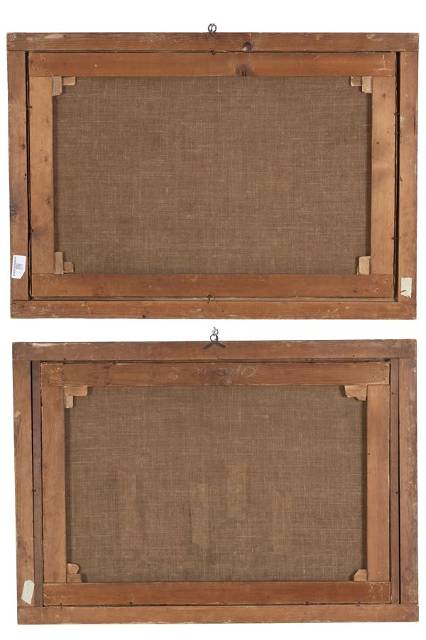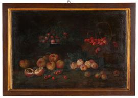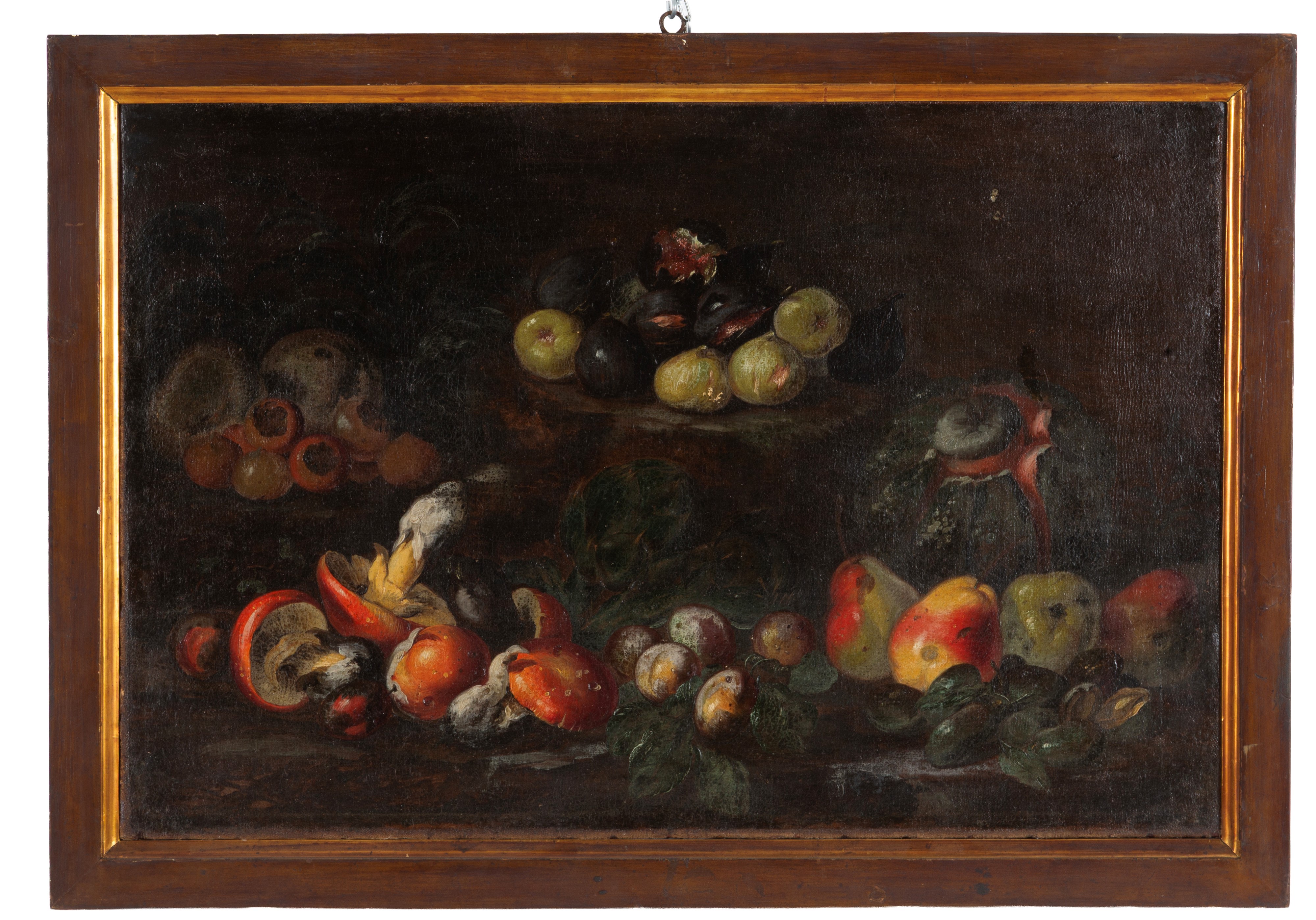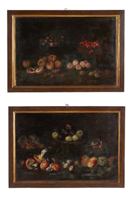 Pair of oil on canvas paintings depicting "STILL LIFE WITH FRUIT OUTDOORS". In lacquered wood frames. Already re-stretched and re-framed. With attribution certificate by Dr. Gianluca Bocchi.