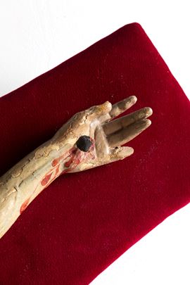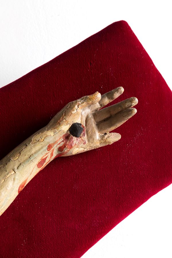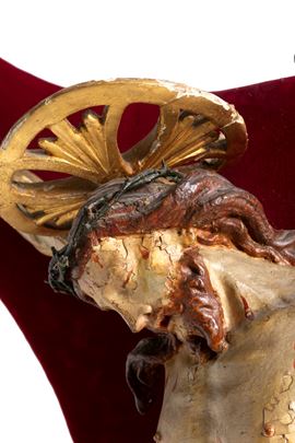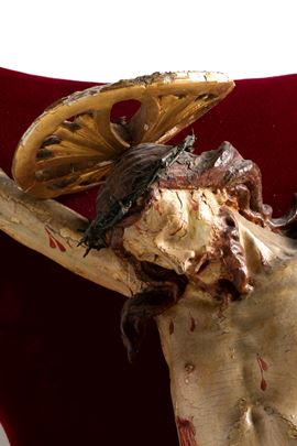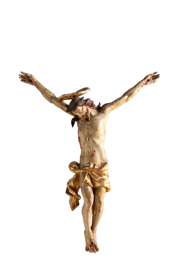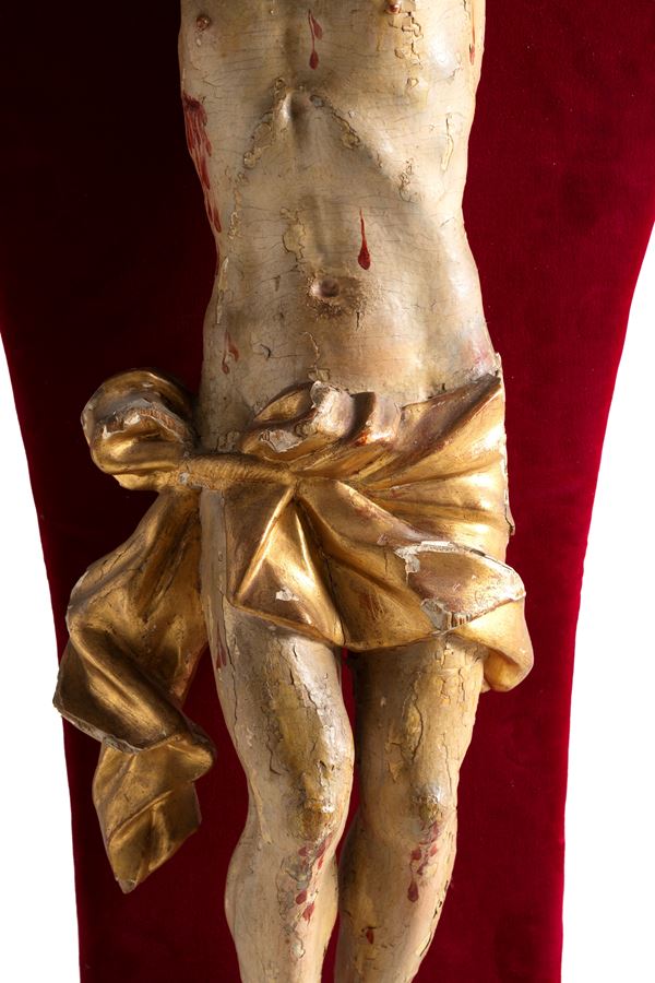 Lacquered and gilded wooden sculpture depicting "CRUCIFIED CHRIST." 18th century. Defects and missing parts.