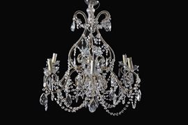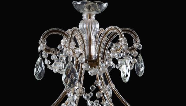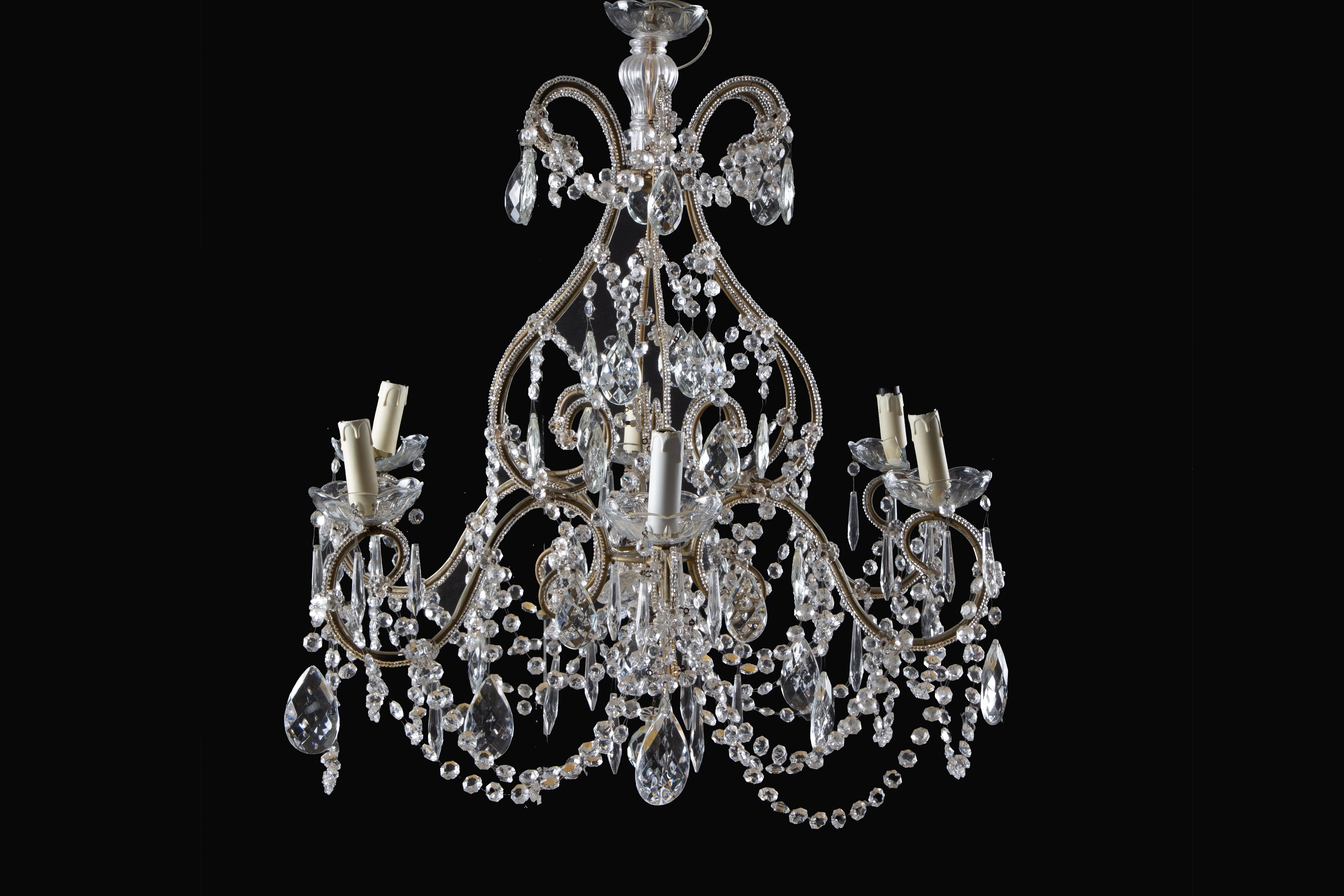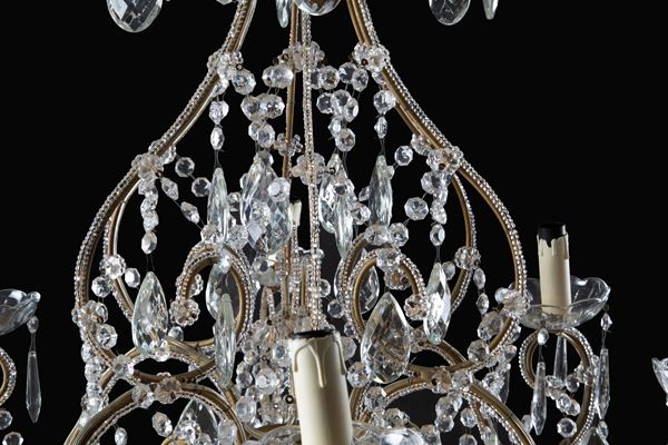 Six-light chandelier in gilded metal with glass beads and drop pendants. 20th century. Minor defects.