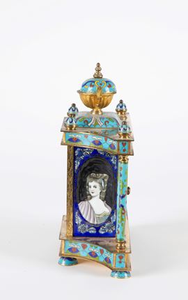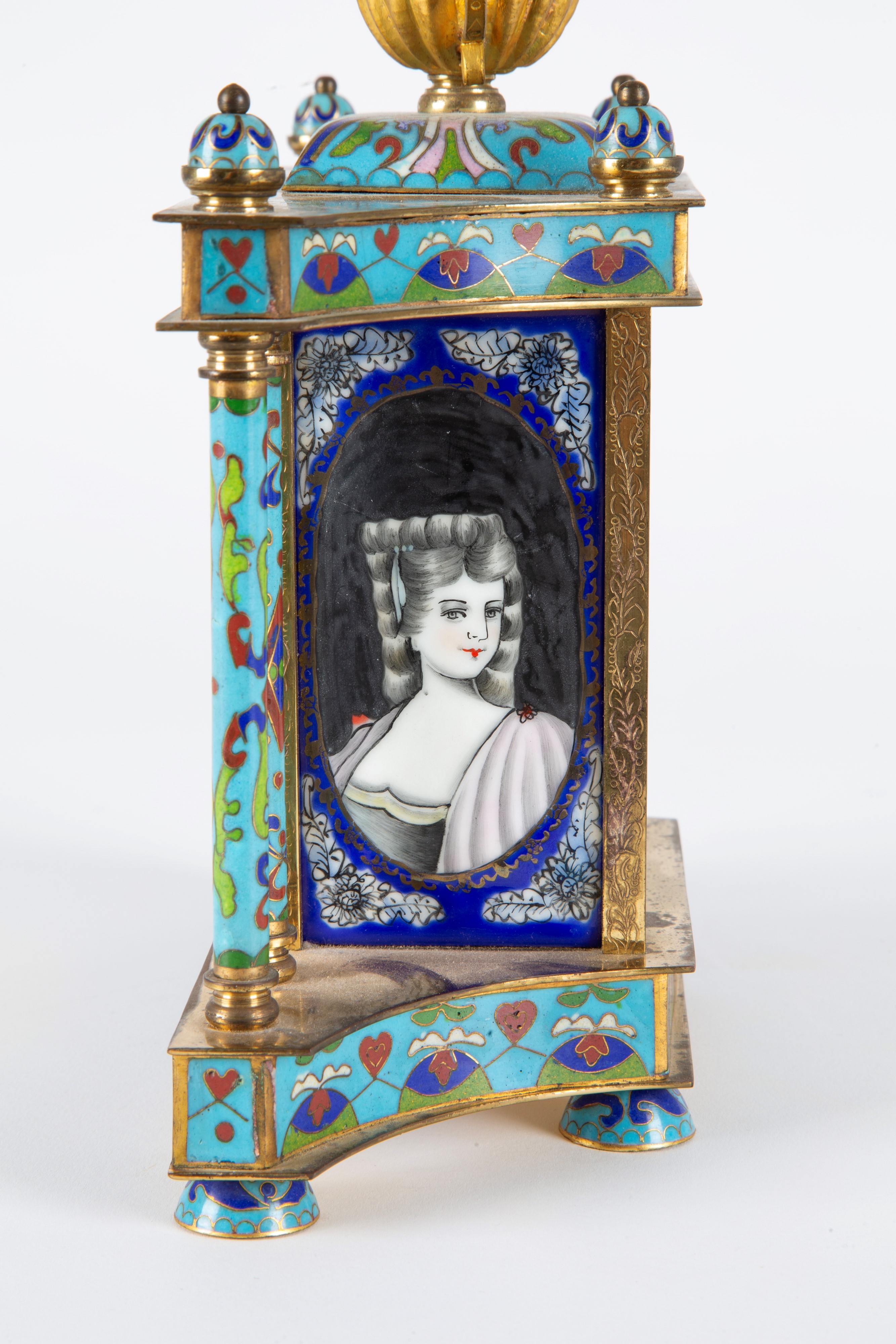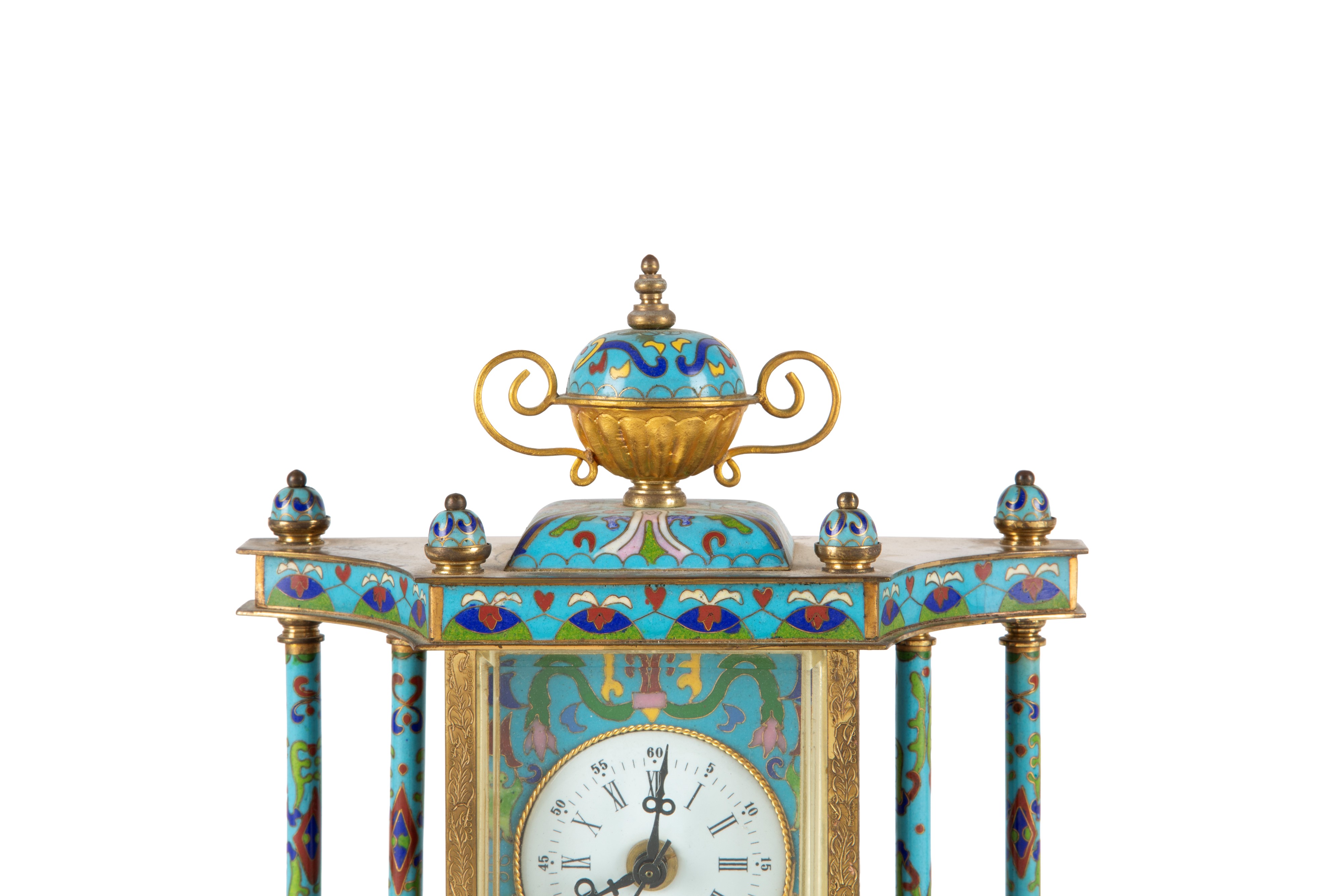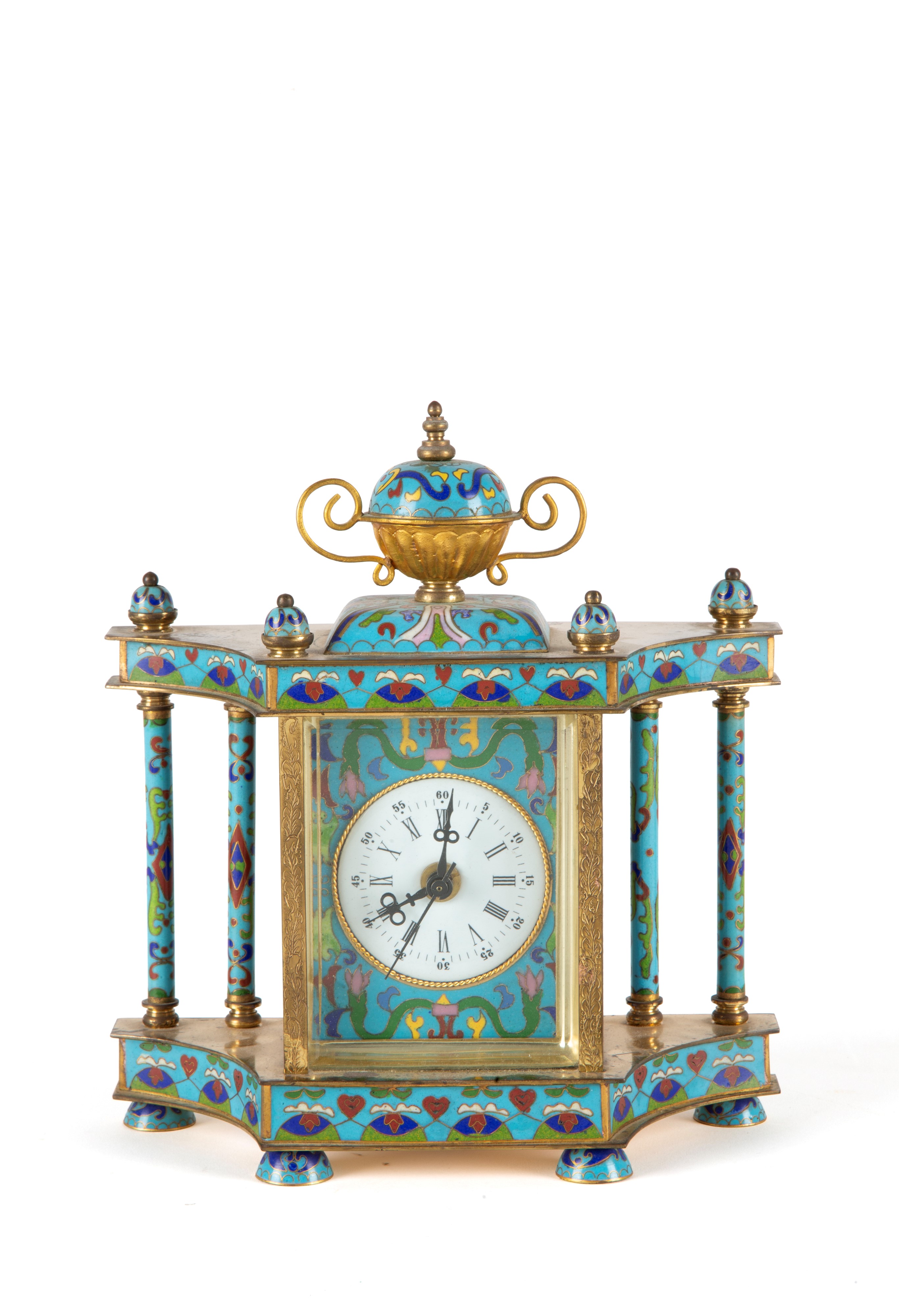 Small cloisonné table clock. White enamel dial with Roman and Arabic numerals. 20th century. Minor defects.