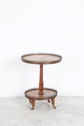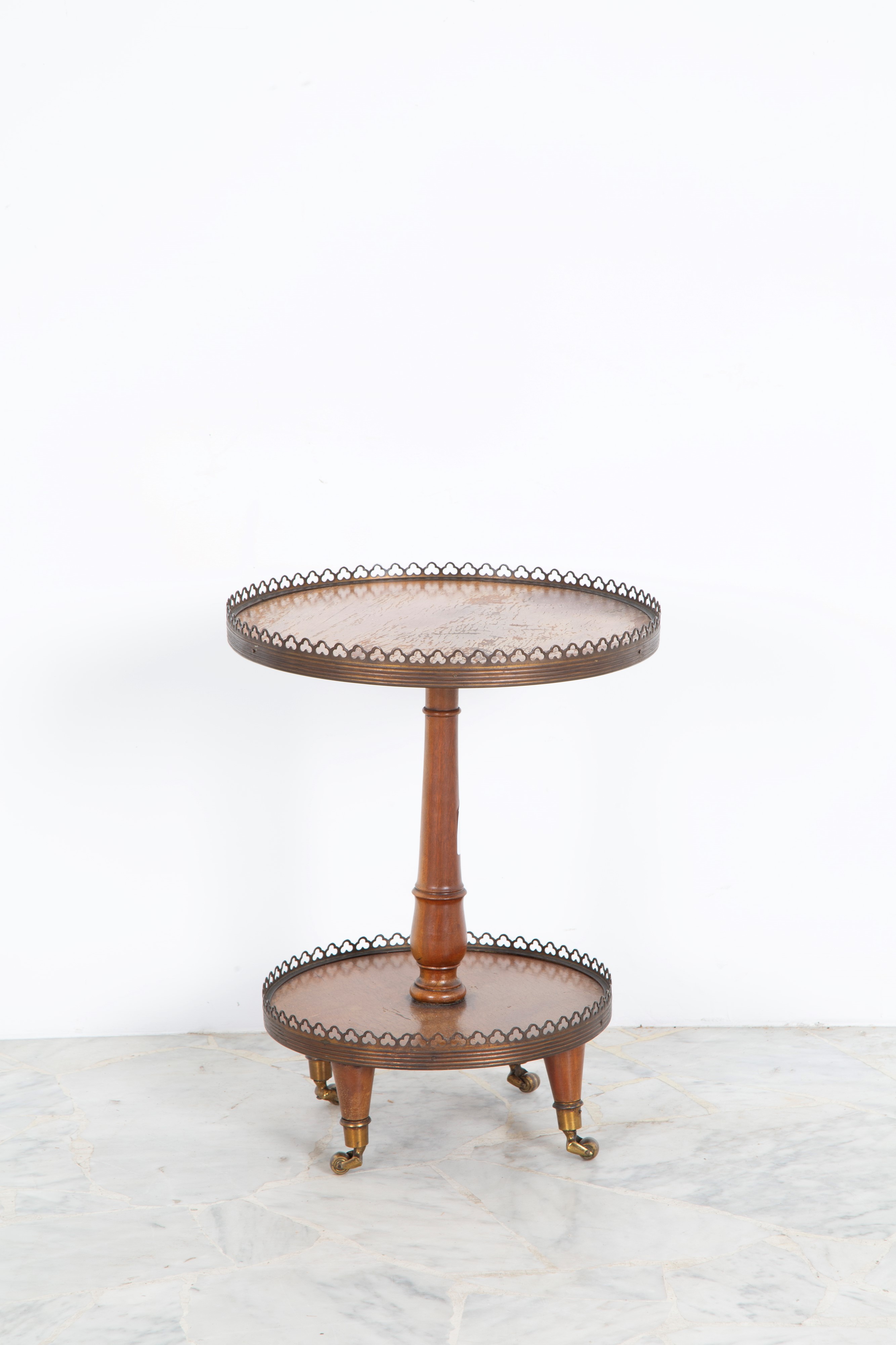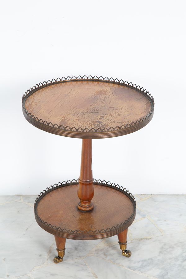 Small two-tier wooden etagere with wheels and bronze fittings. 19th century. Defects.