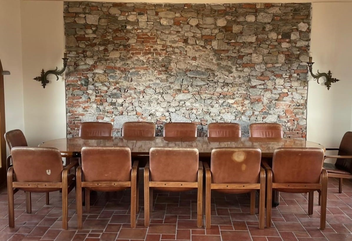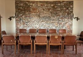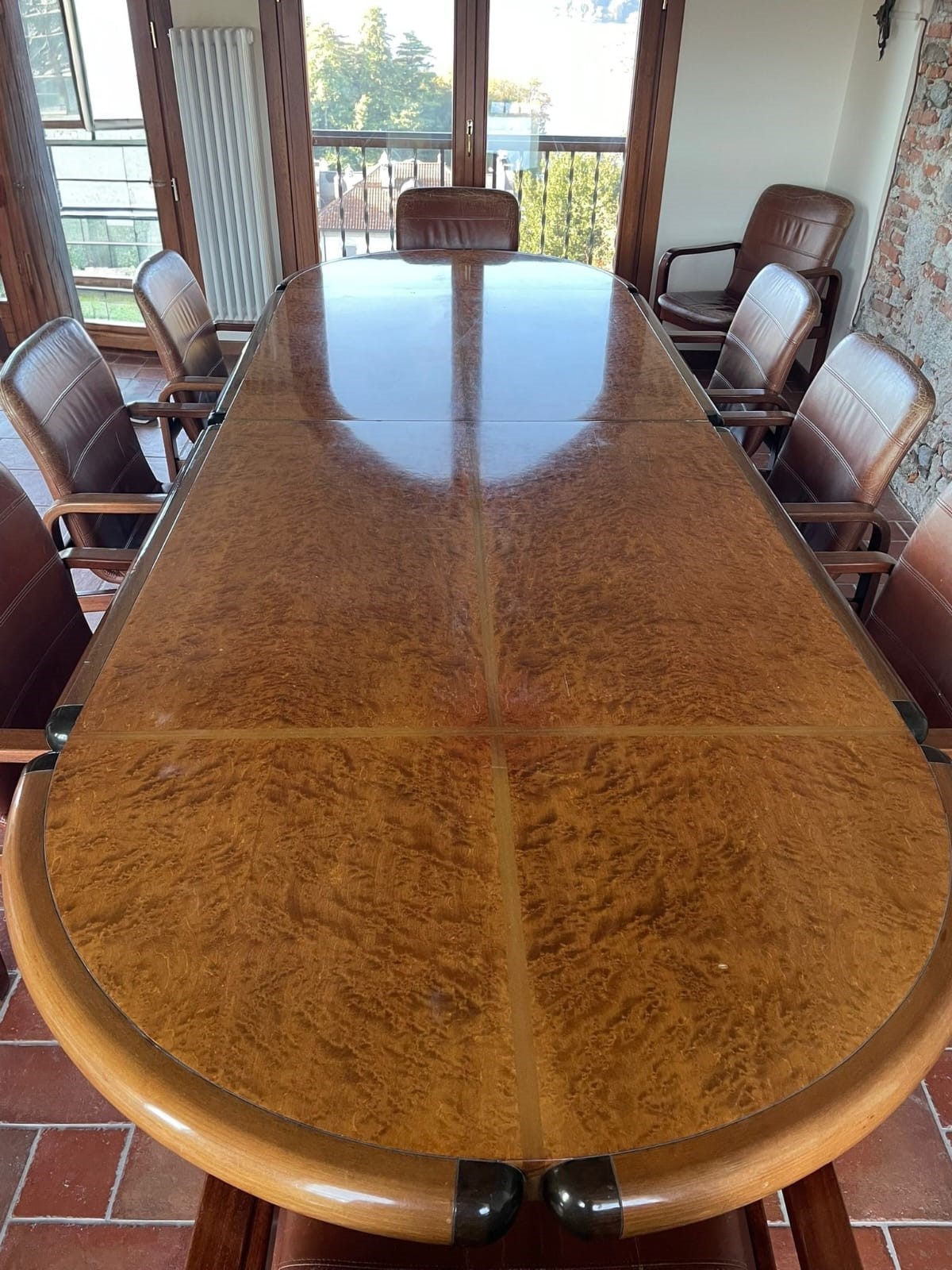 Mahogany-veneered conference table with a semi-drum band, on double-band legs joined by stringers, with twelve Indian walnut and brown leather armchairs. 20th century. Defects to the leather and light scratches to the wood.