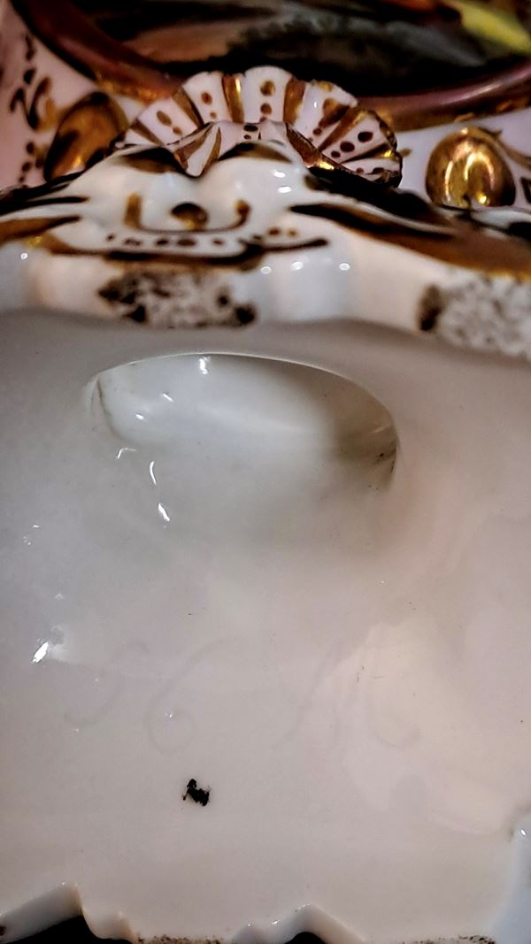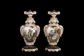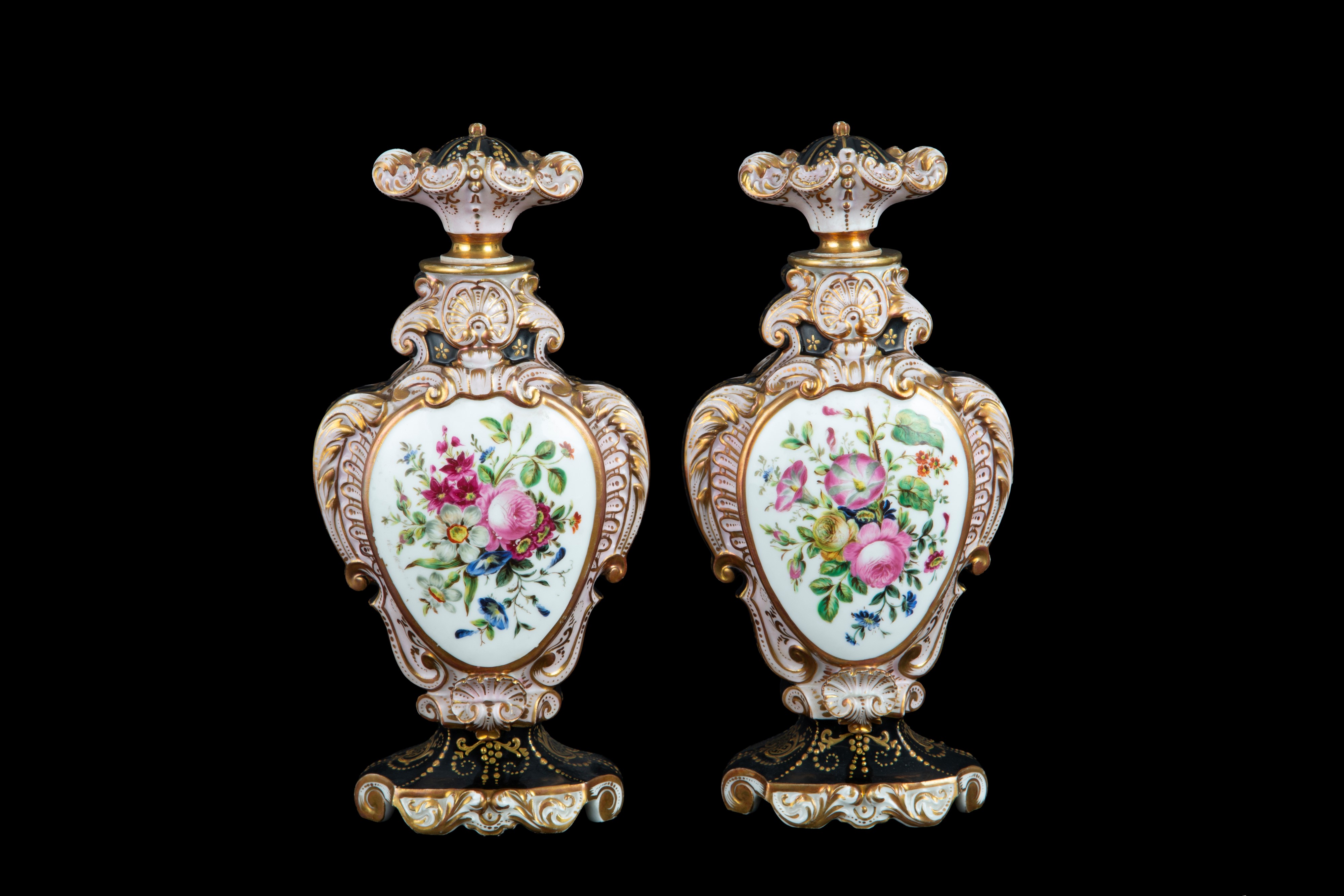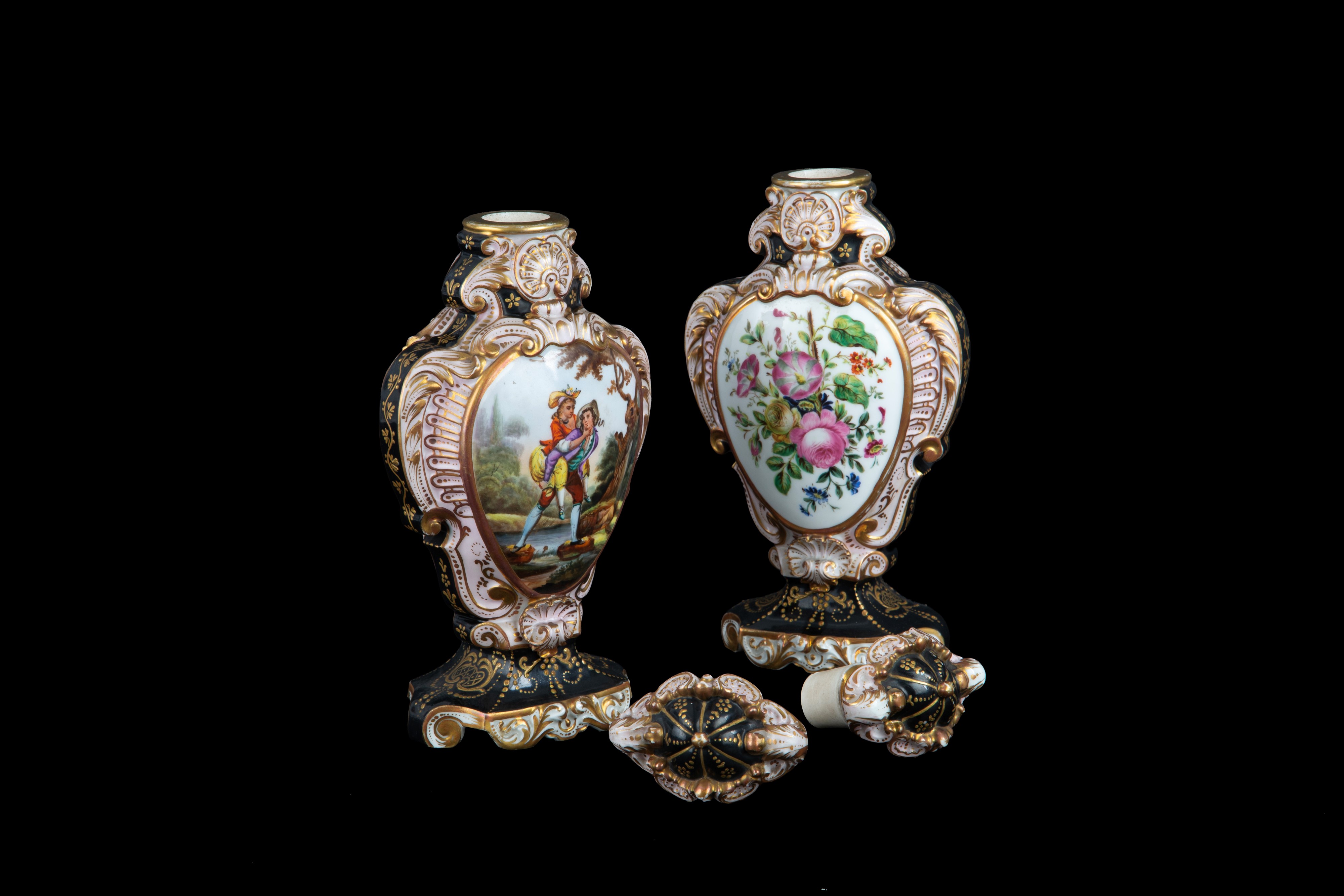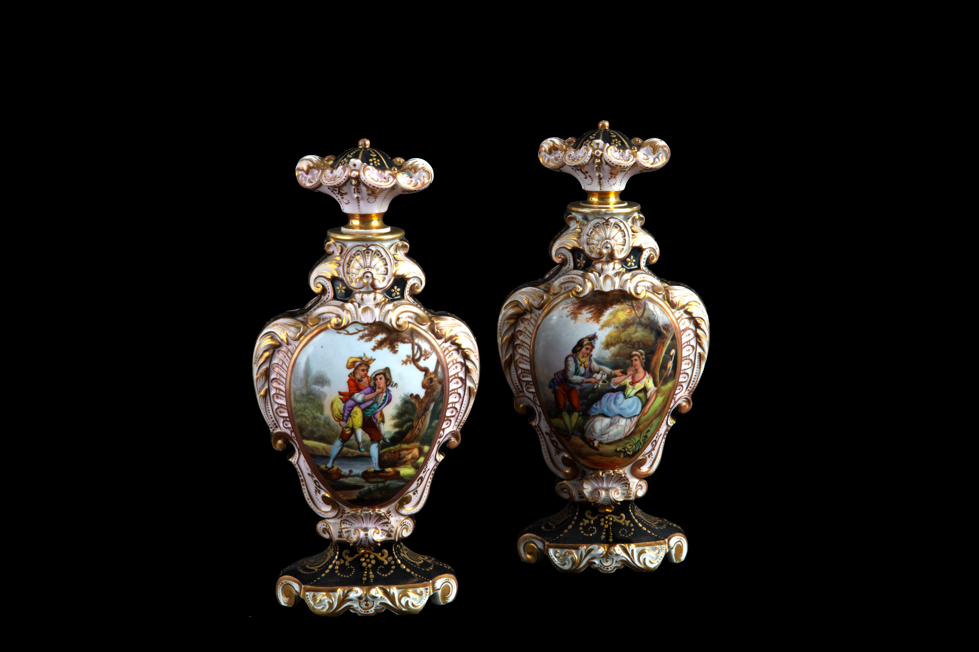 Two lidded jars in Old Paris polychrome porcelain with romantic scenes and flowers within reserves. 19th century.