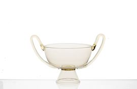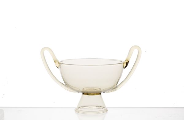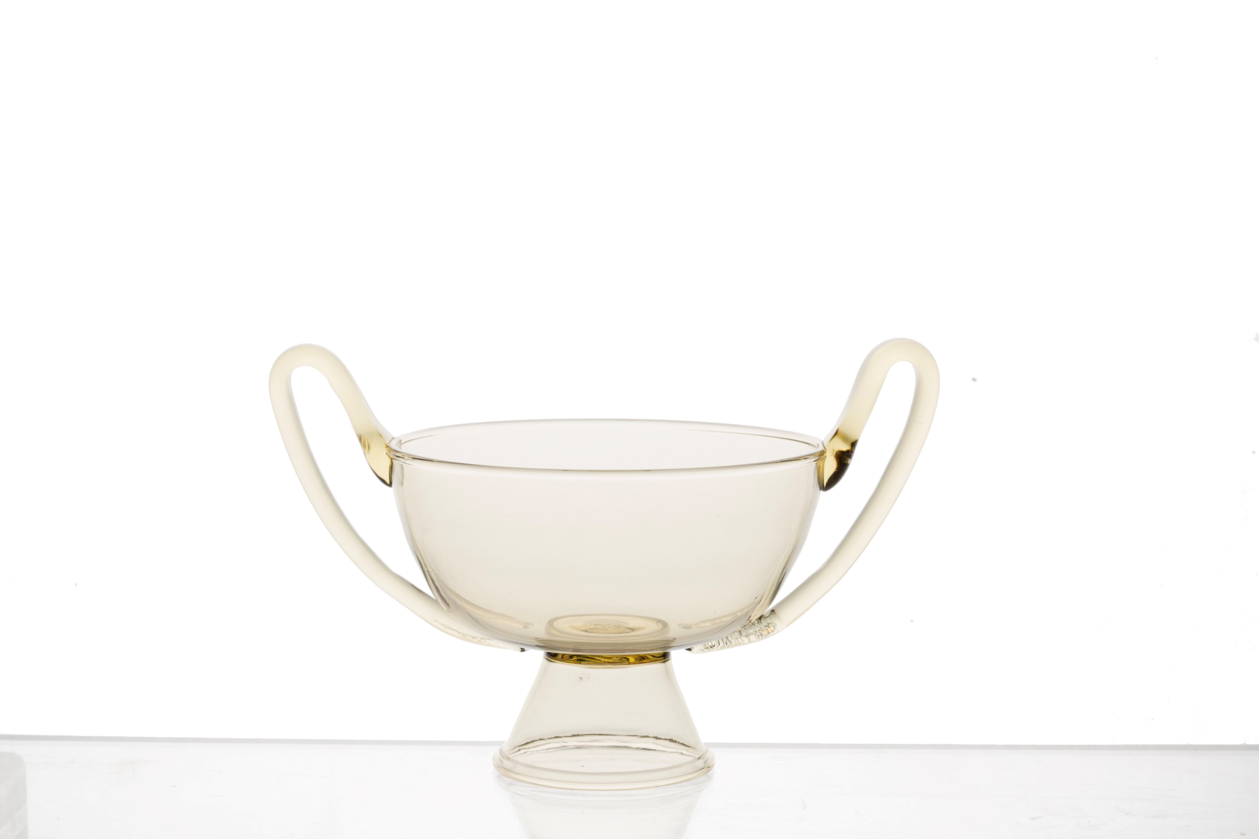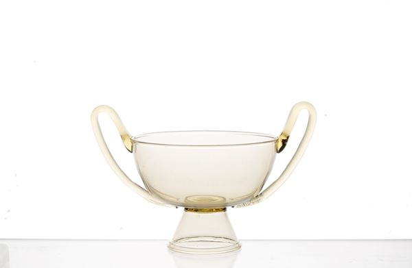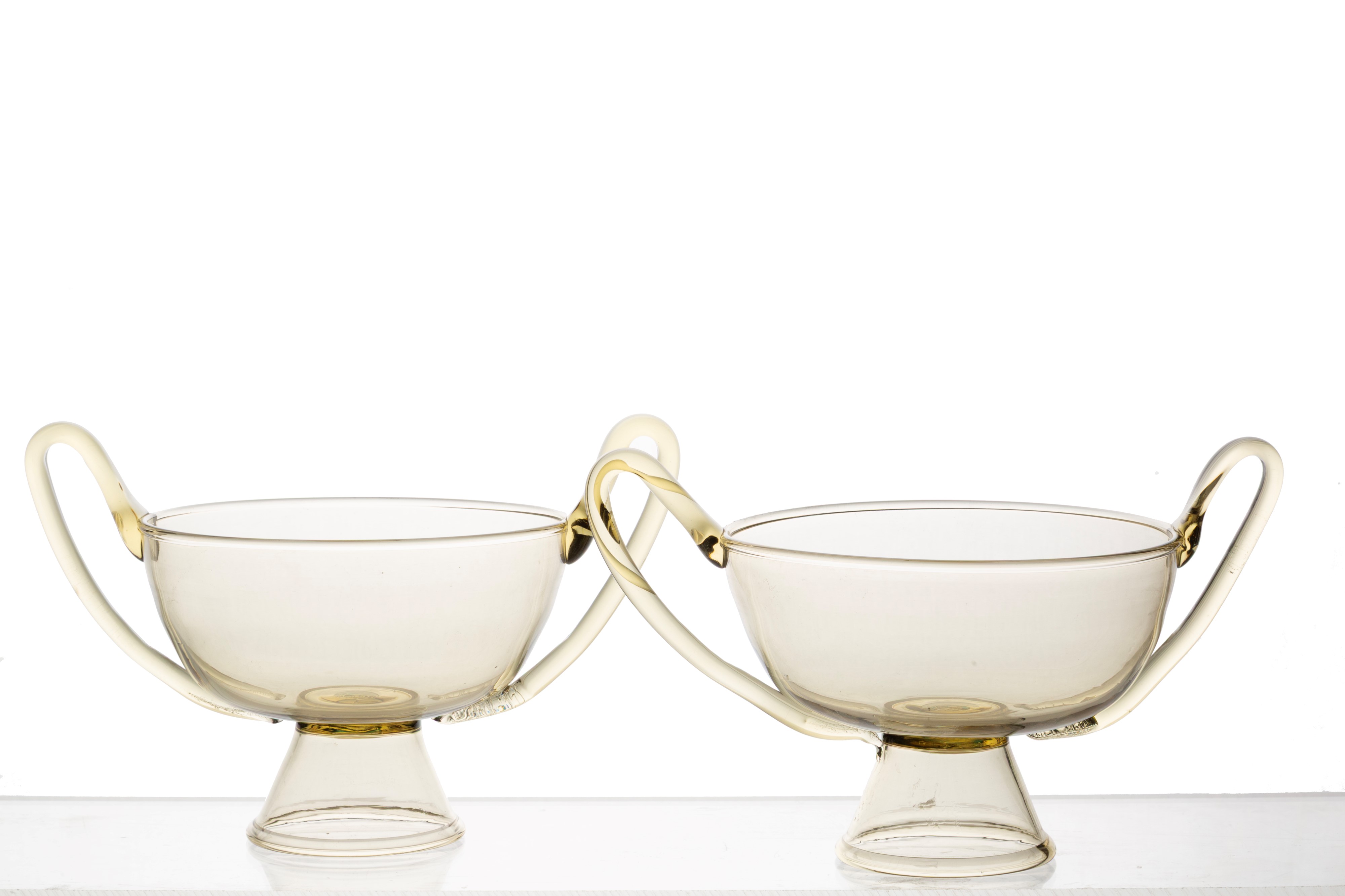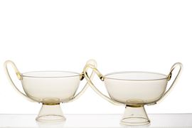 Two two-handled bowls in straw-yellow blown Murano glass. Acid-etched signature: MVM CAPPELLIN, Murano. Firing defect. Published in Marino Barovier and Carlo Sonego (eds.), Vetreria MVM Cappellin e il Giovane Carlo Scarpa, 1925–1931, Skira 2018, p. 100.